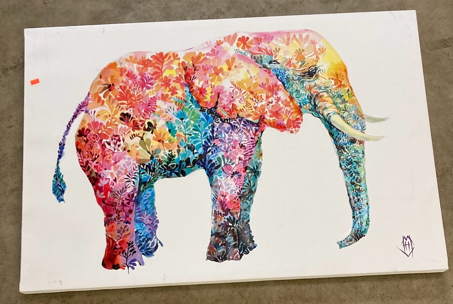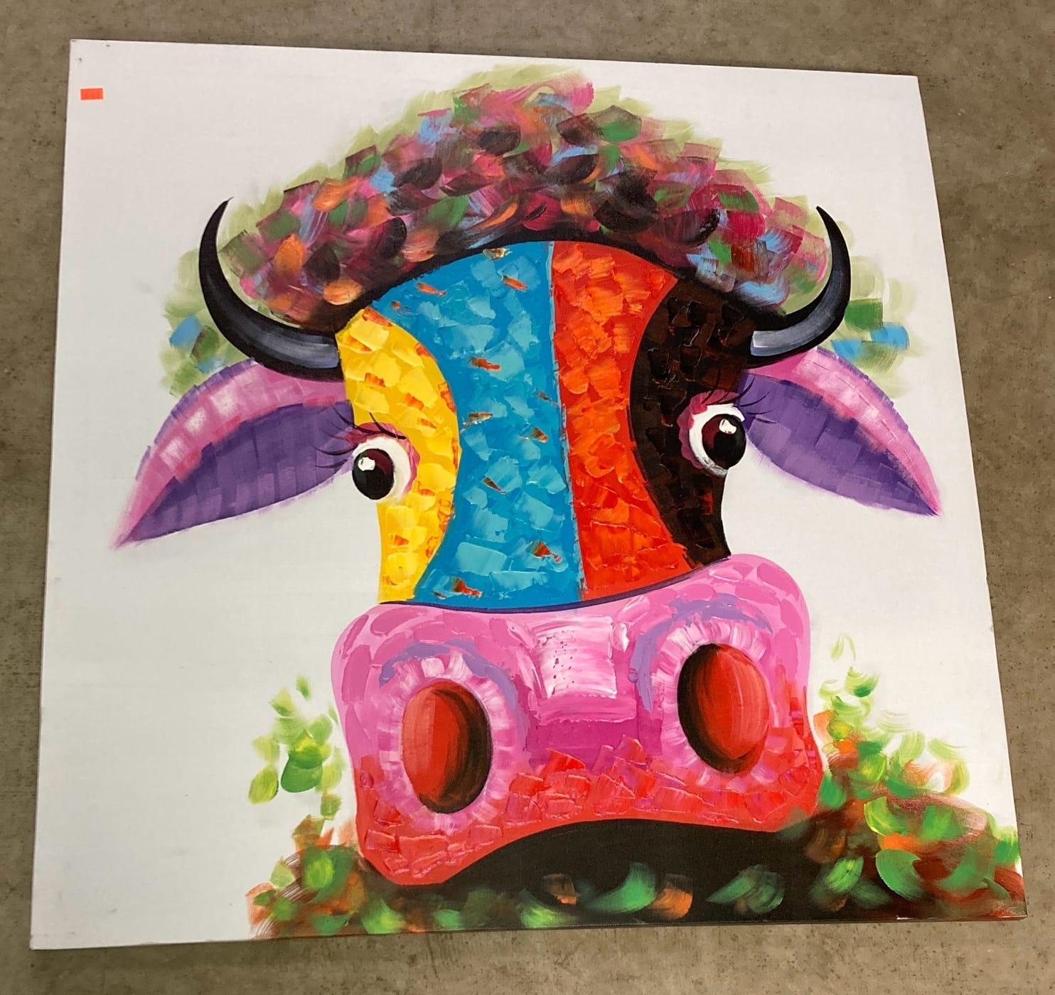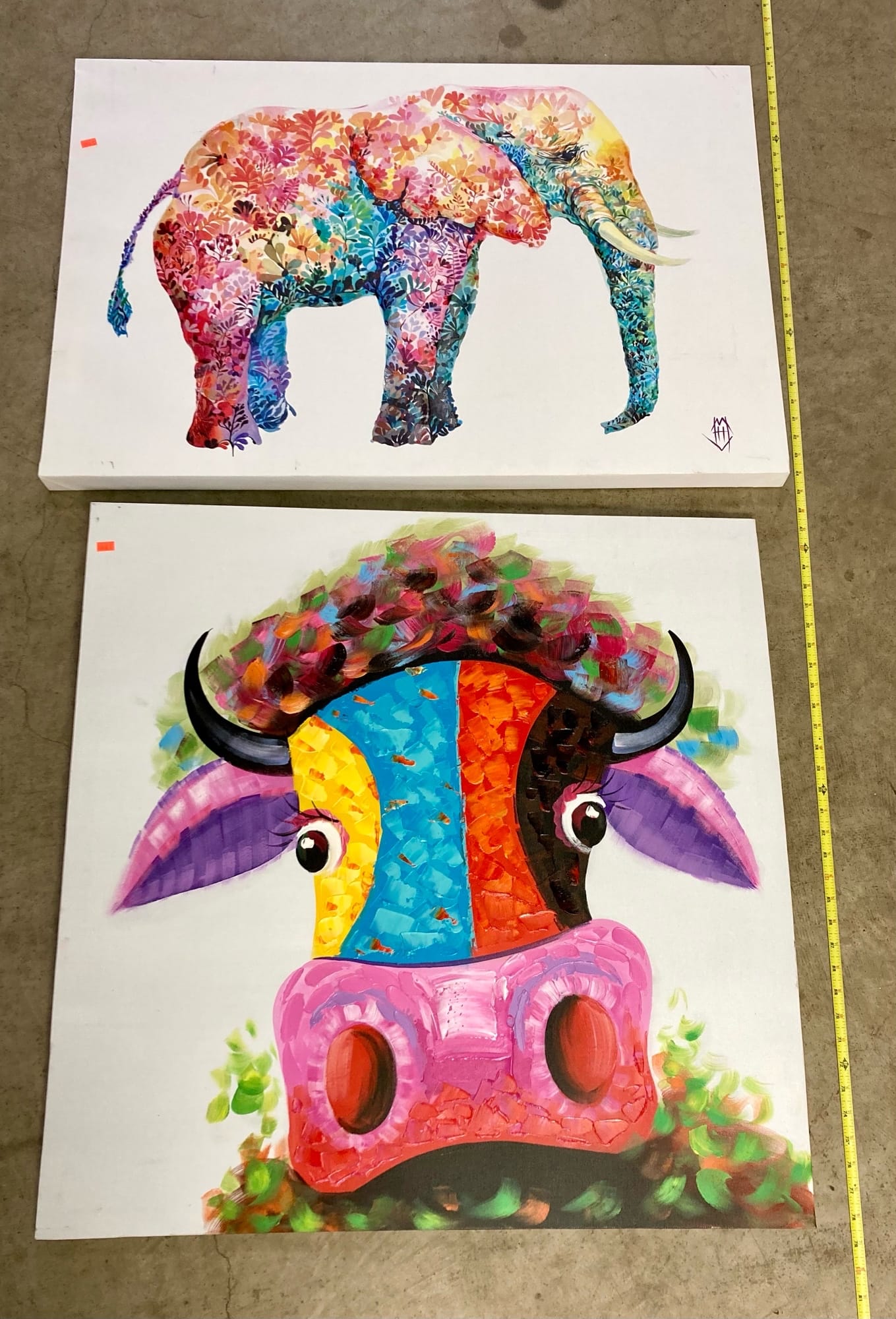 2416 Elephant 36”x24” and Cow 31.5”x31” Canvas Paintings, one artist signed
