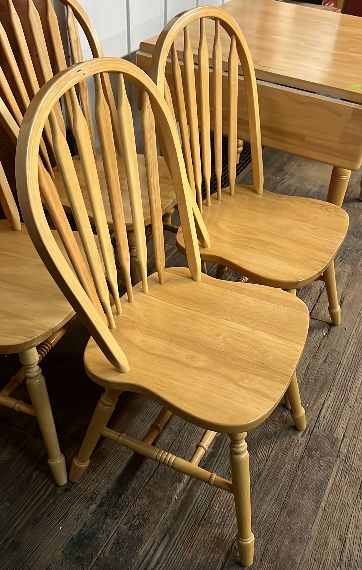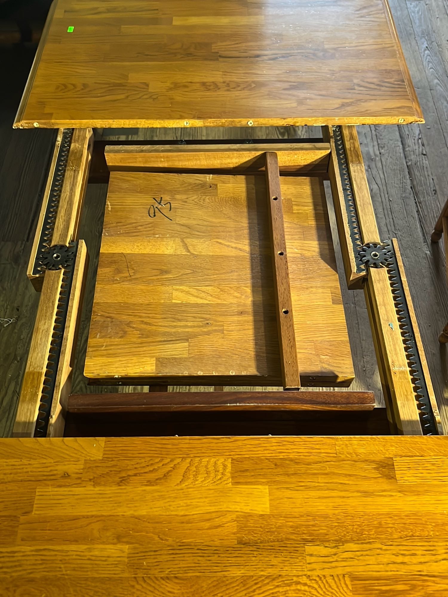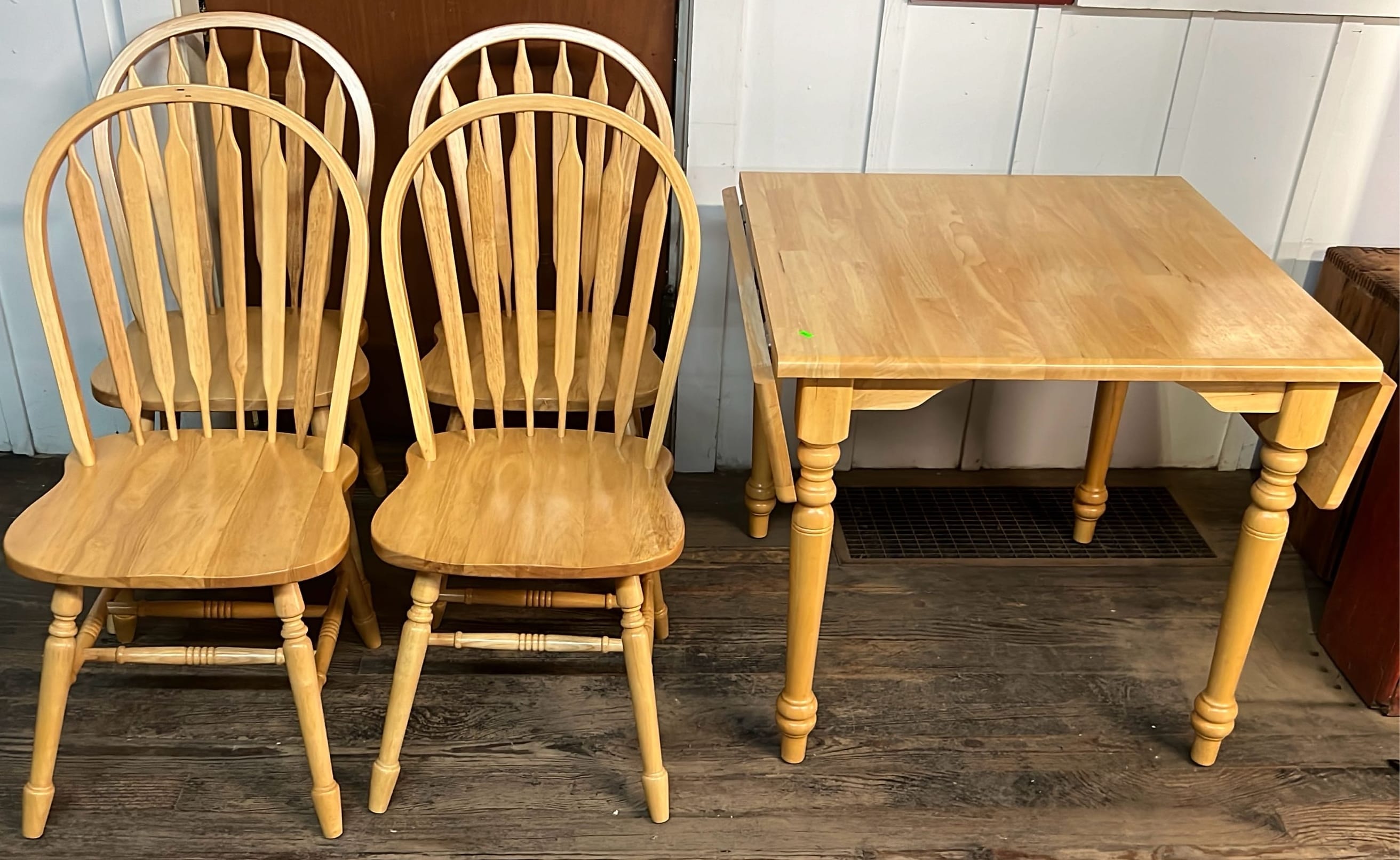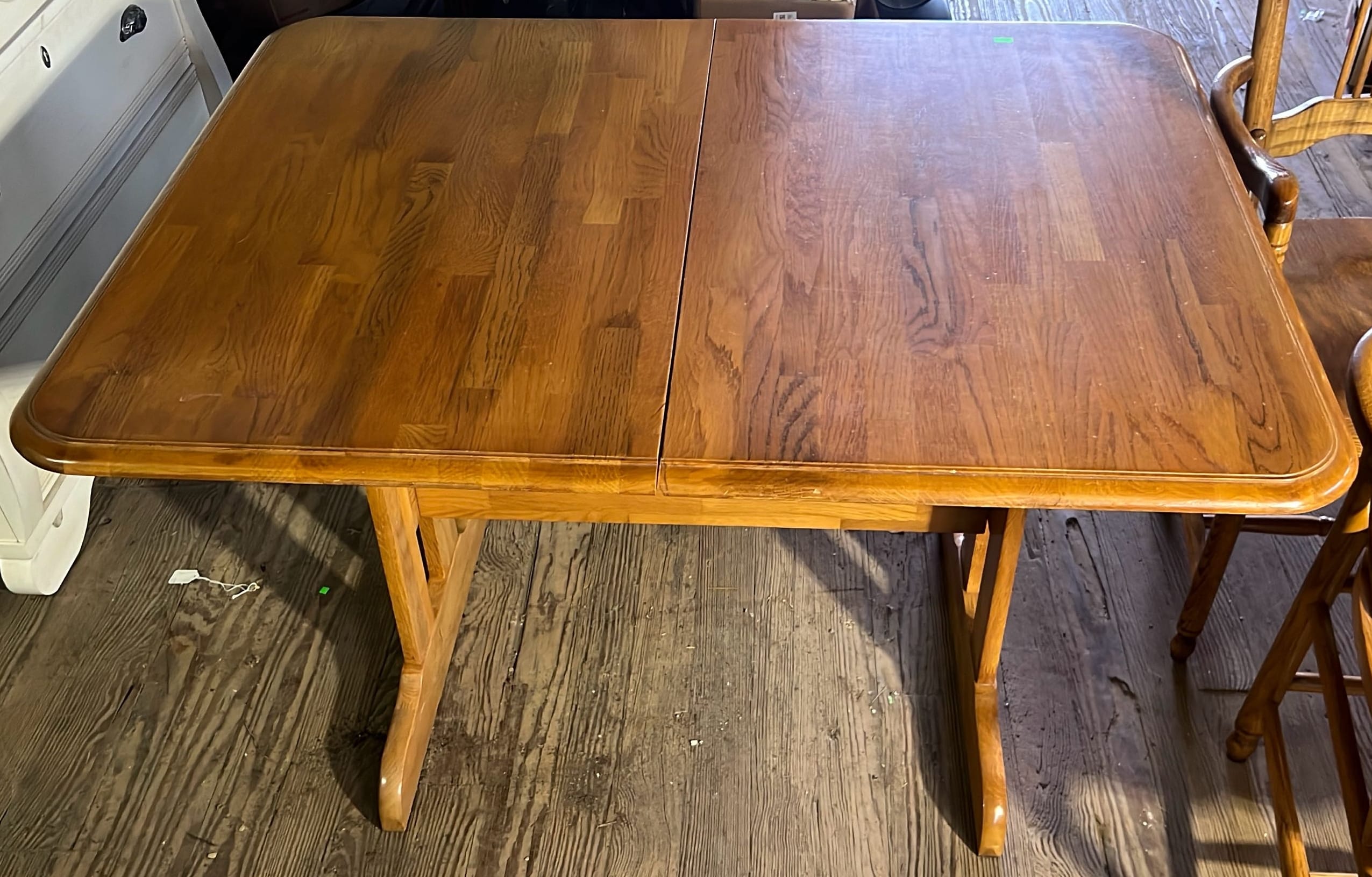 18 Oak Table with Hiding Leaf 44”x28.5”x34” & Four - Captains Dining Chairs 21”W Seat Ht. 17.5”
