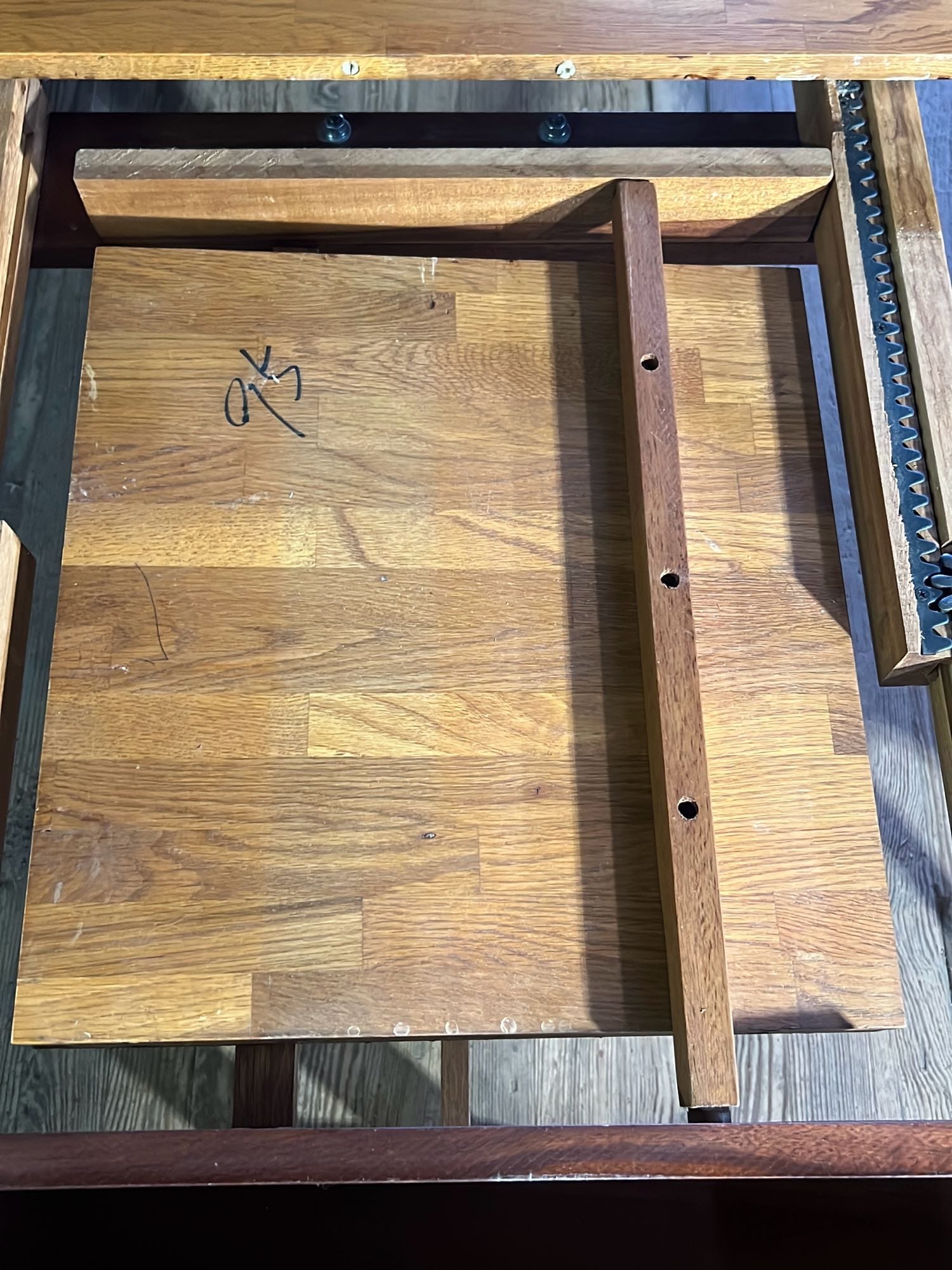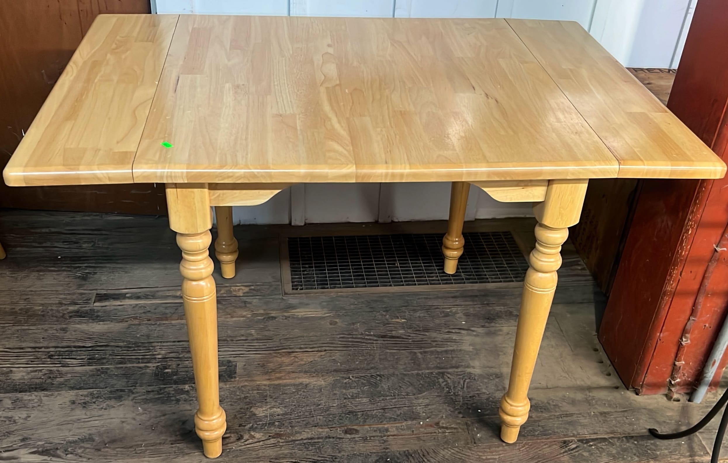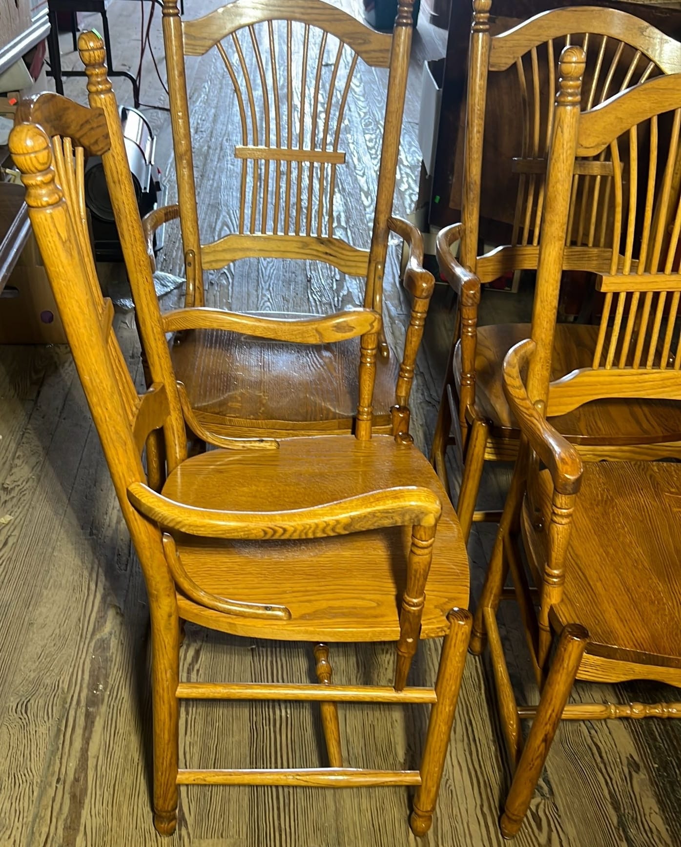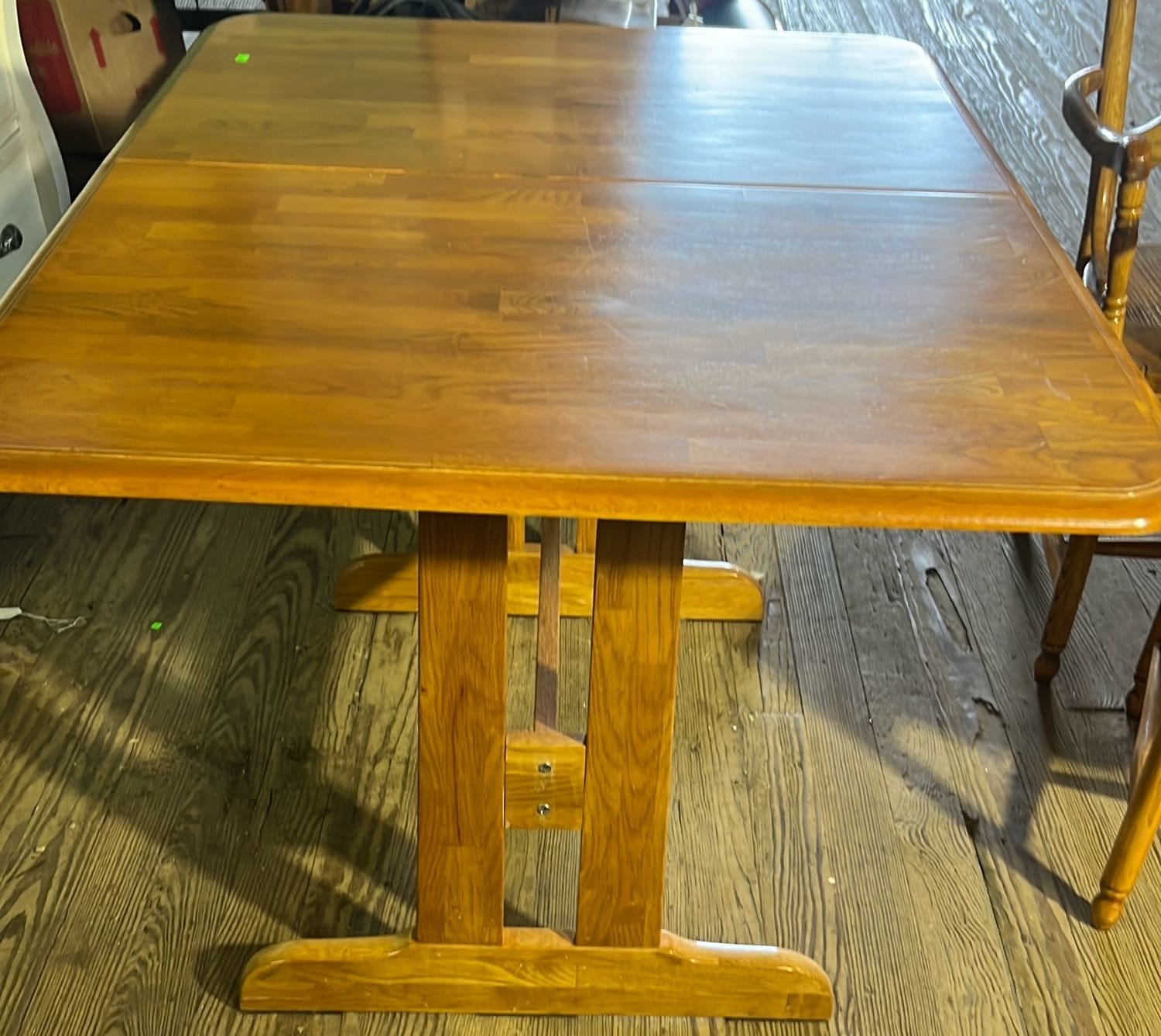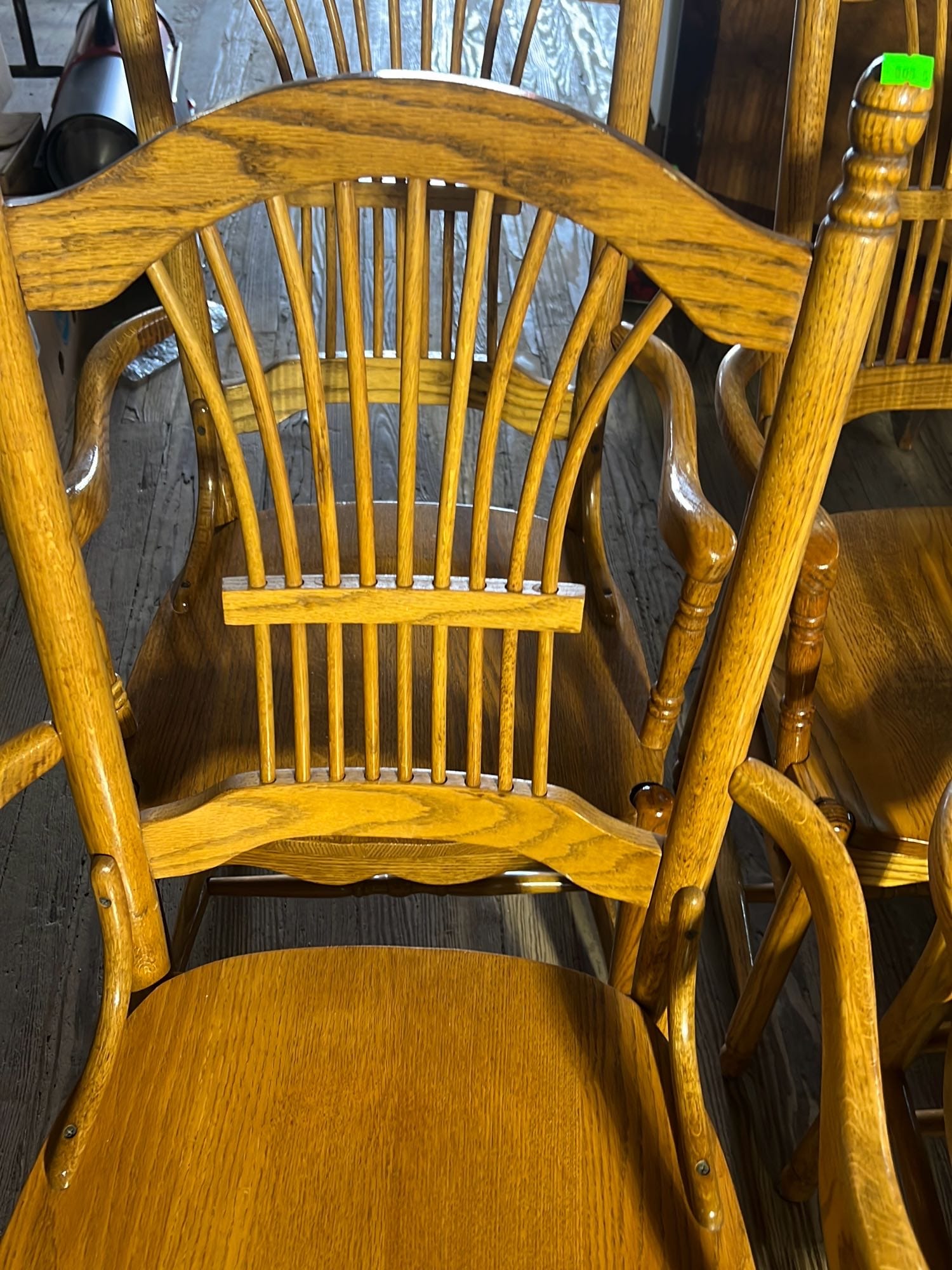 18 Oak Table with Hiding Leaf 44”x28.5”x34” & Four - Captains Dining Chairs 21”W Seat Ht. 17.5”