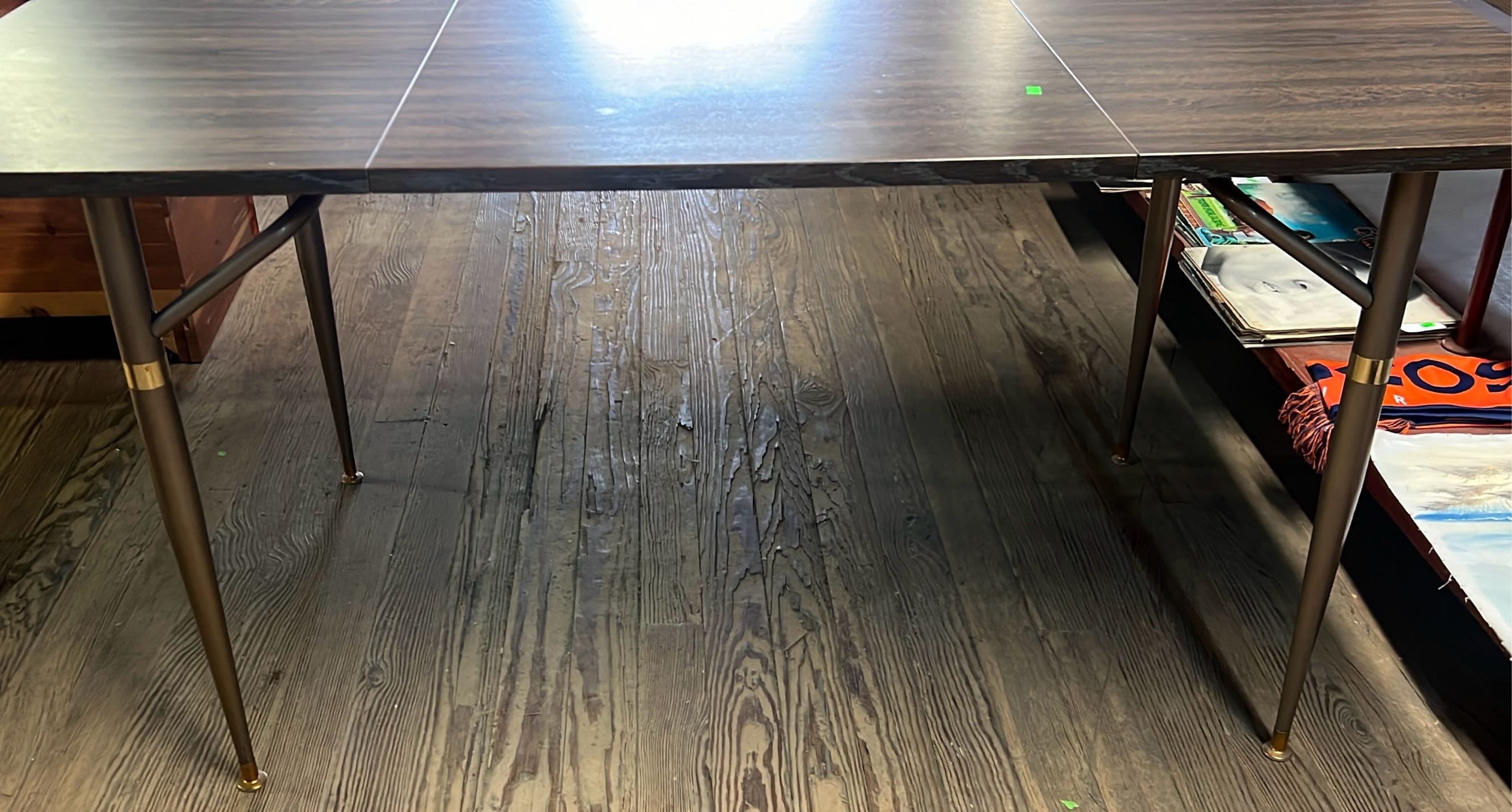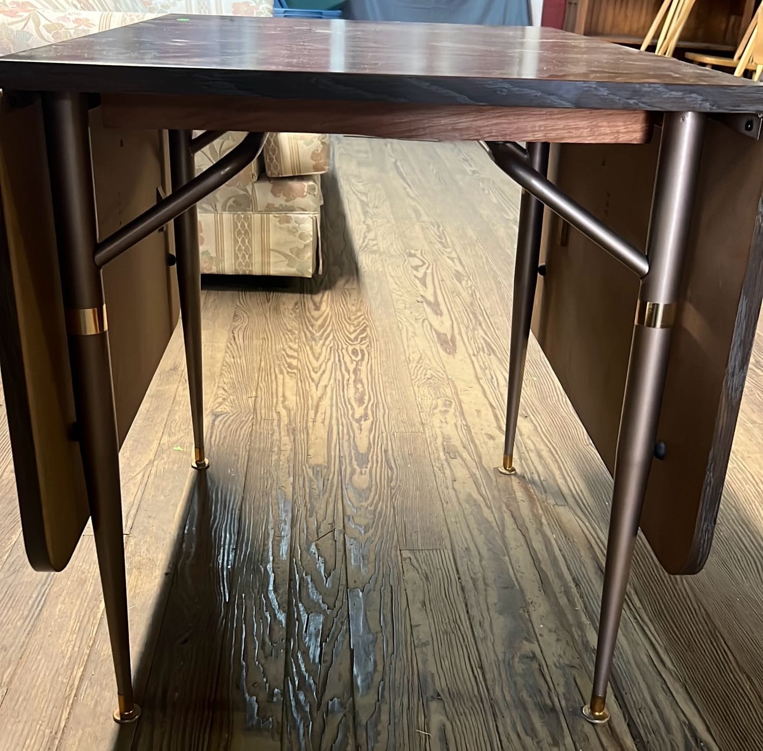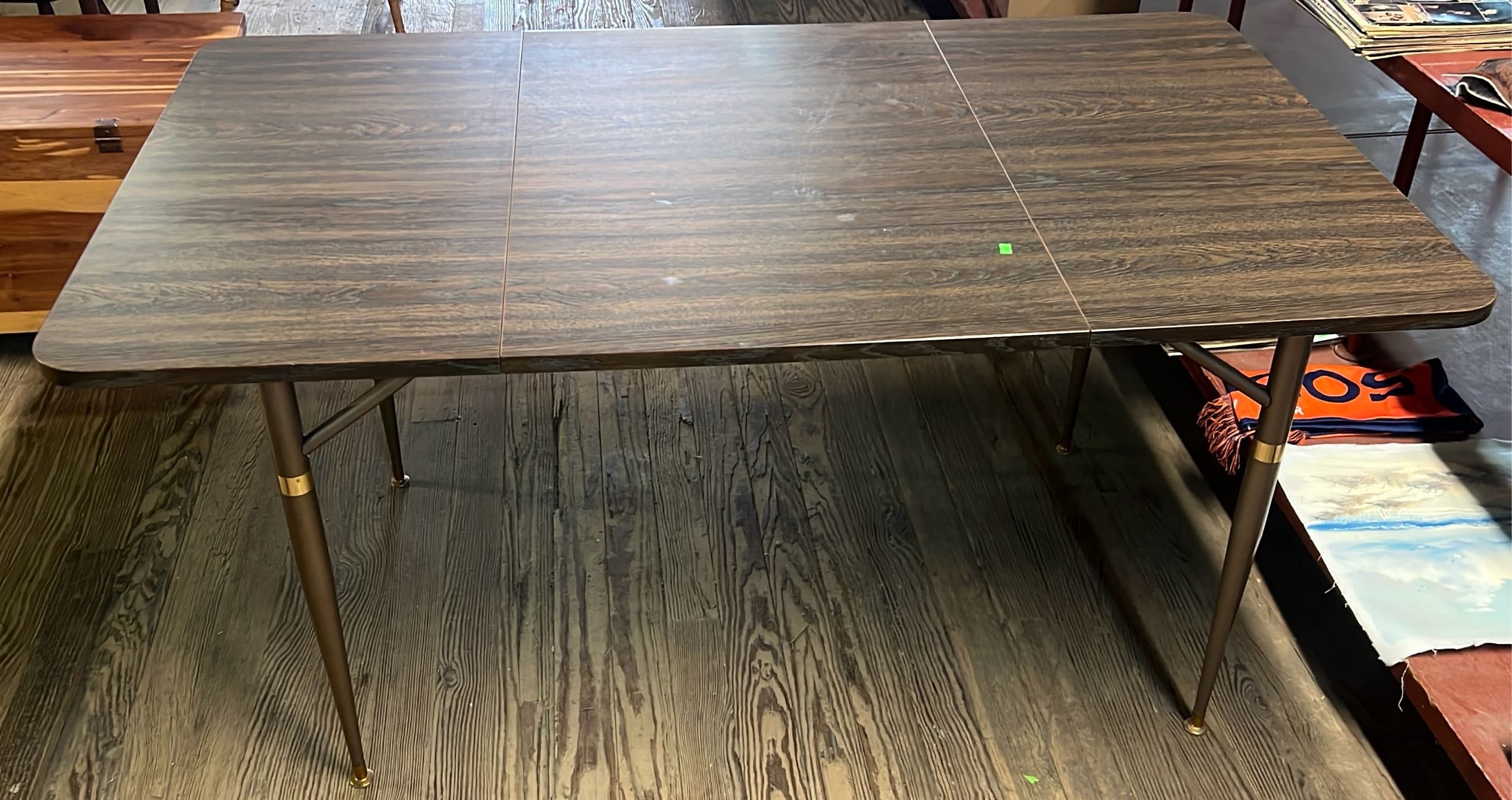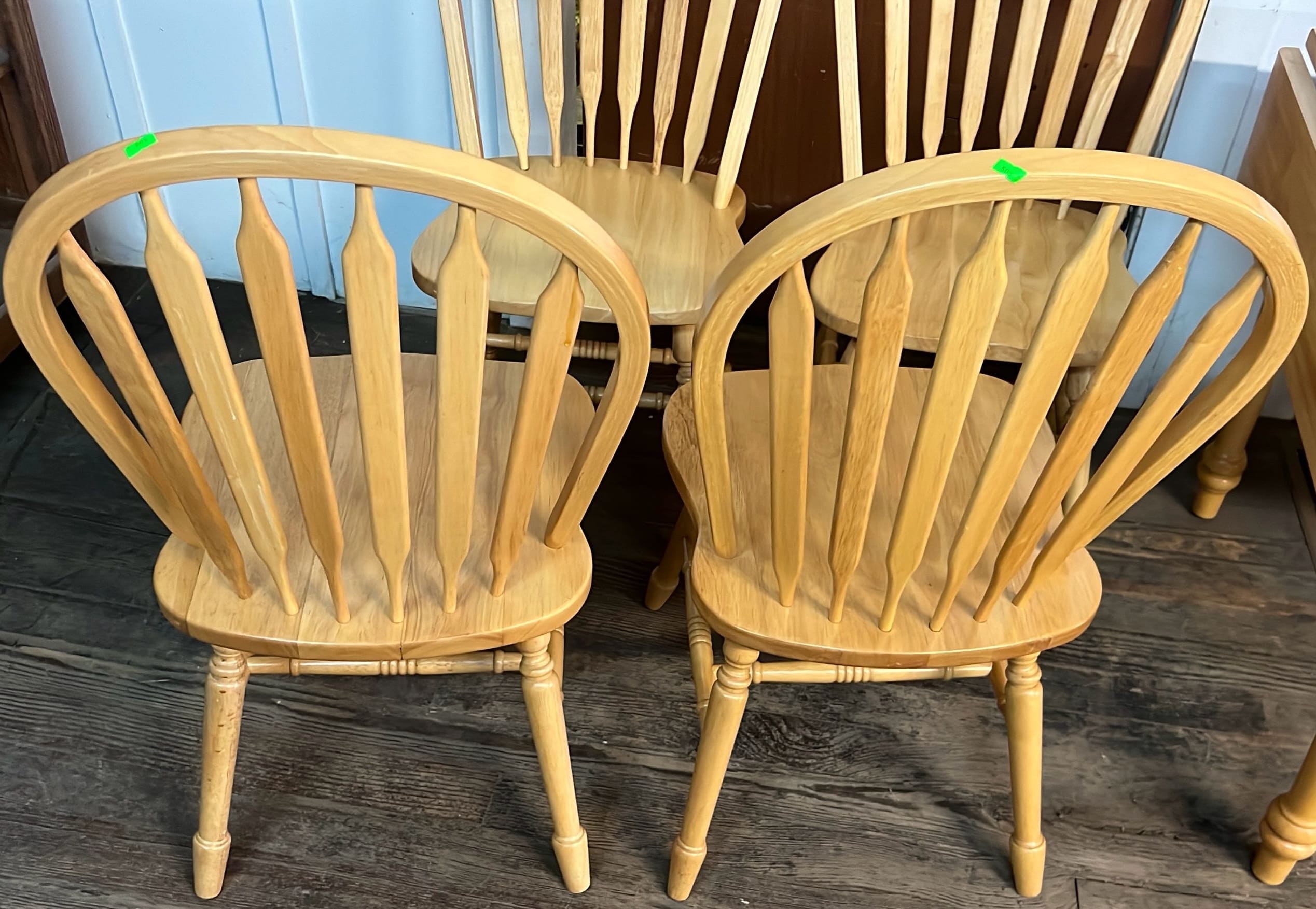 18 Oak Table with Hiding Leaf 44”x28.5”x34” & Four - Captains Dining Chairs 21”W Seat Ht. 17.5”