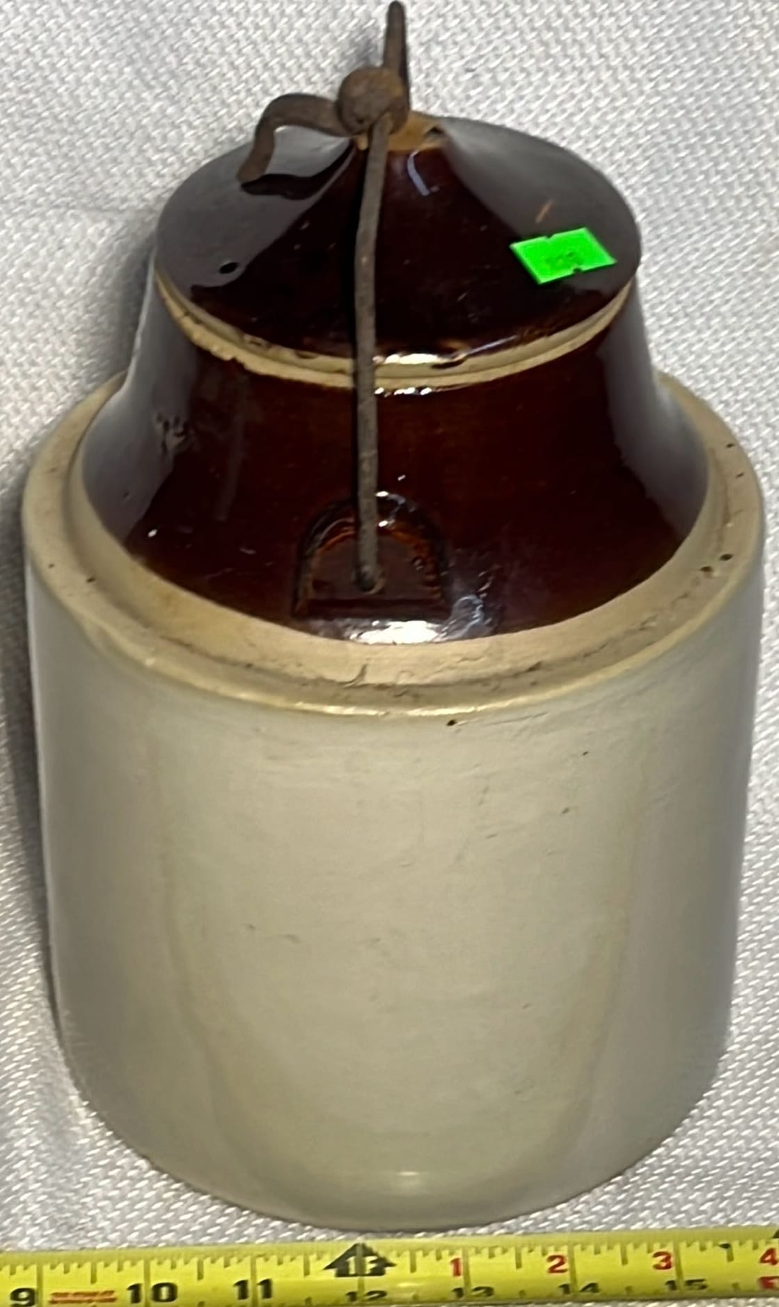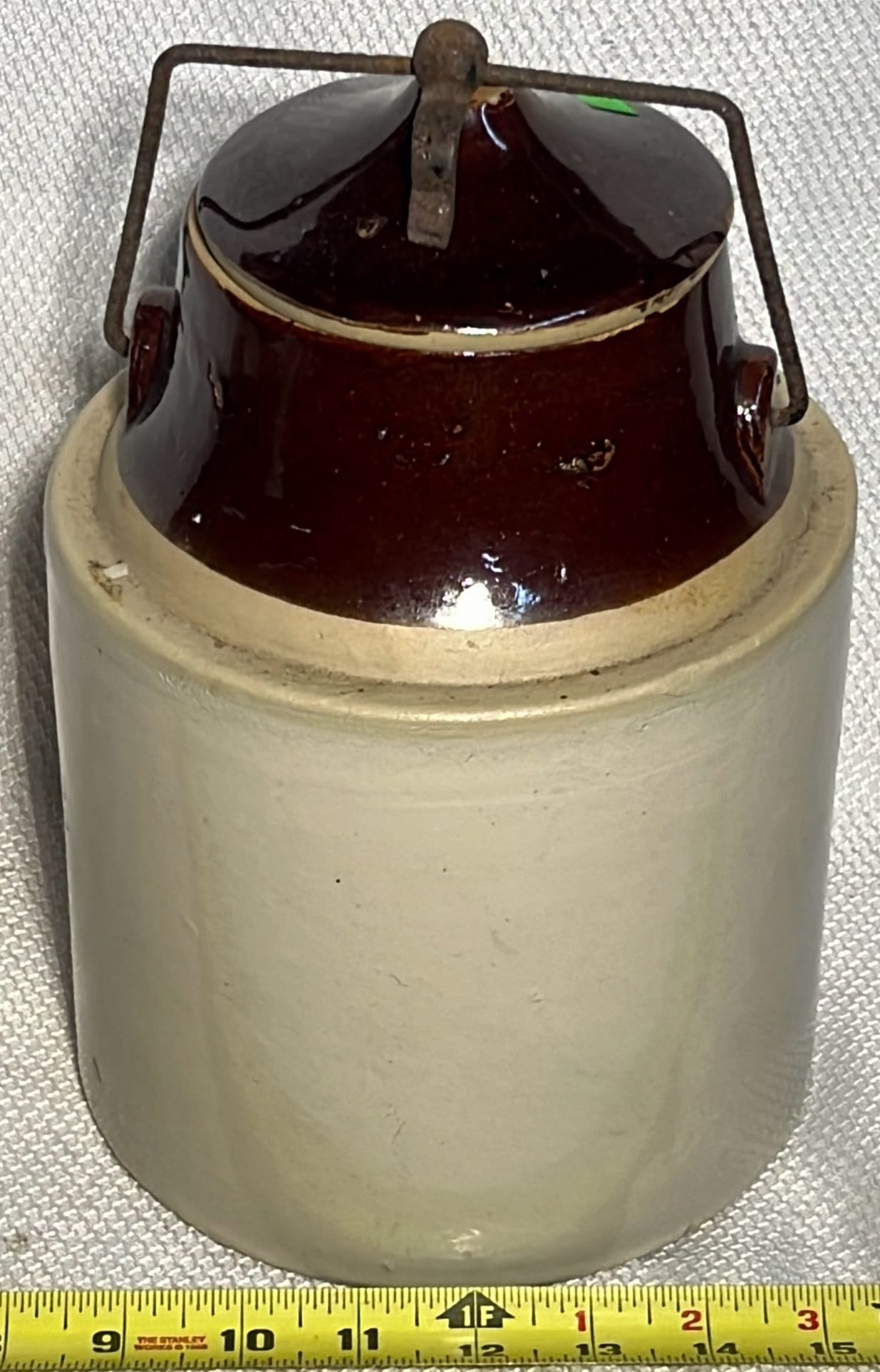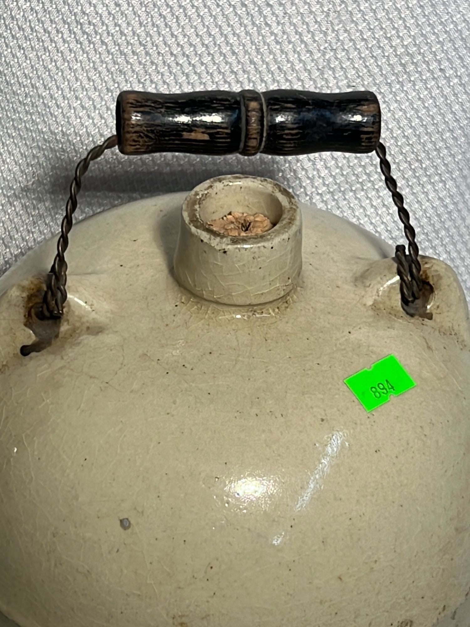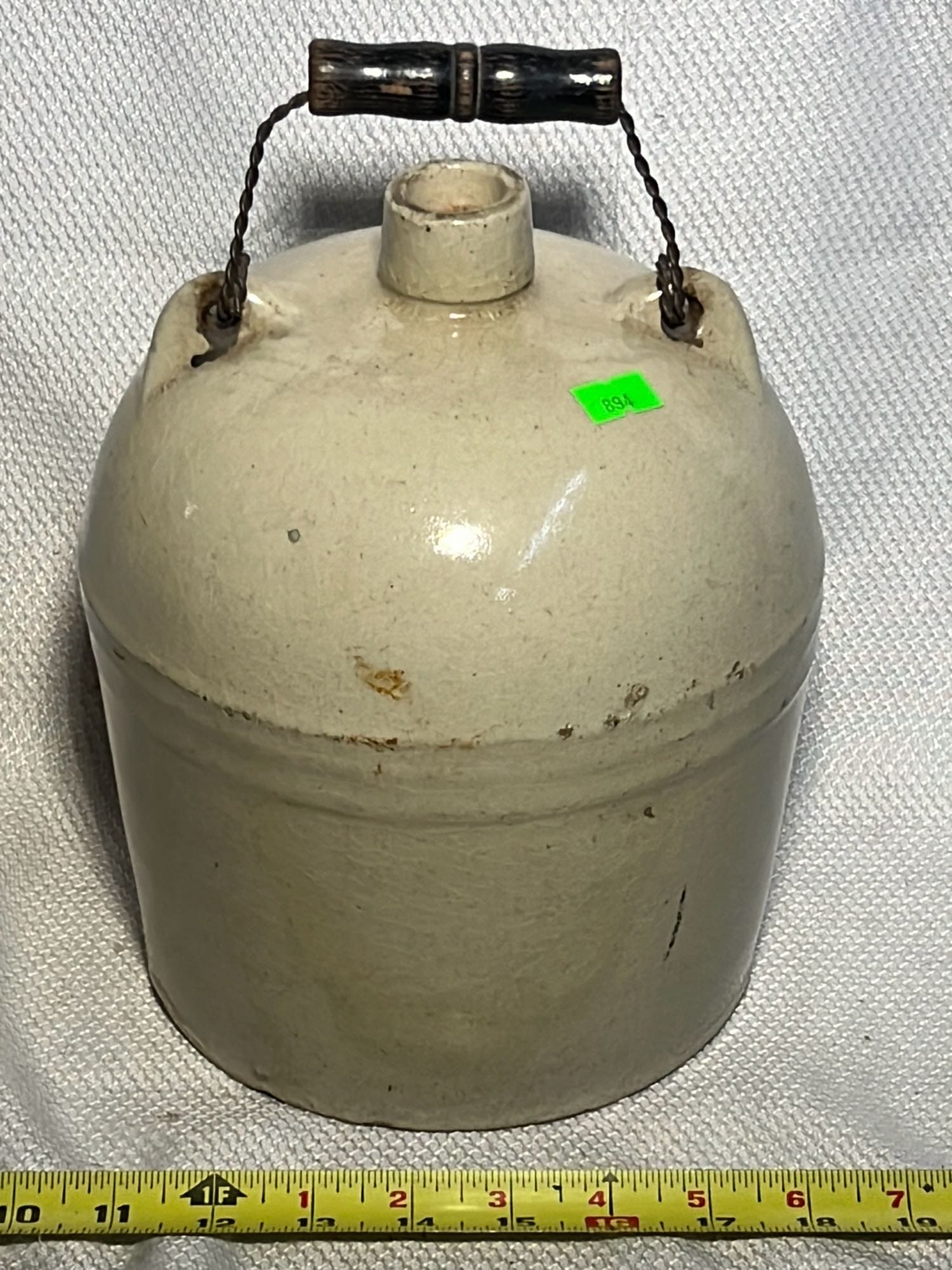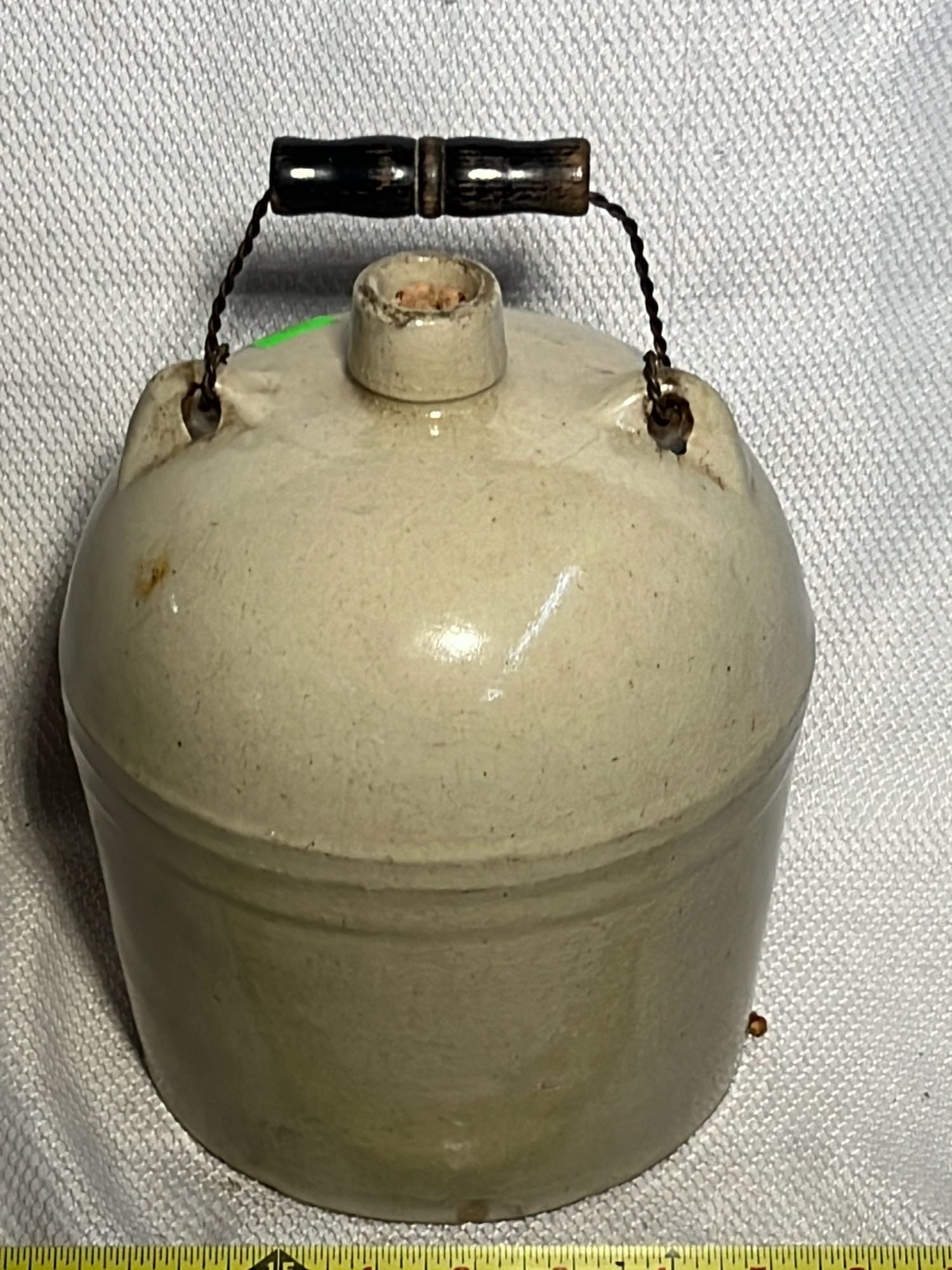 894 Crock Jug with wood Handle and wire bail 7”x9”