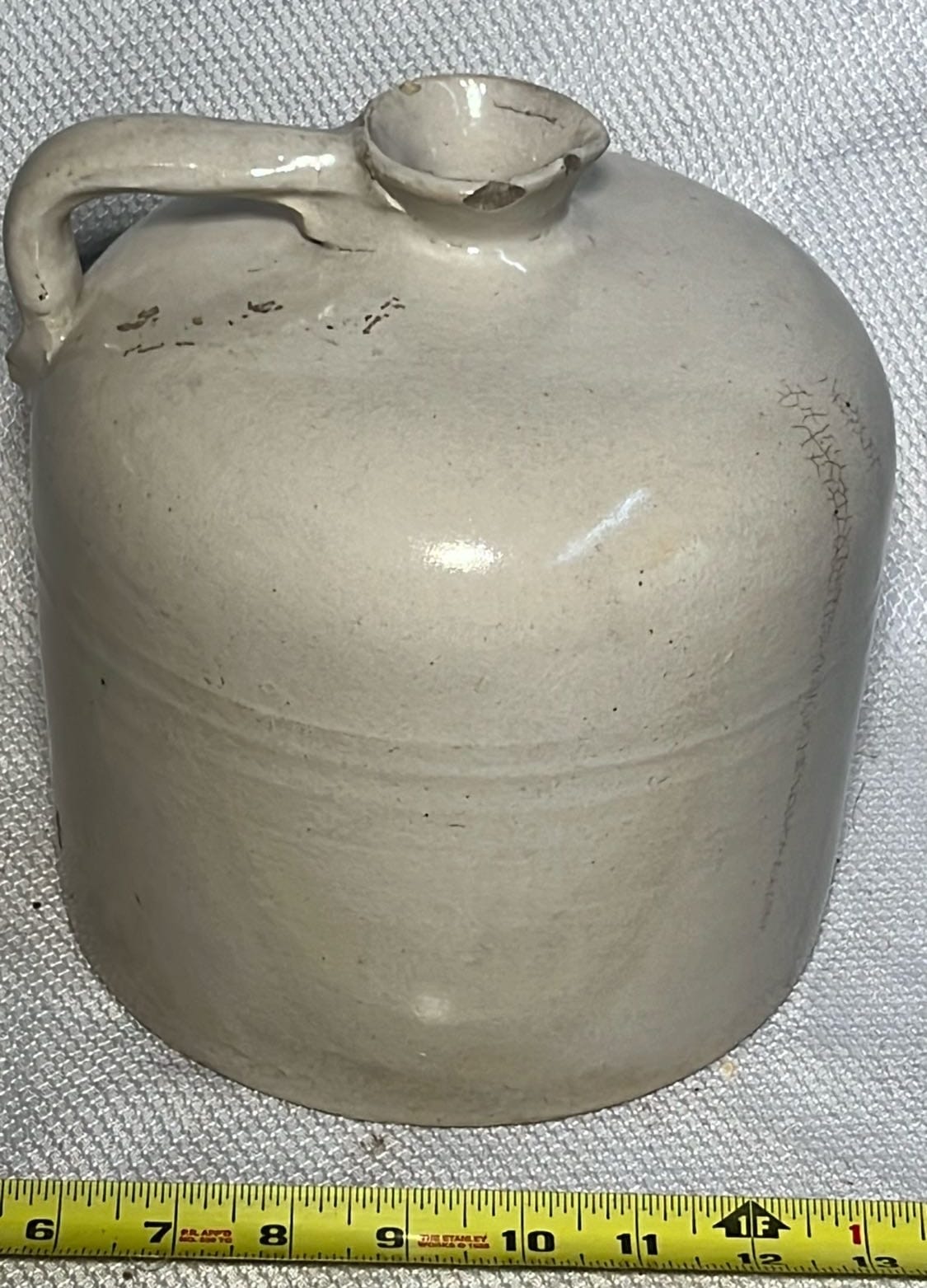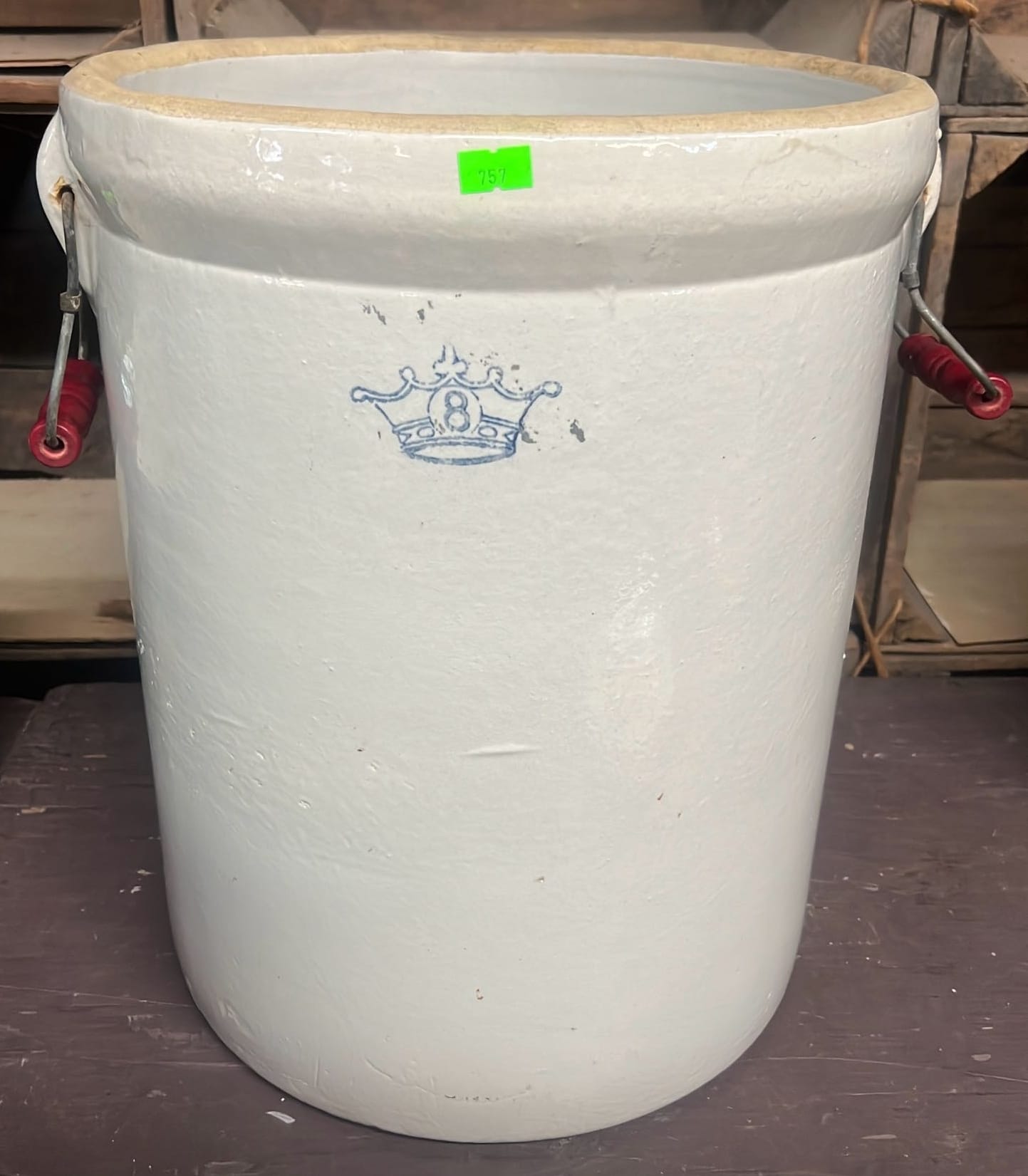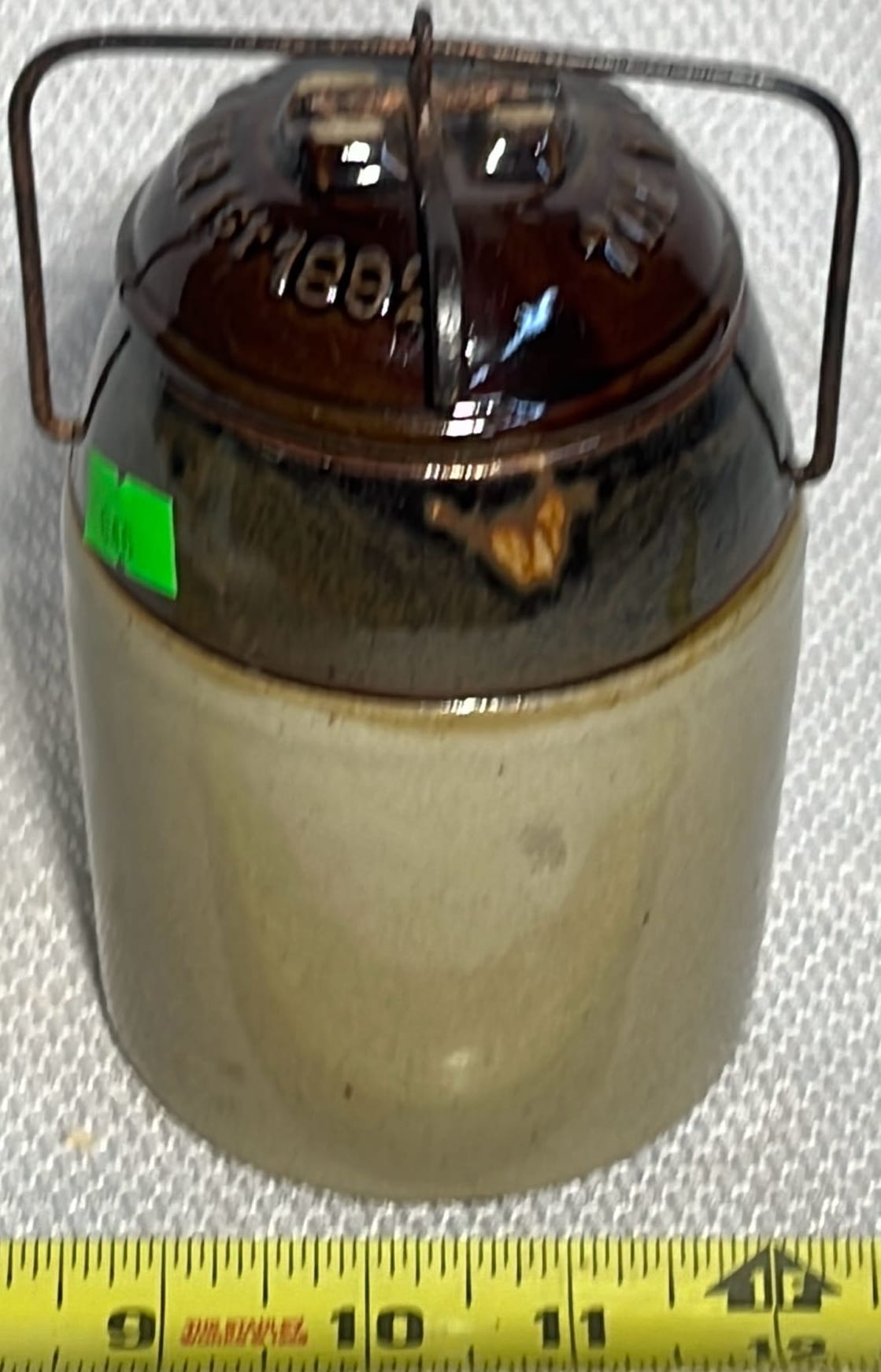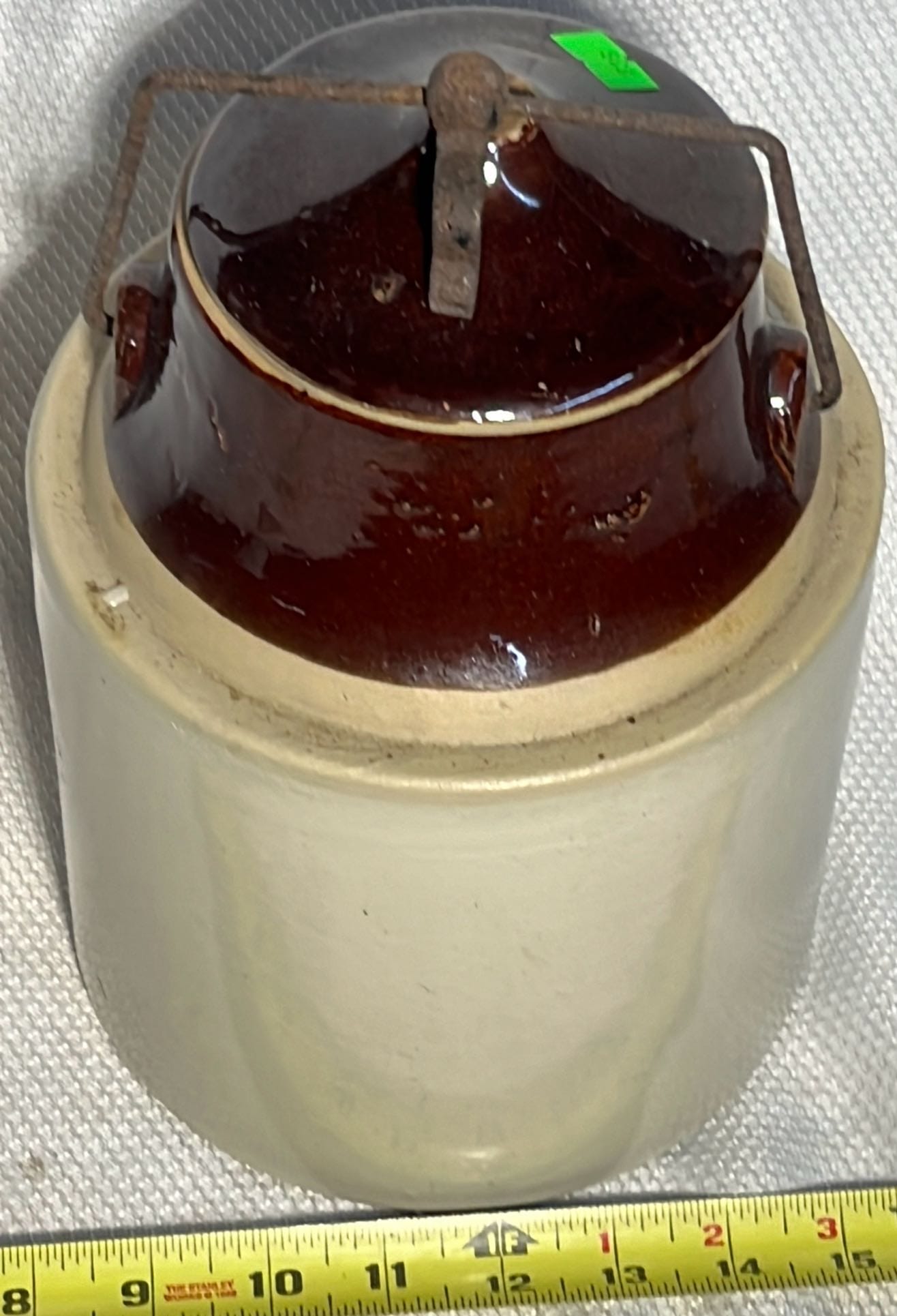 894 Crock Jug with wood Handle and wire bail 7”x9”
