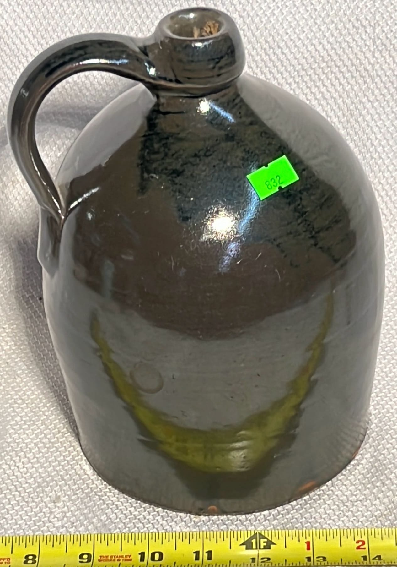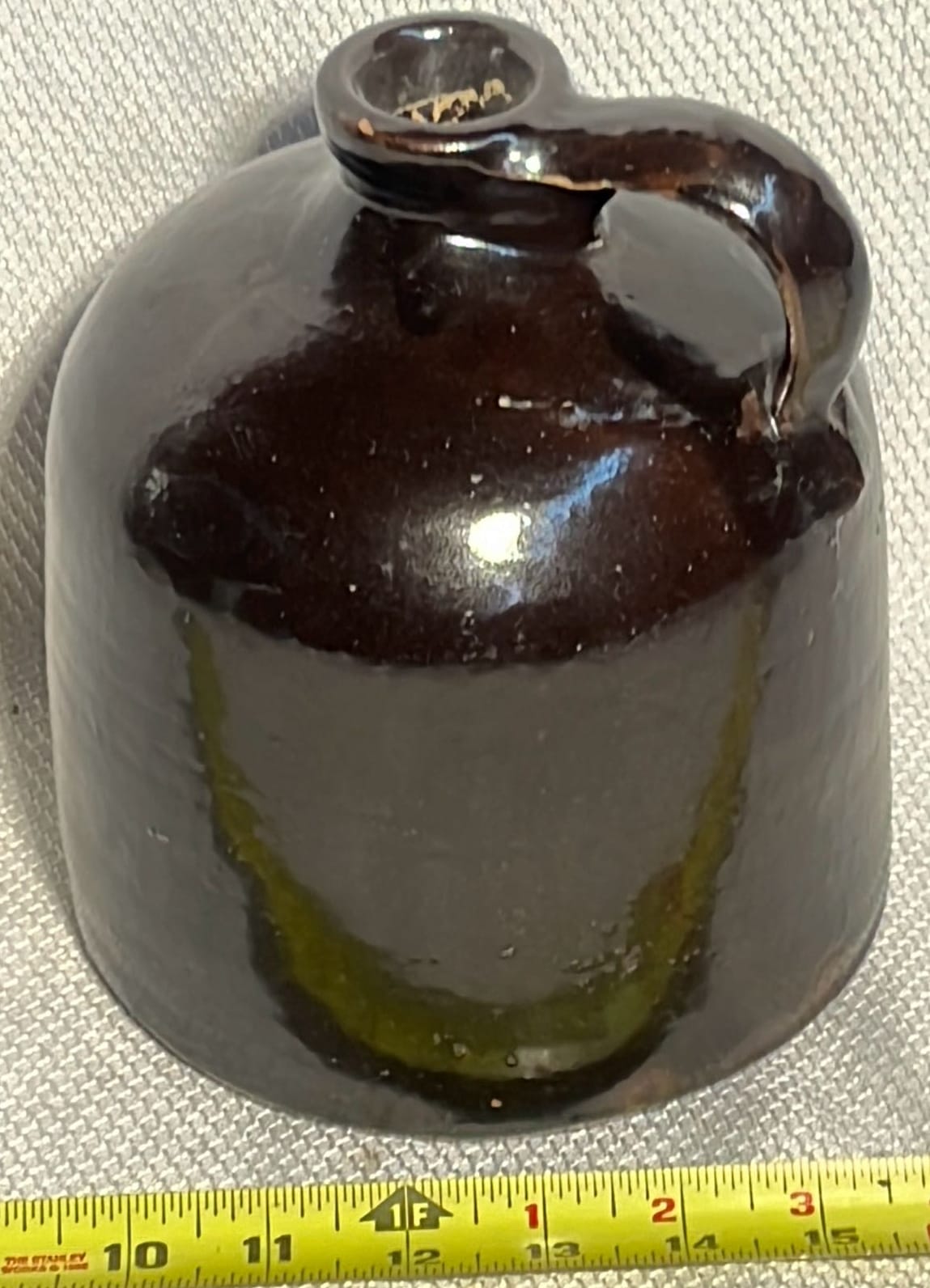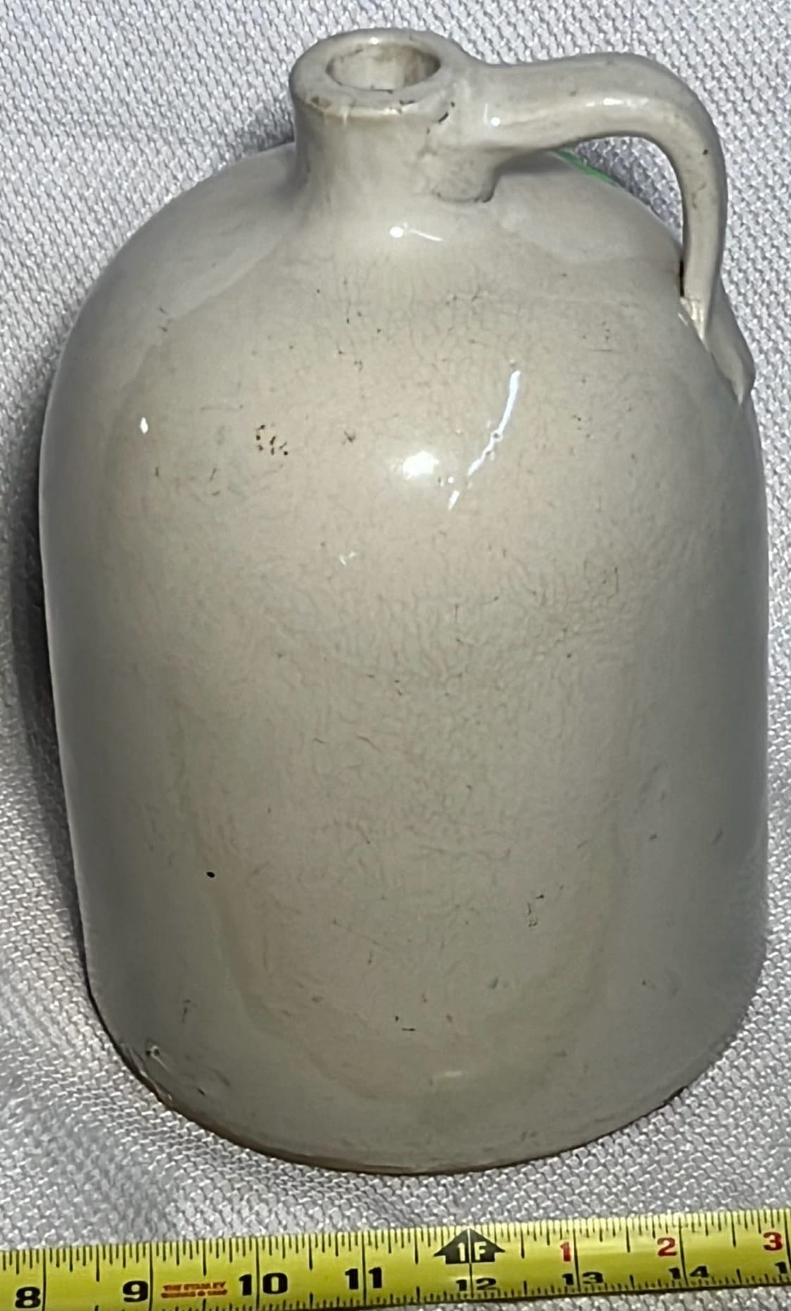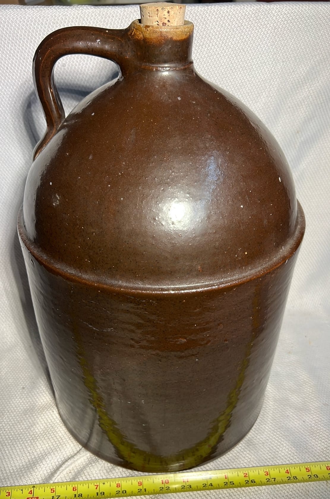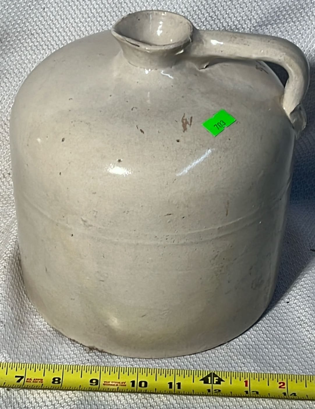 894 Crock Jug with wood Handle and wire bail 7”x9”