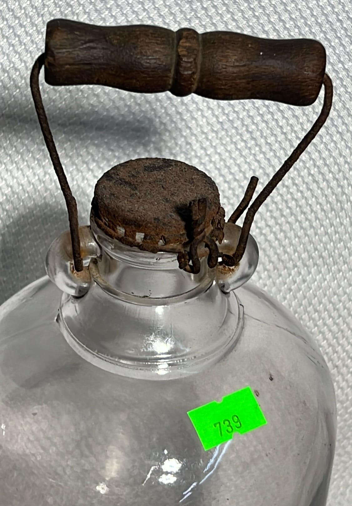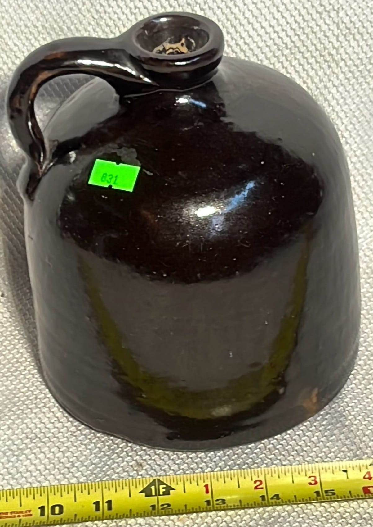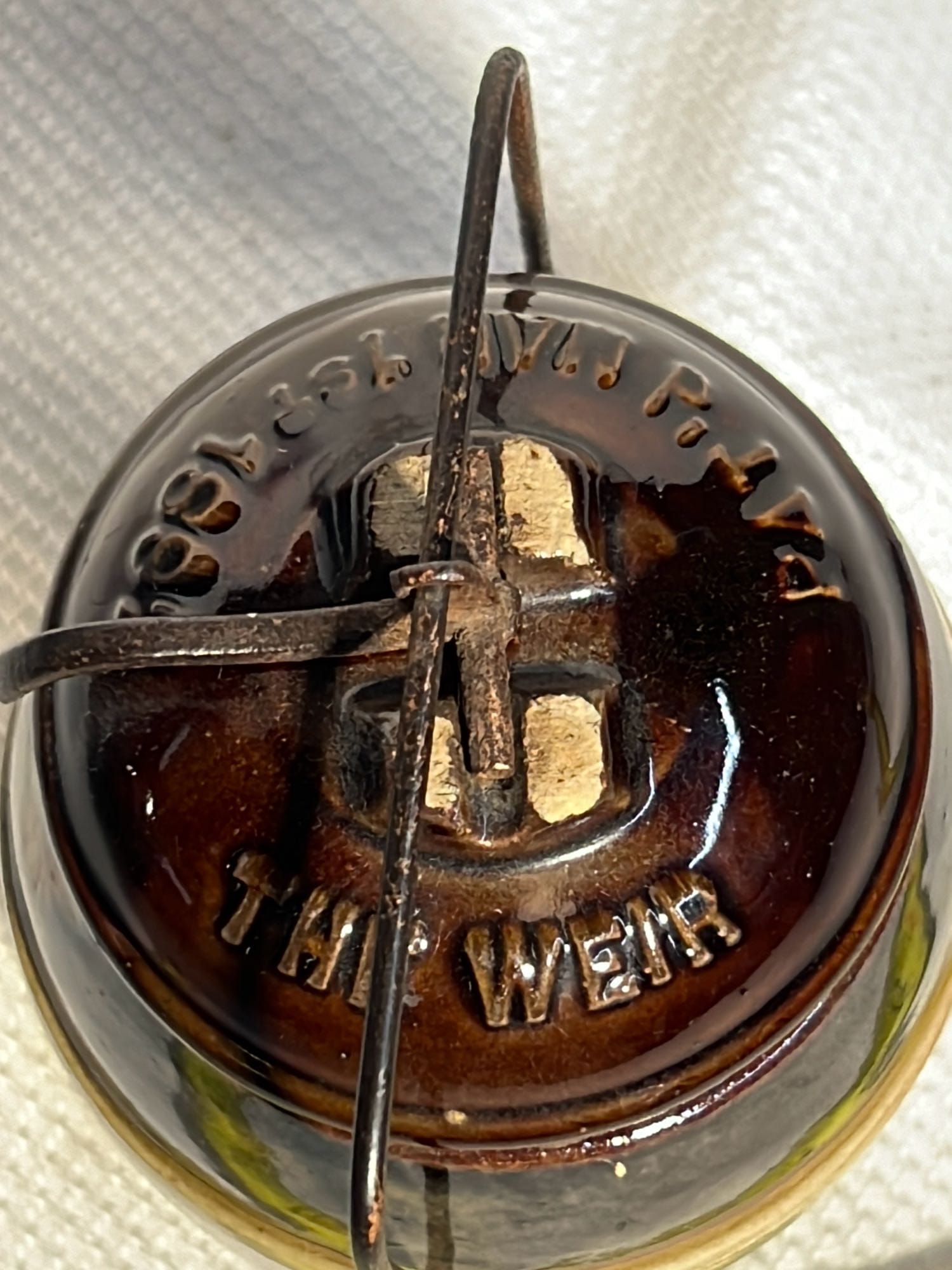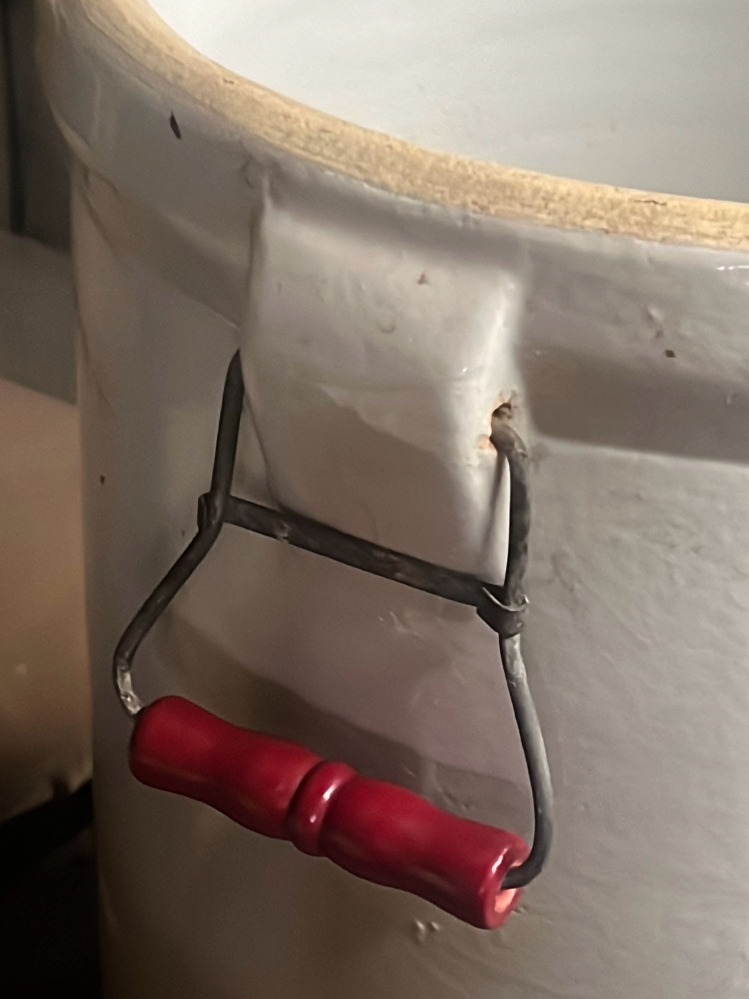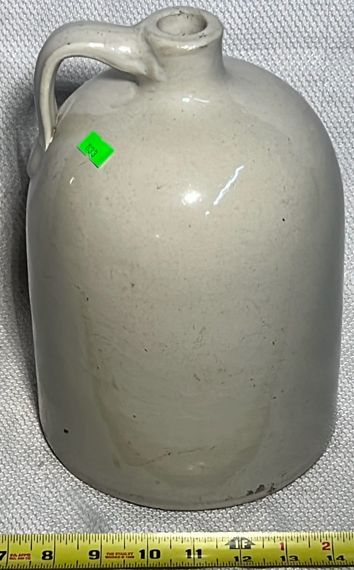 894 Crock Jug with wood Handle and wire bail 7”x9”