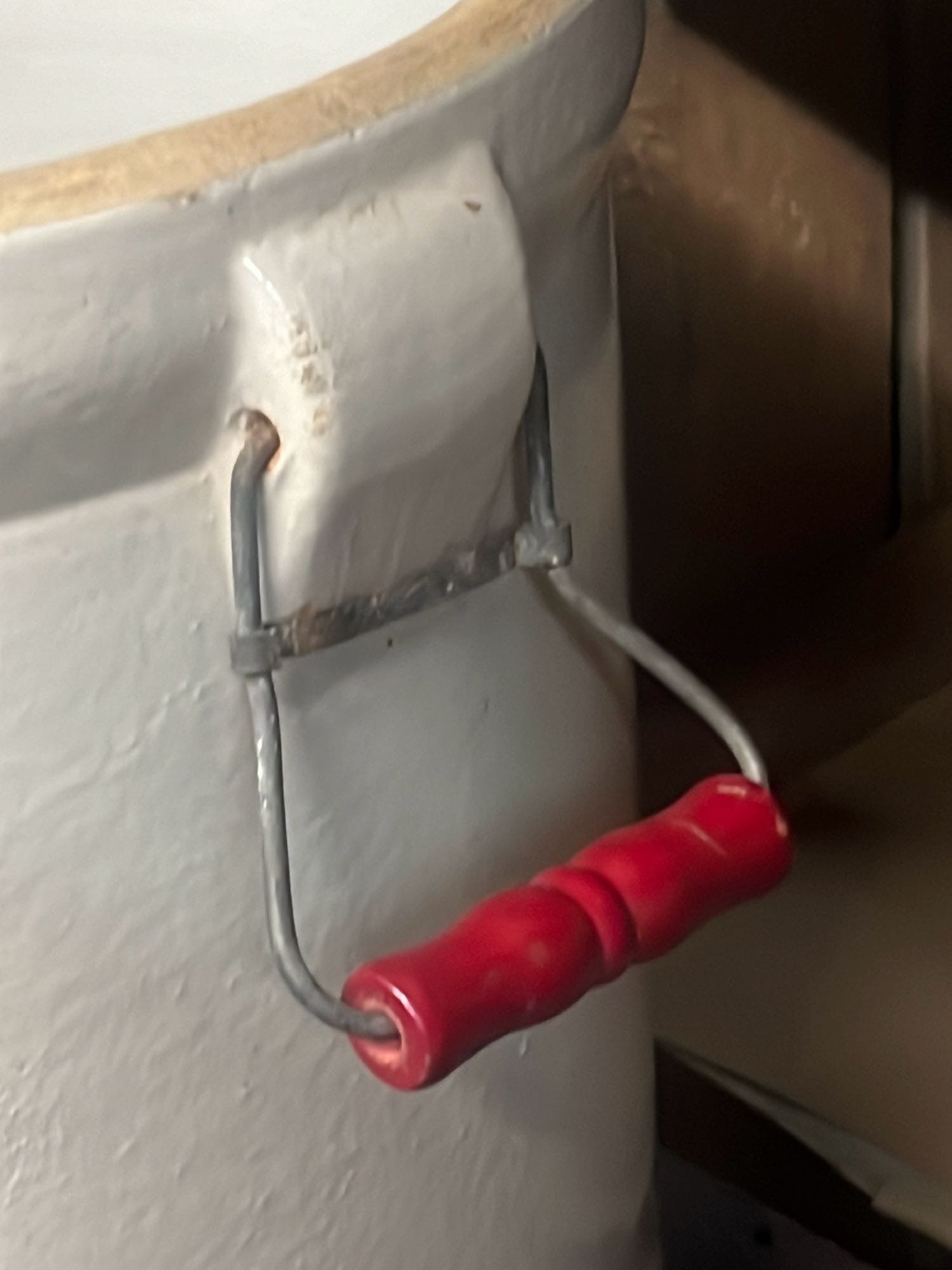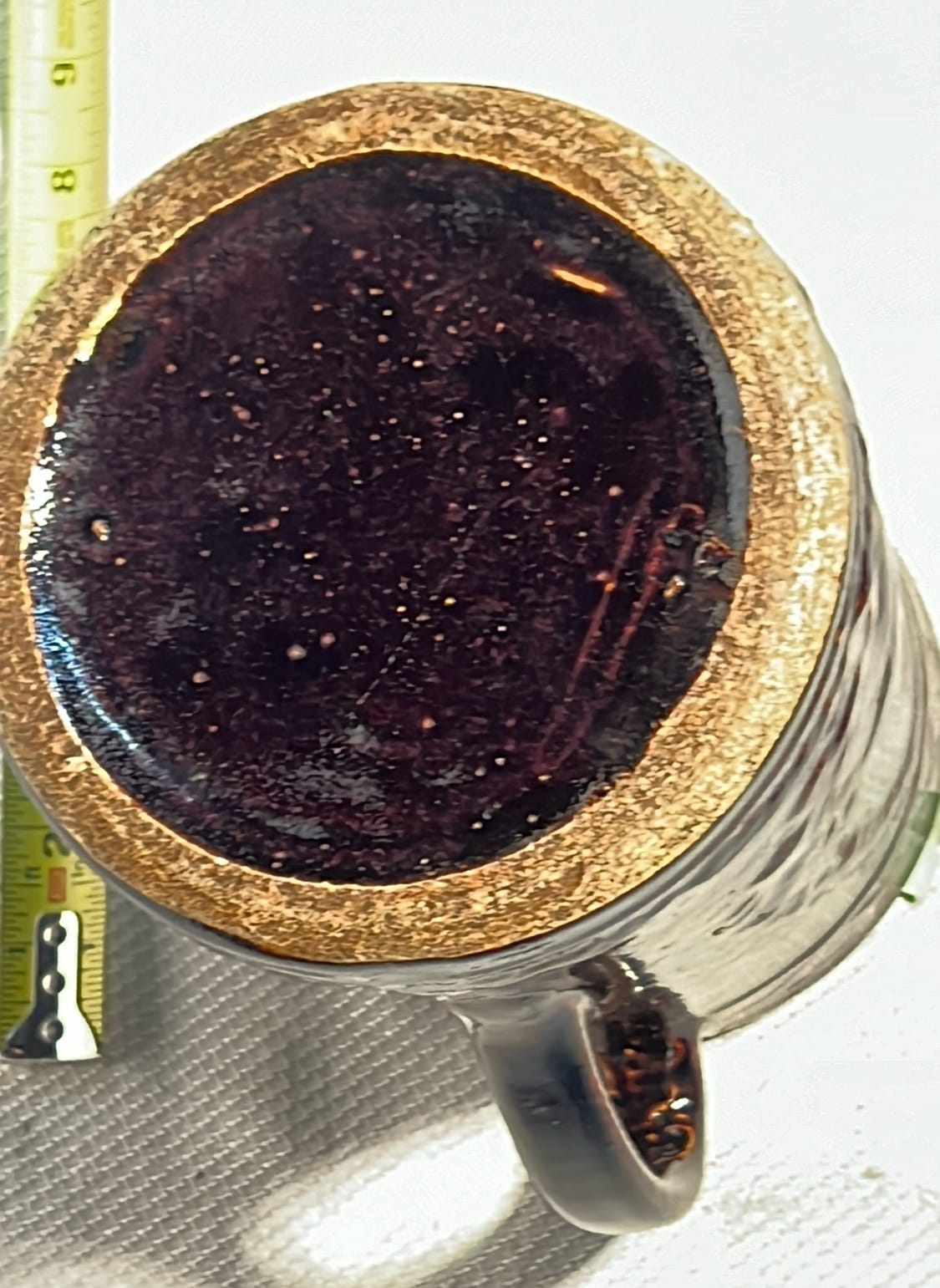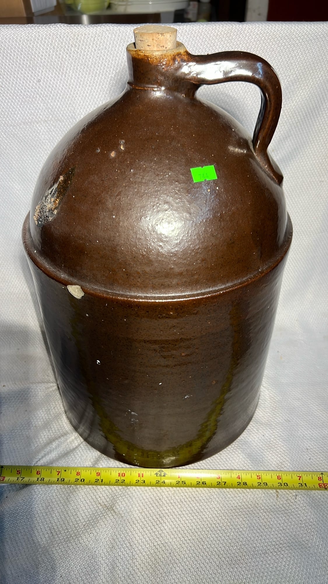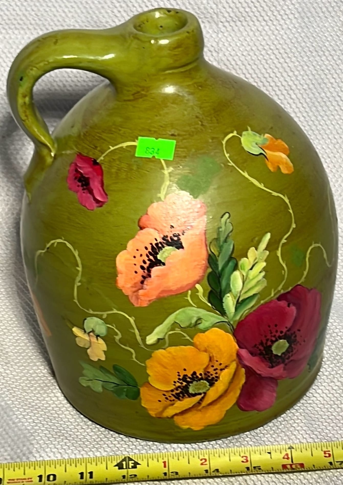 894 Crock Jug with wood Handle and wire bail 7”x9”