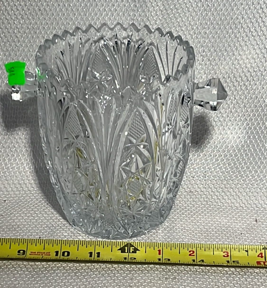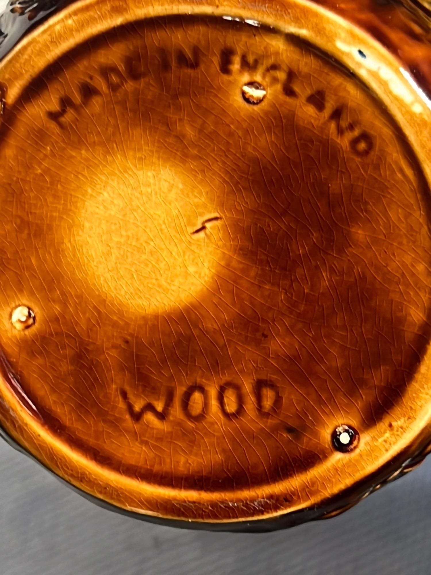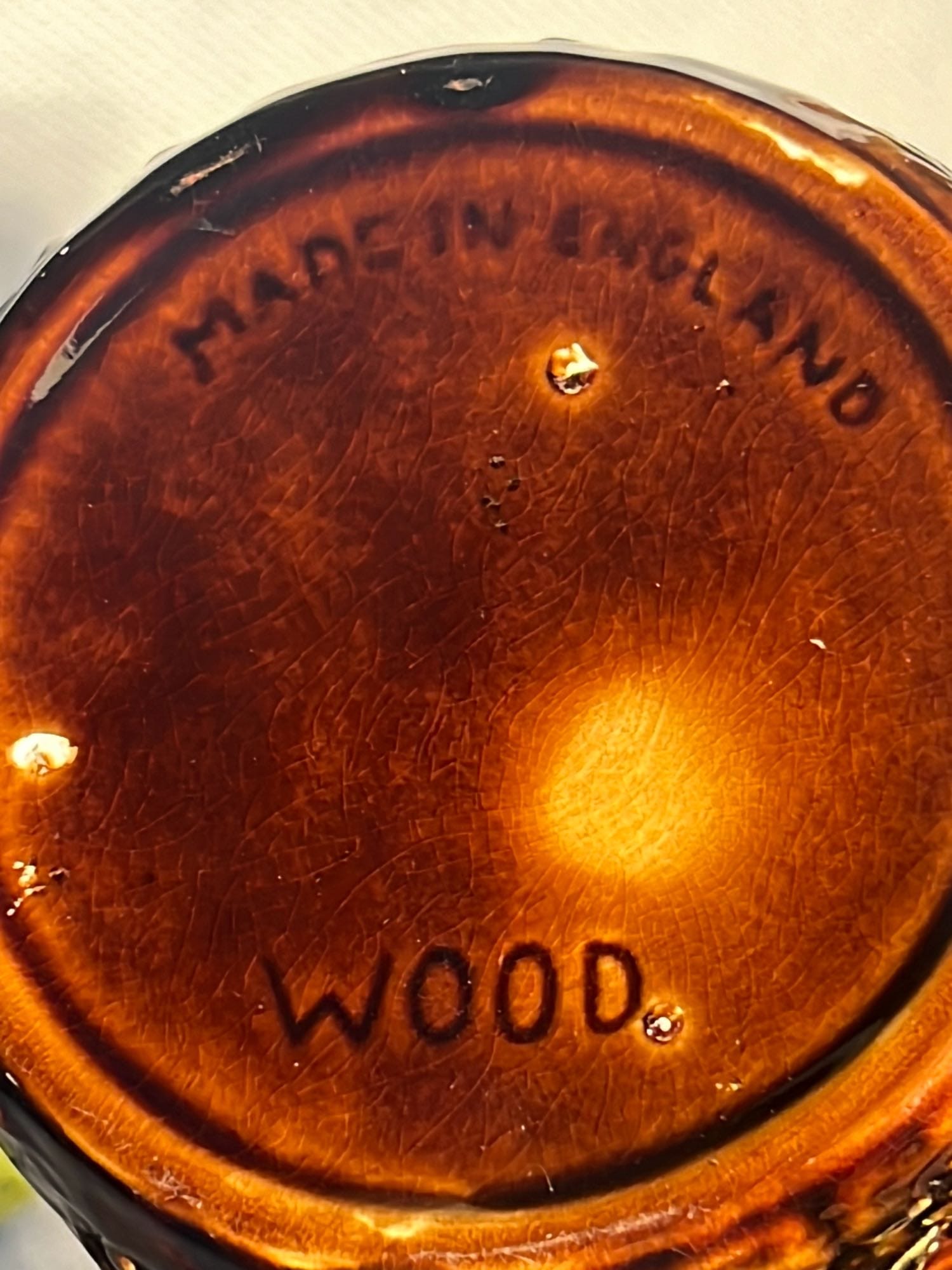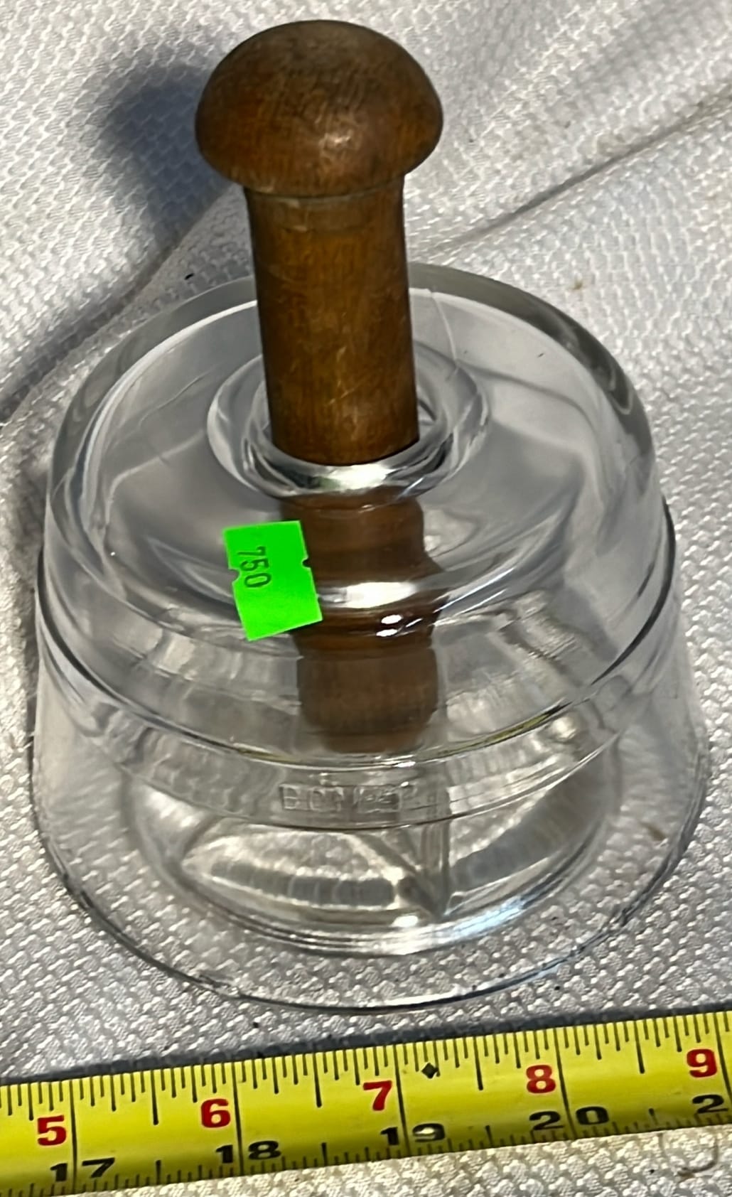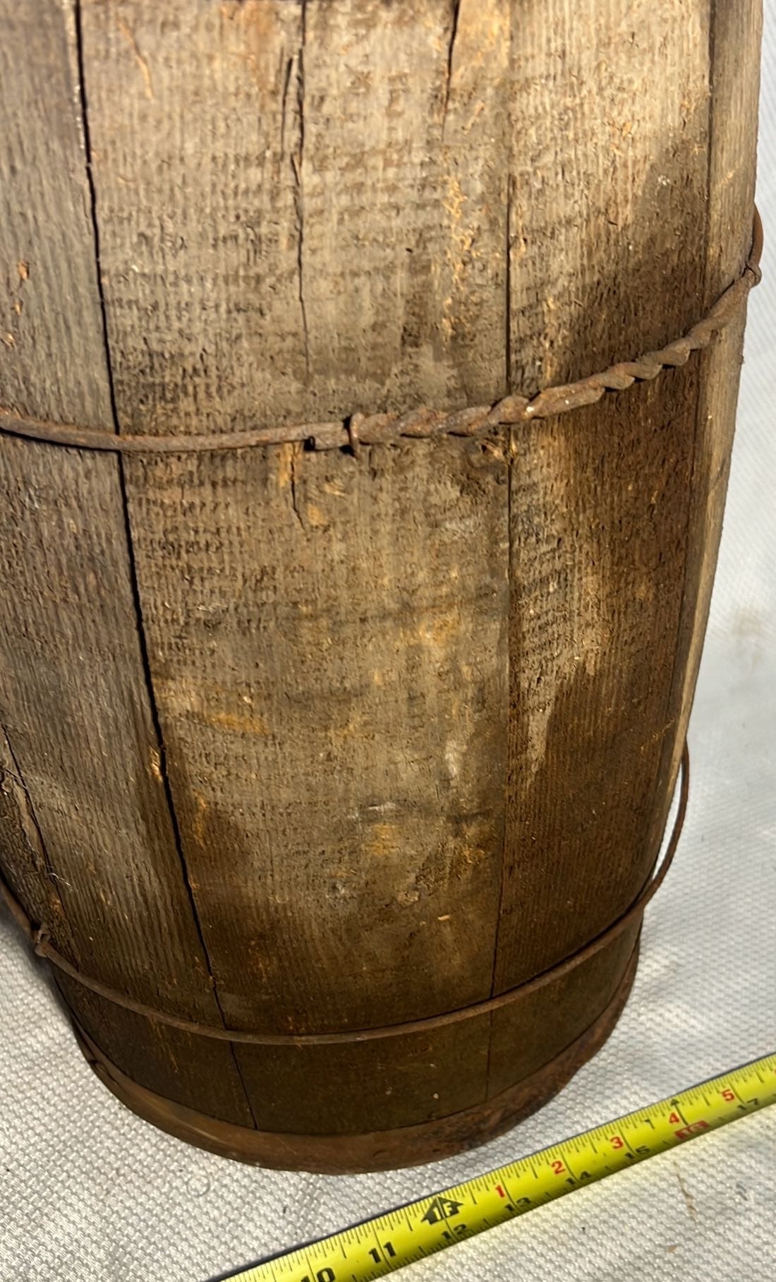 894 Crock Jug with wood Handle and wire bail 7”x9”