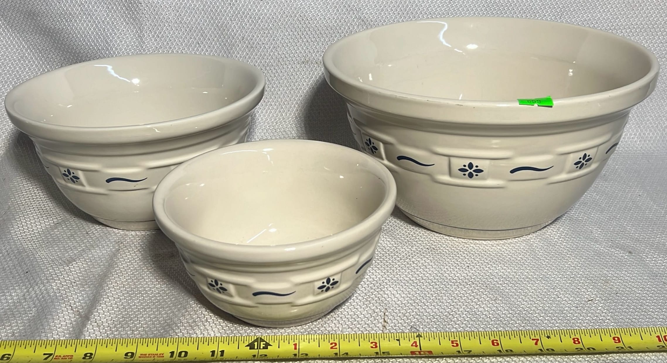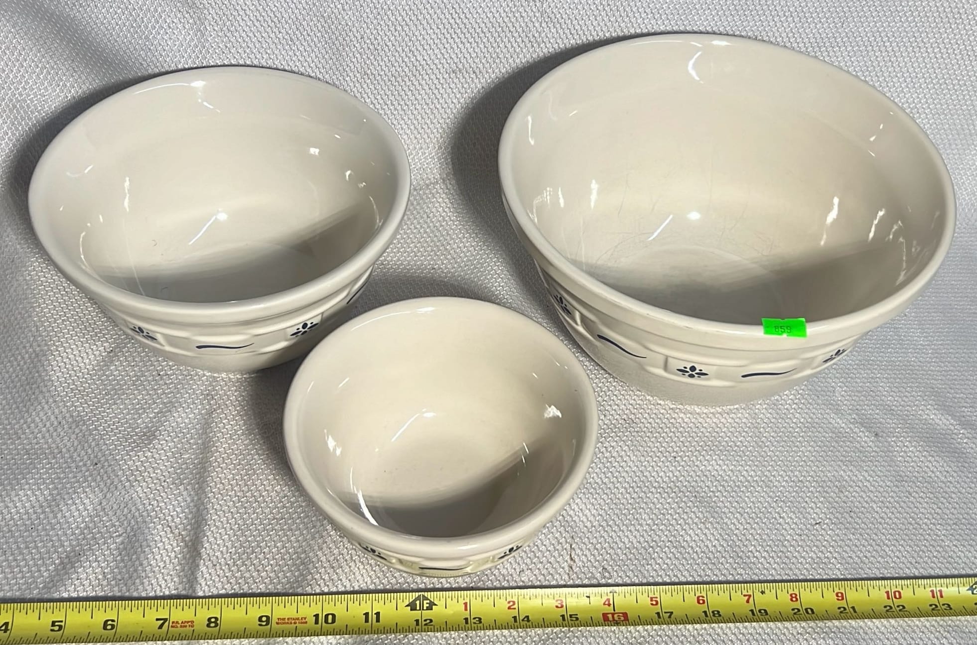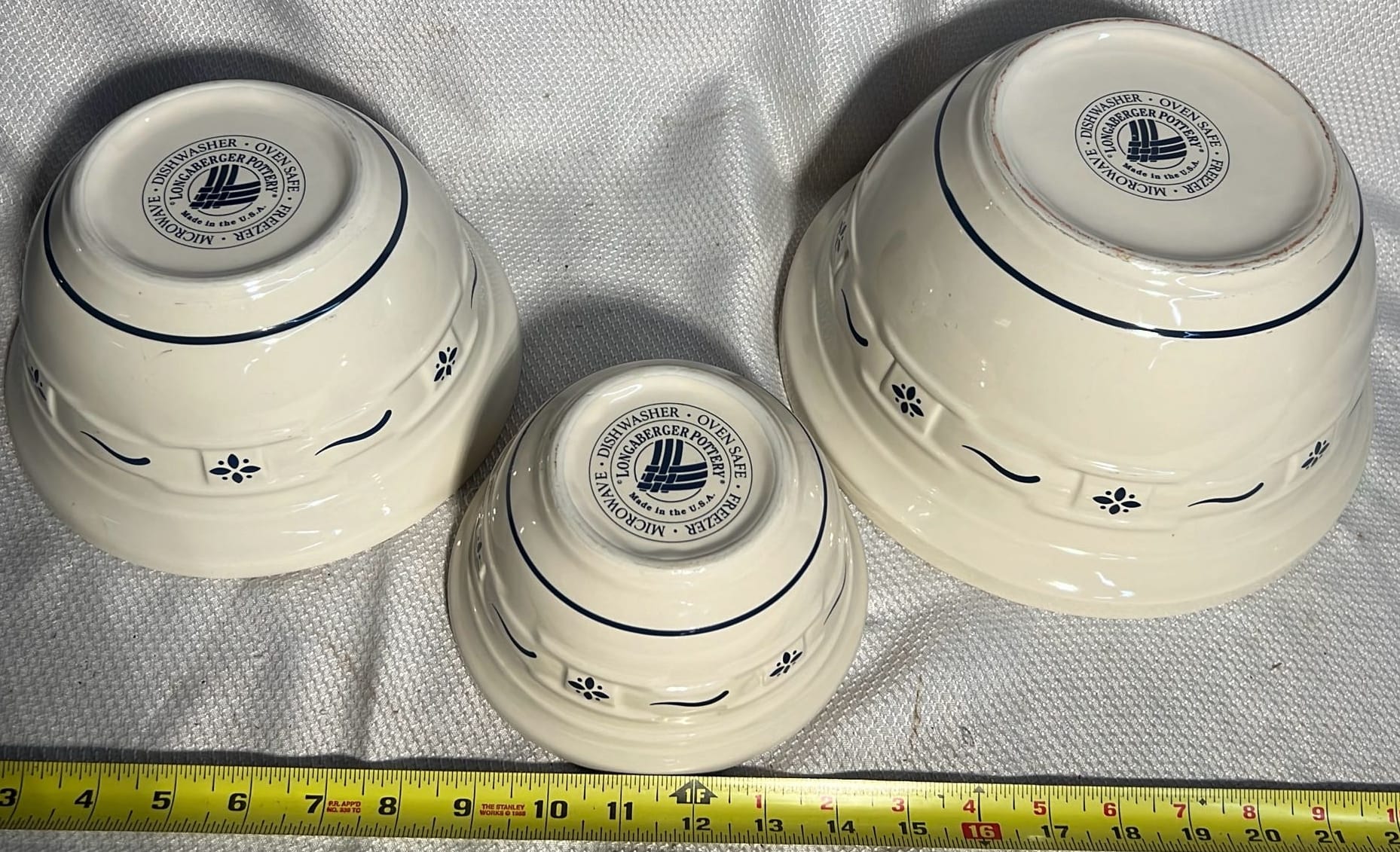 859 3- Longaberger Pottery Woven traditions blue mixing bowls 6.5”, 8”, 10”