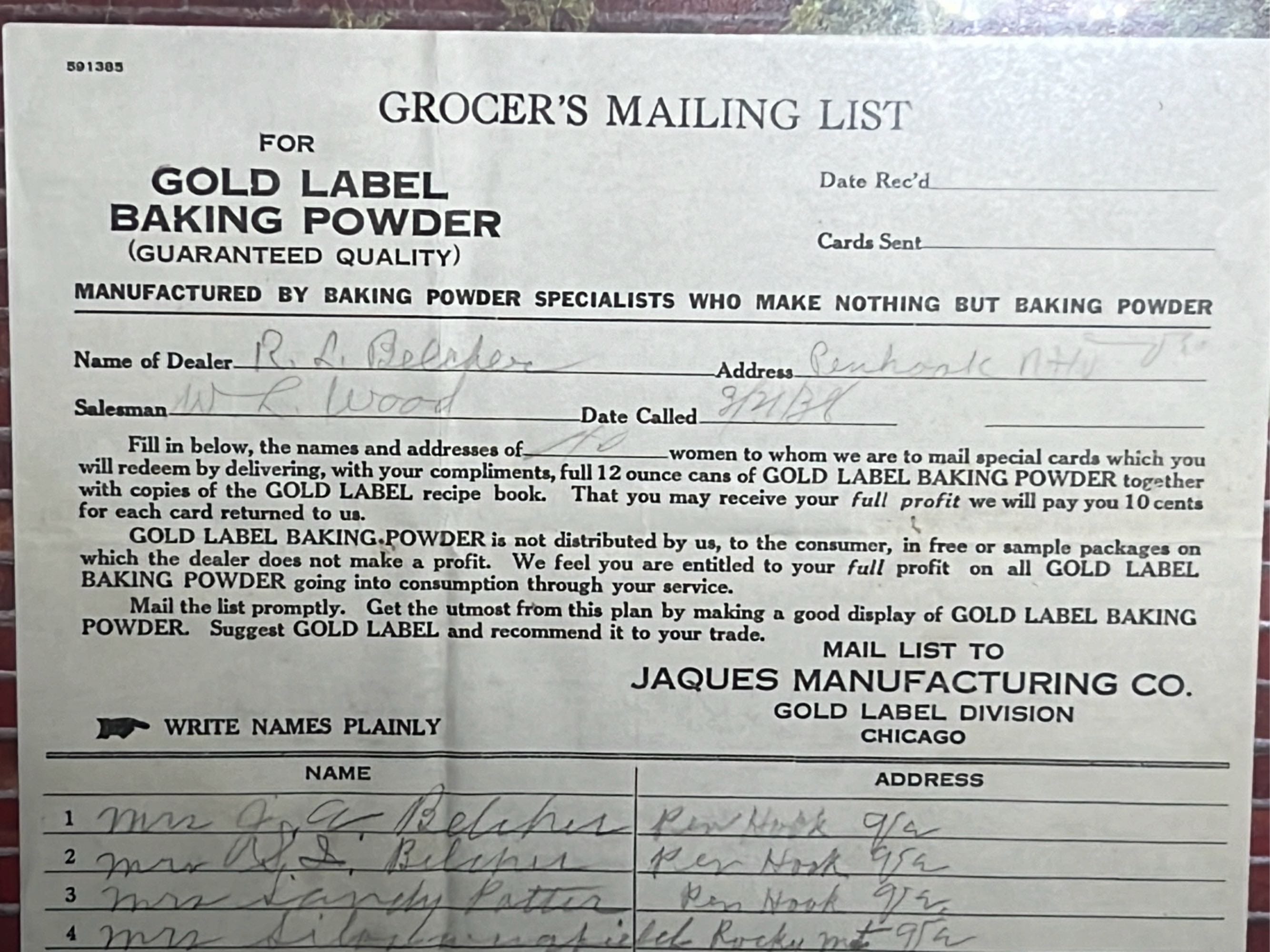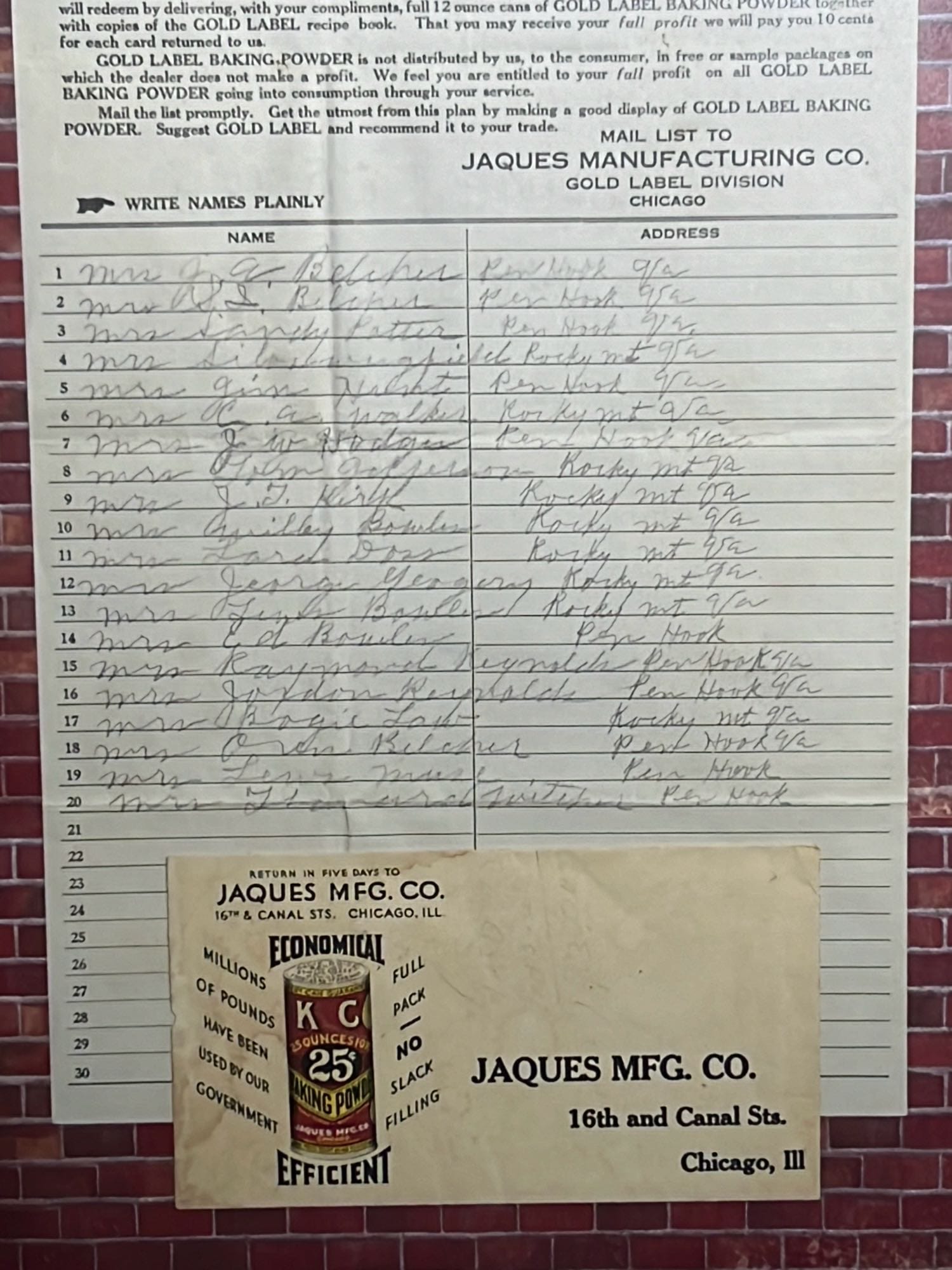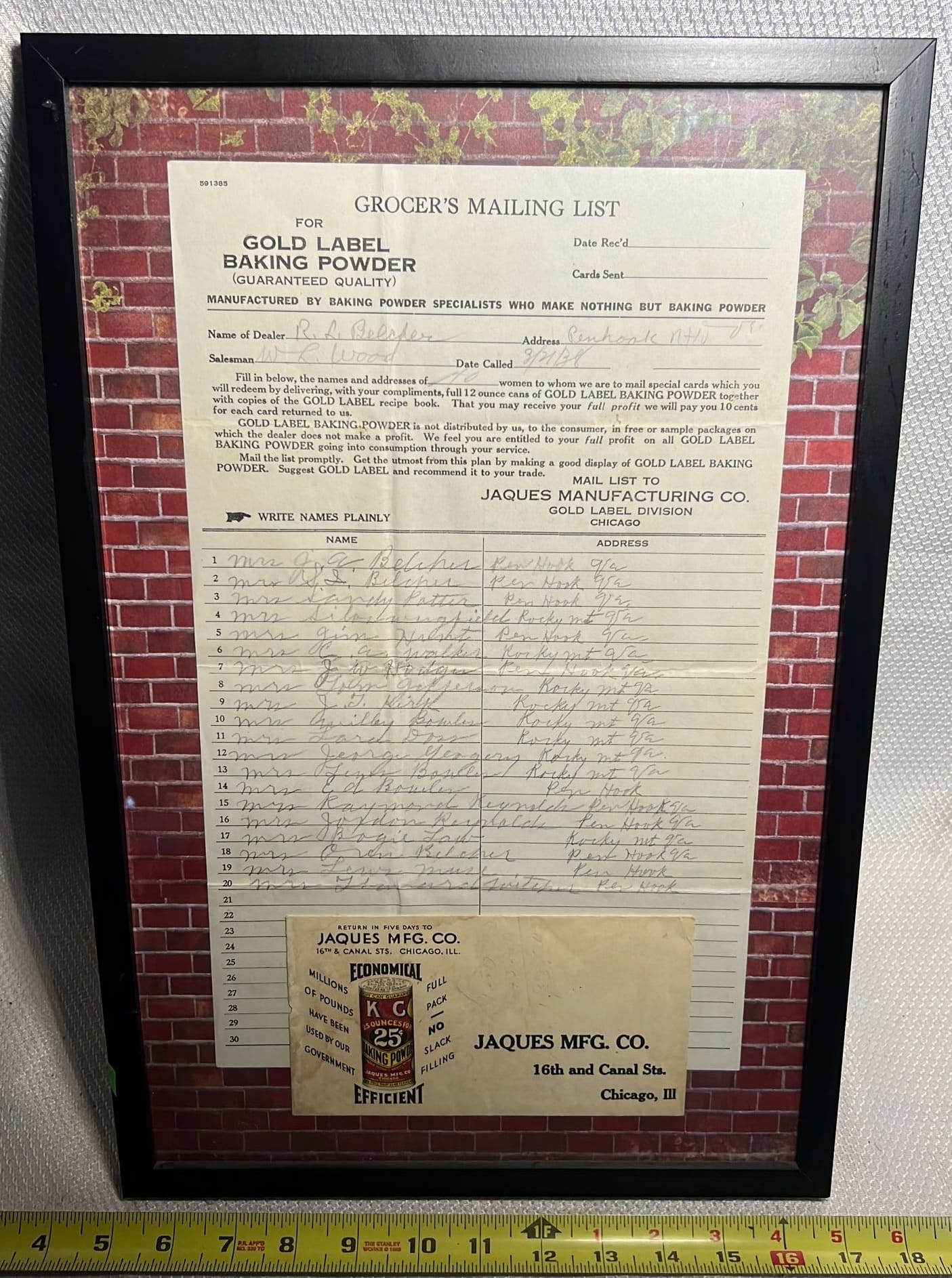 850 Framed Grocer’s Mailing List For Gold Label Baking Powder, Jacques Mfg co advertisement 12”x18”