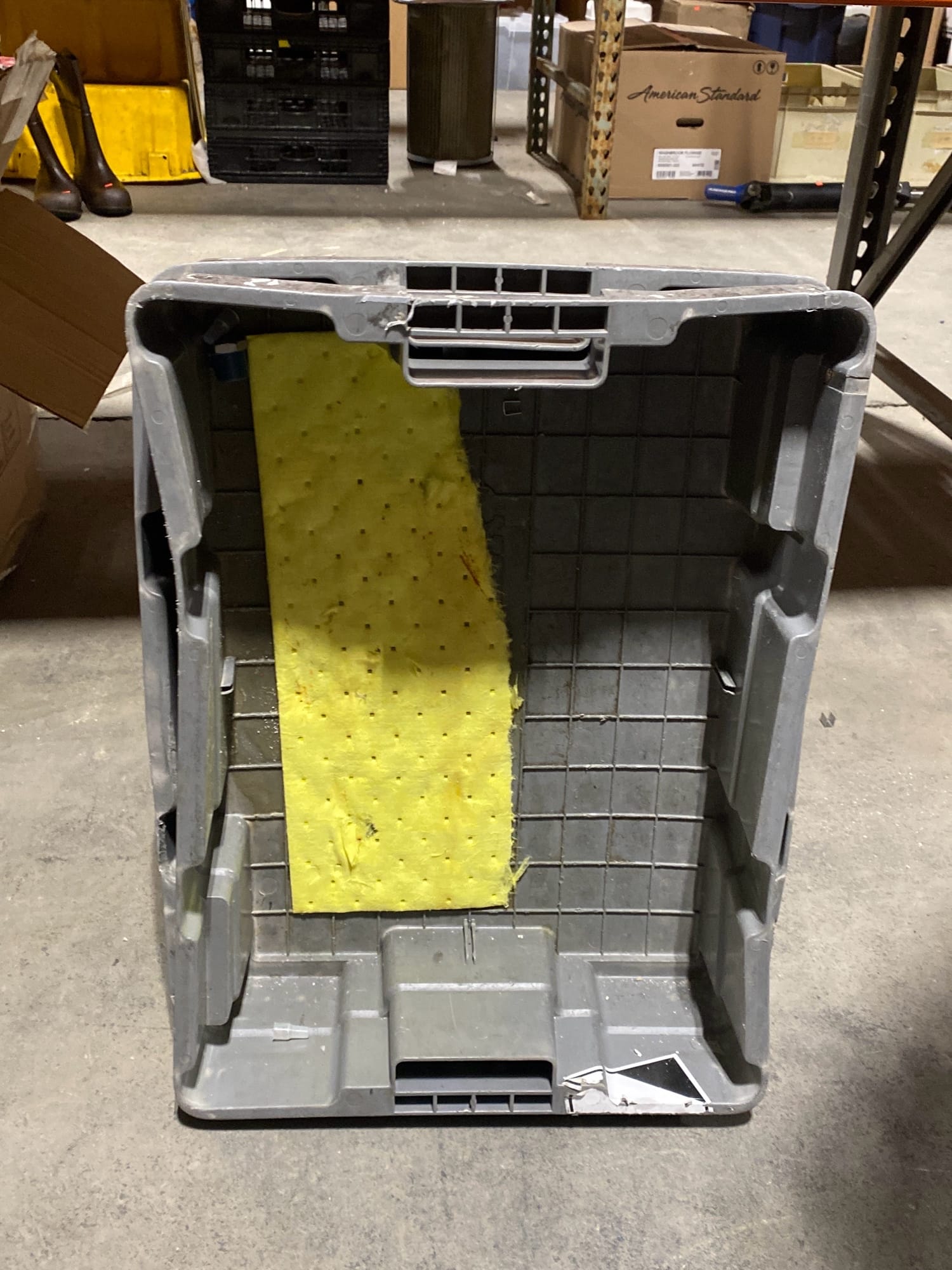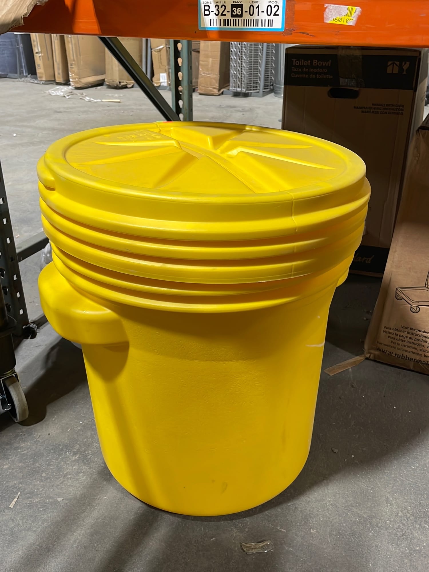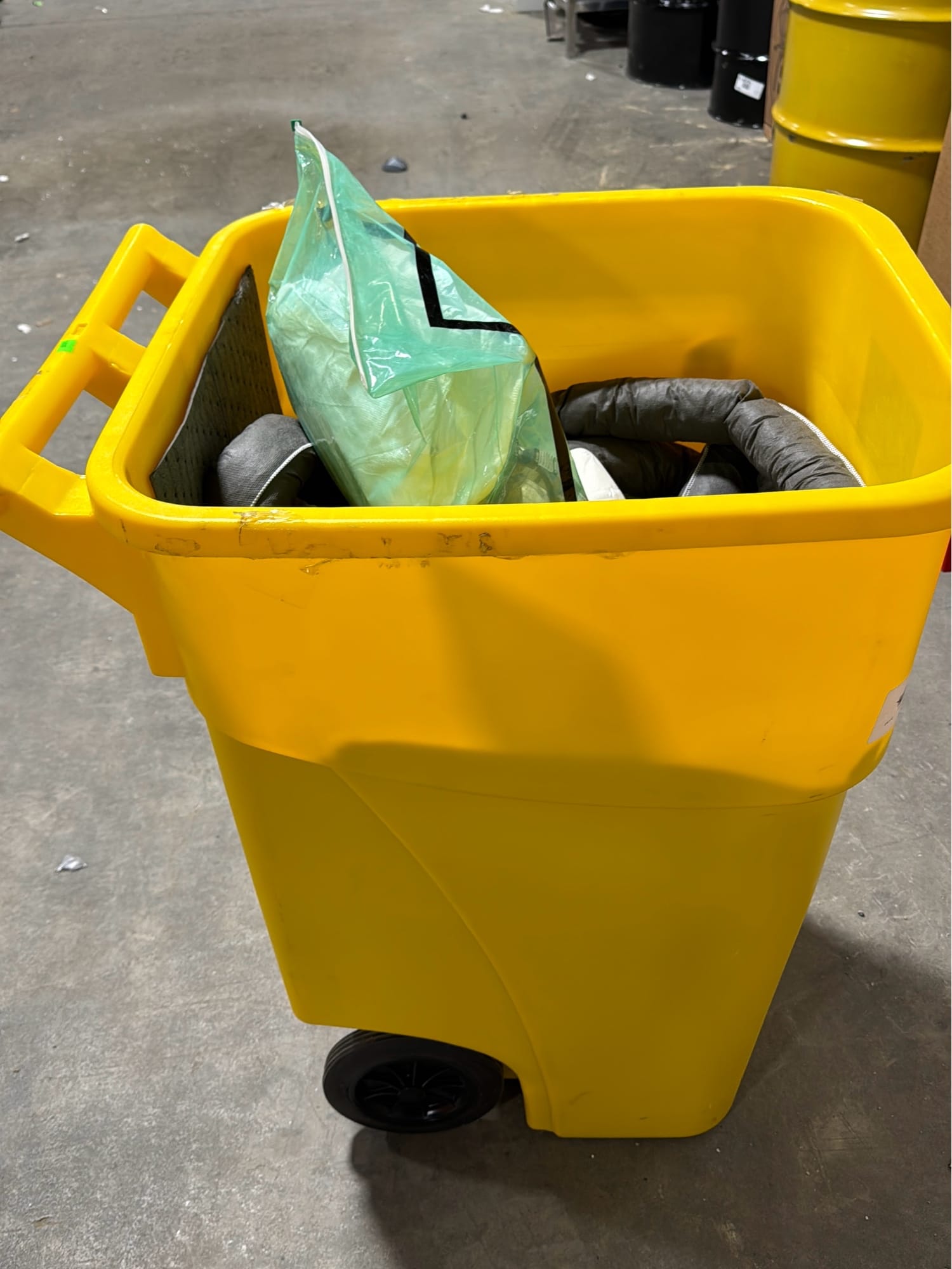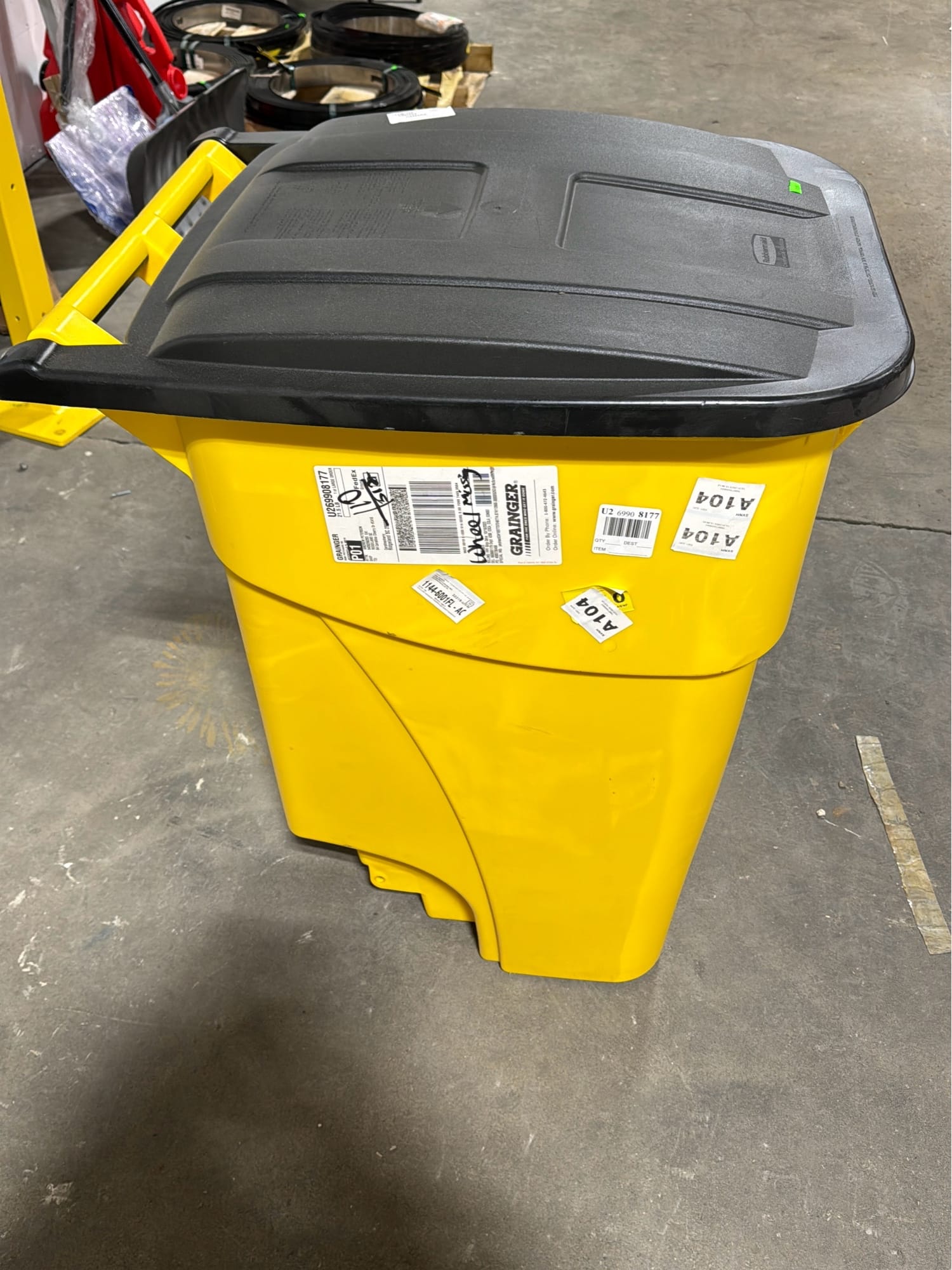 1635 Rubbermaid 50 gal yellow bin, wheels missing