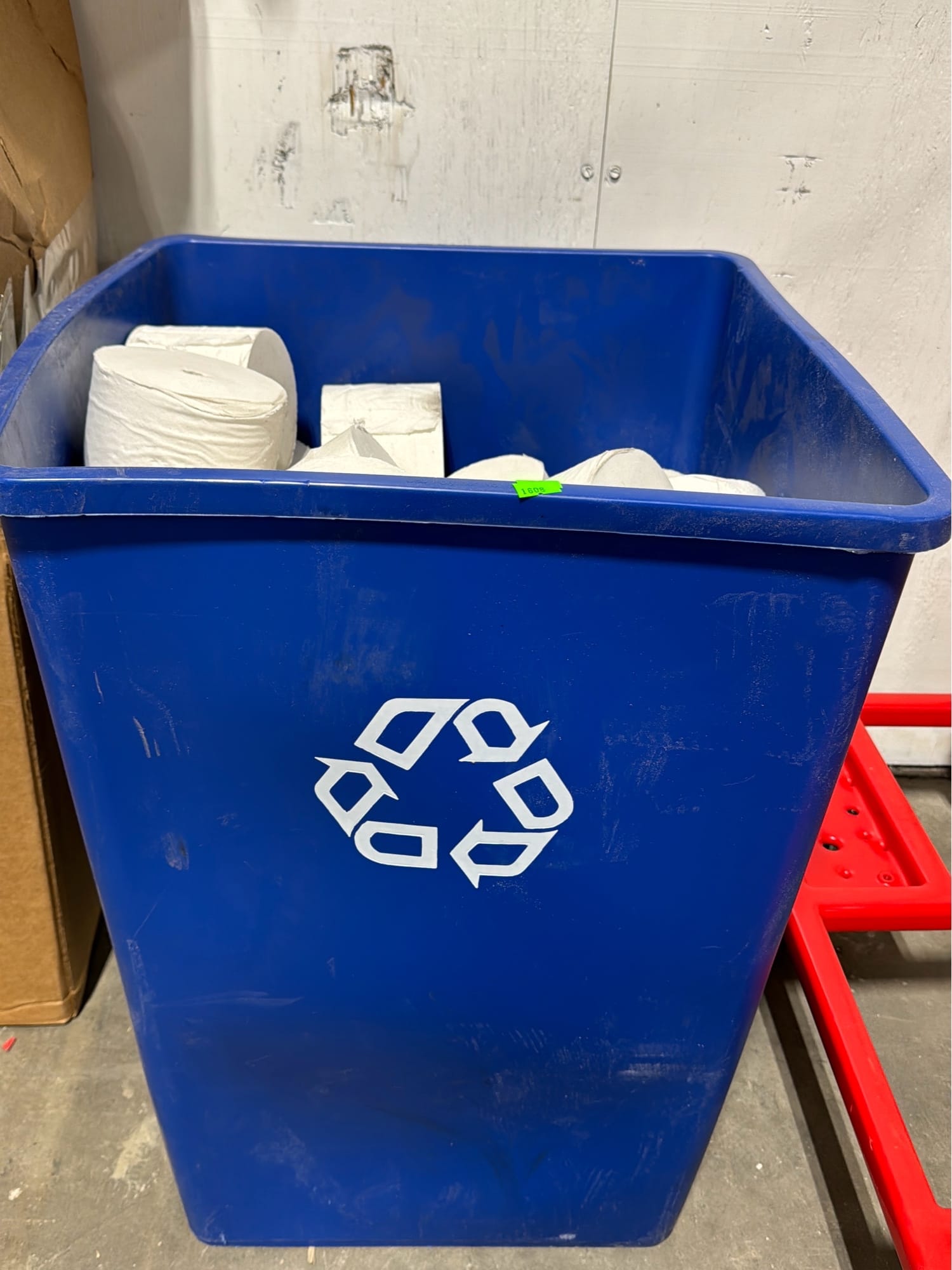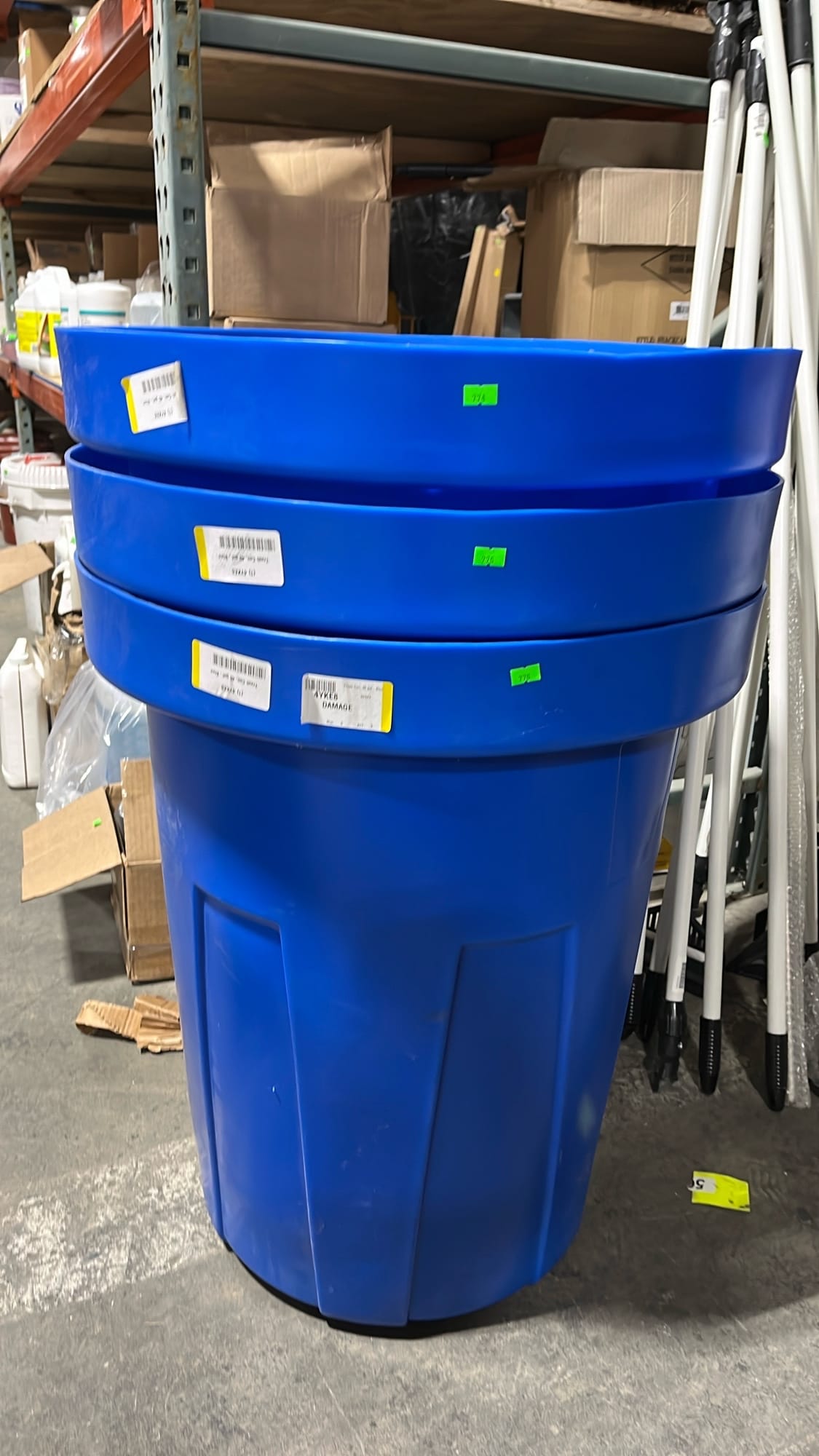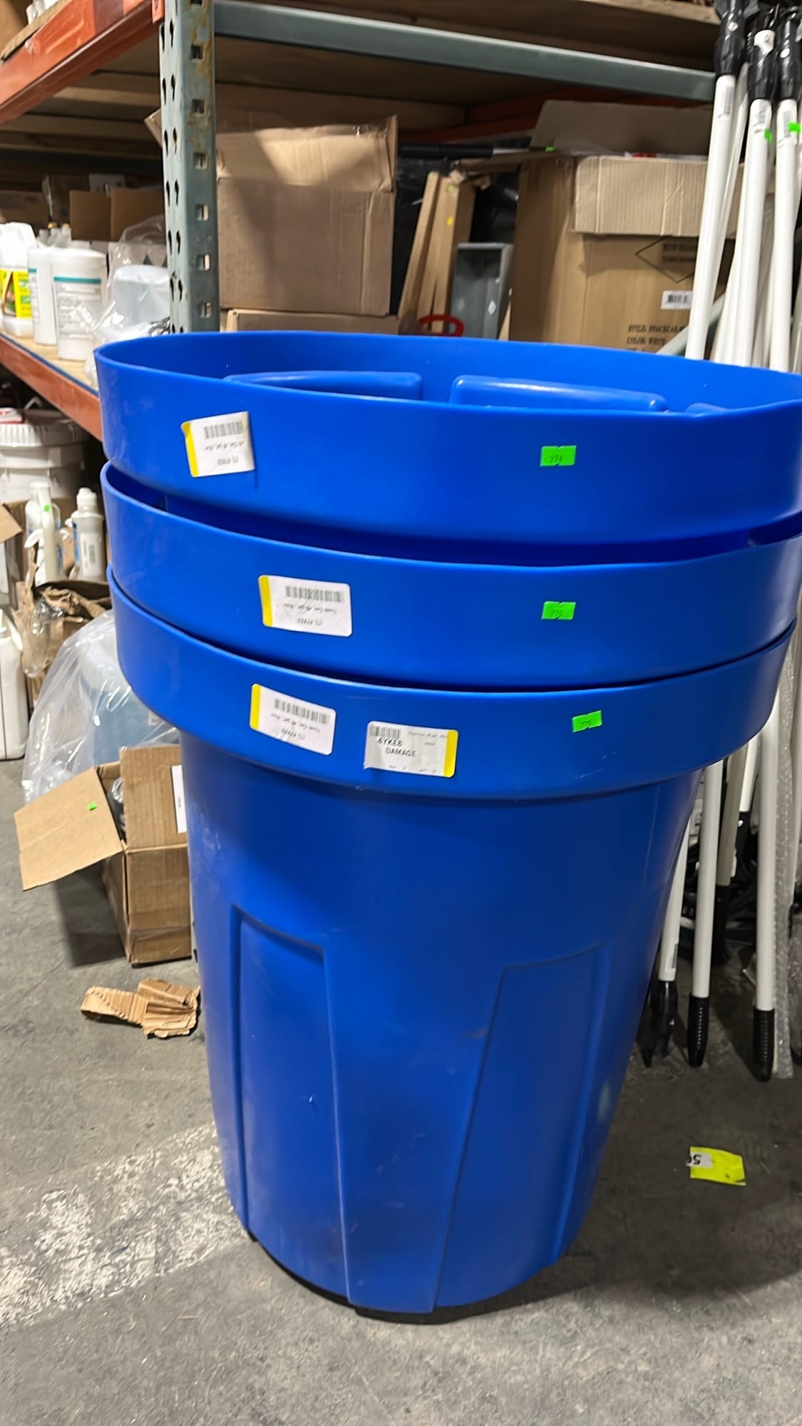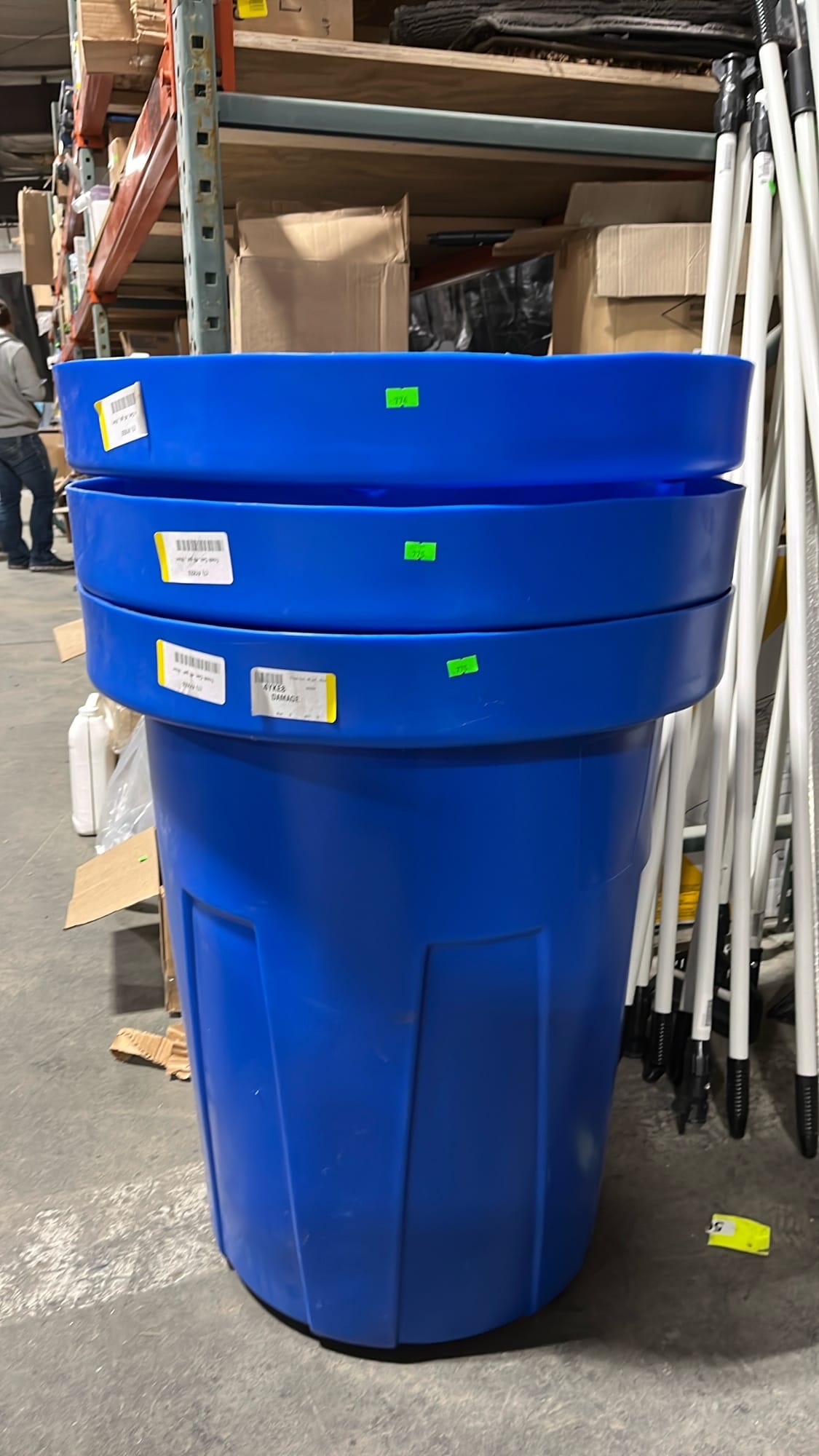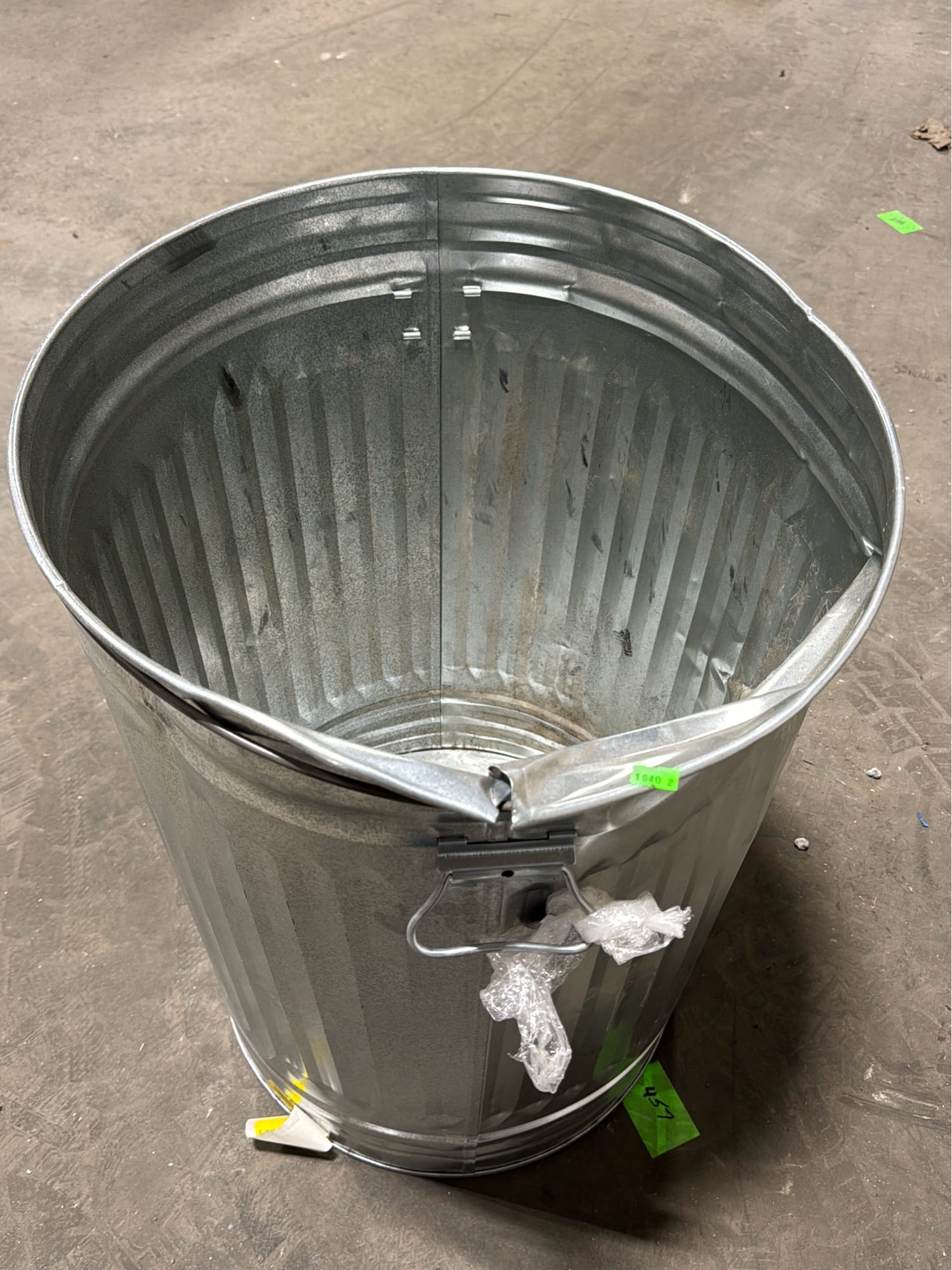 1619 50 gallon trash bin, missing lid, has a broken wheel
