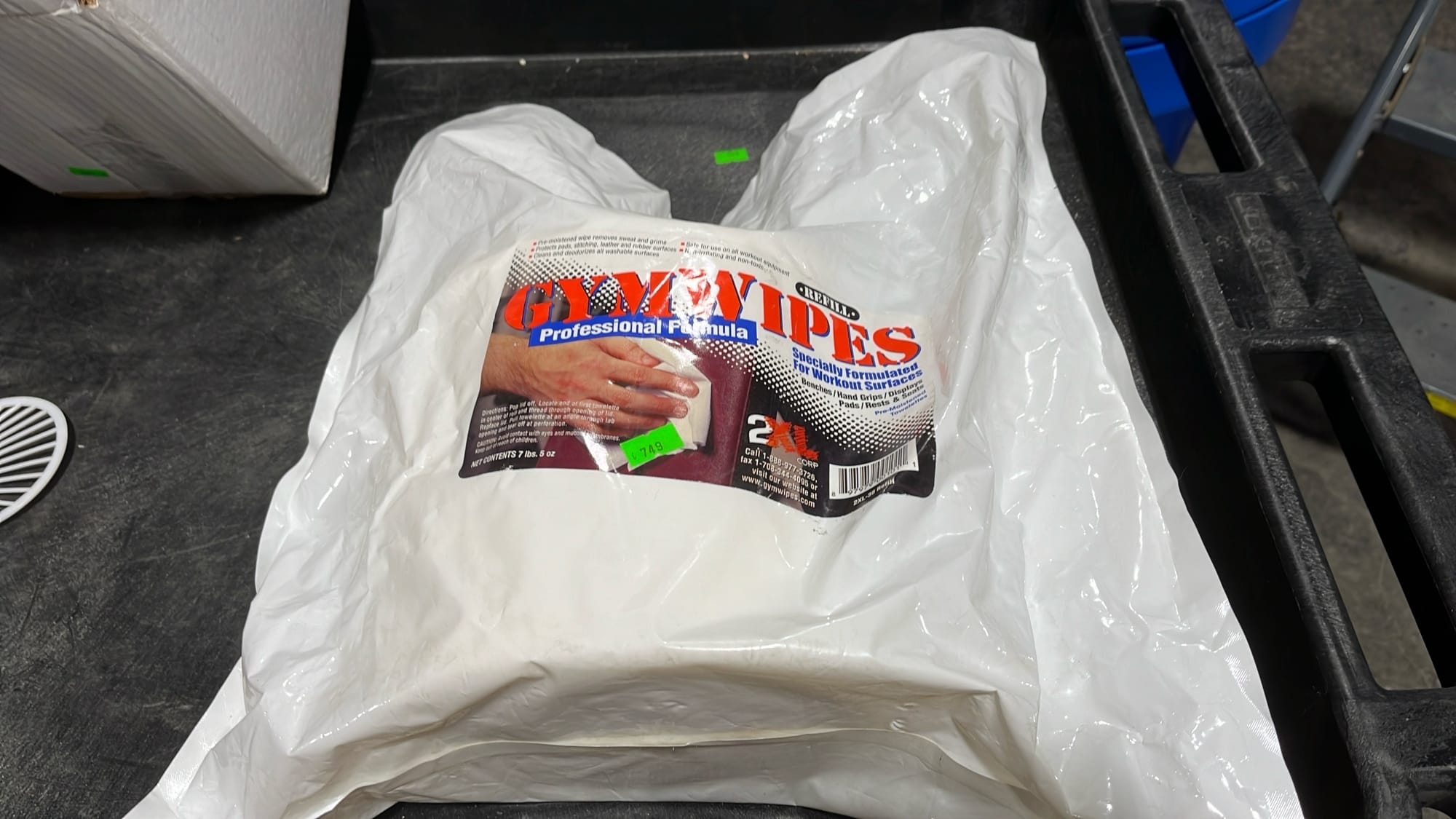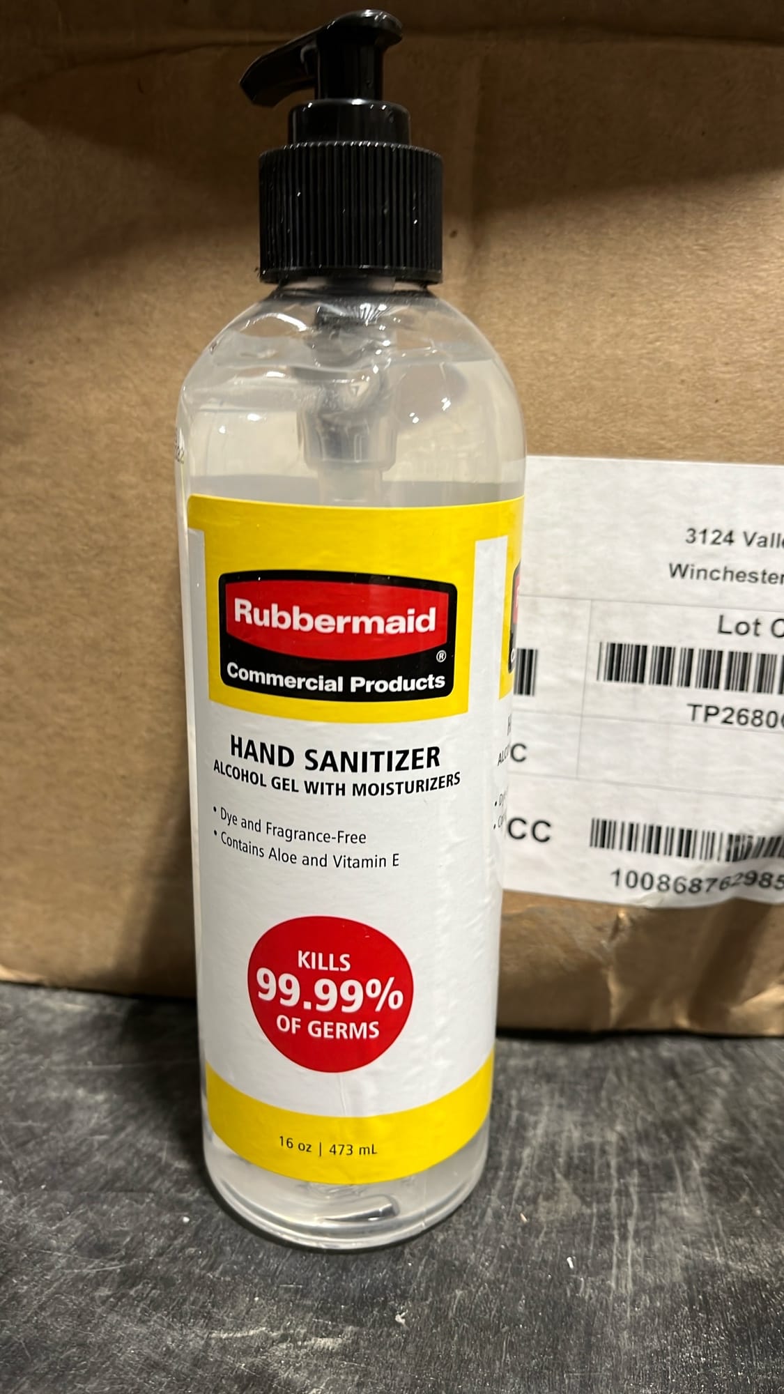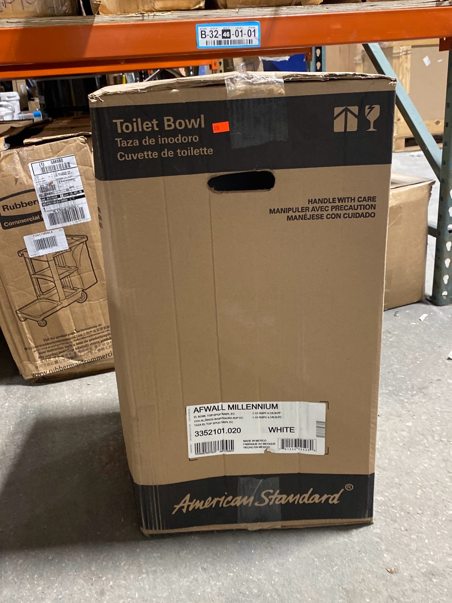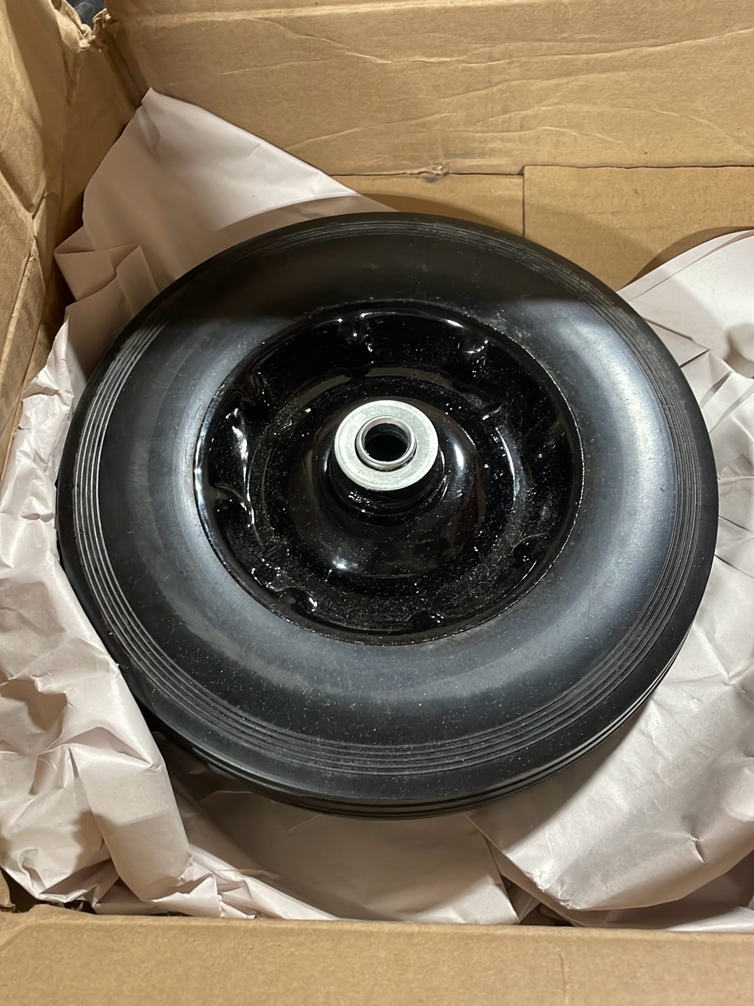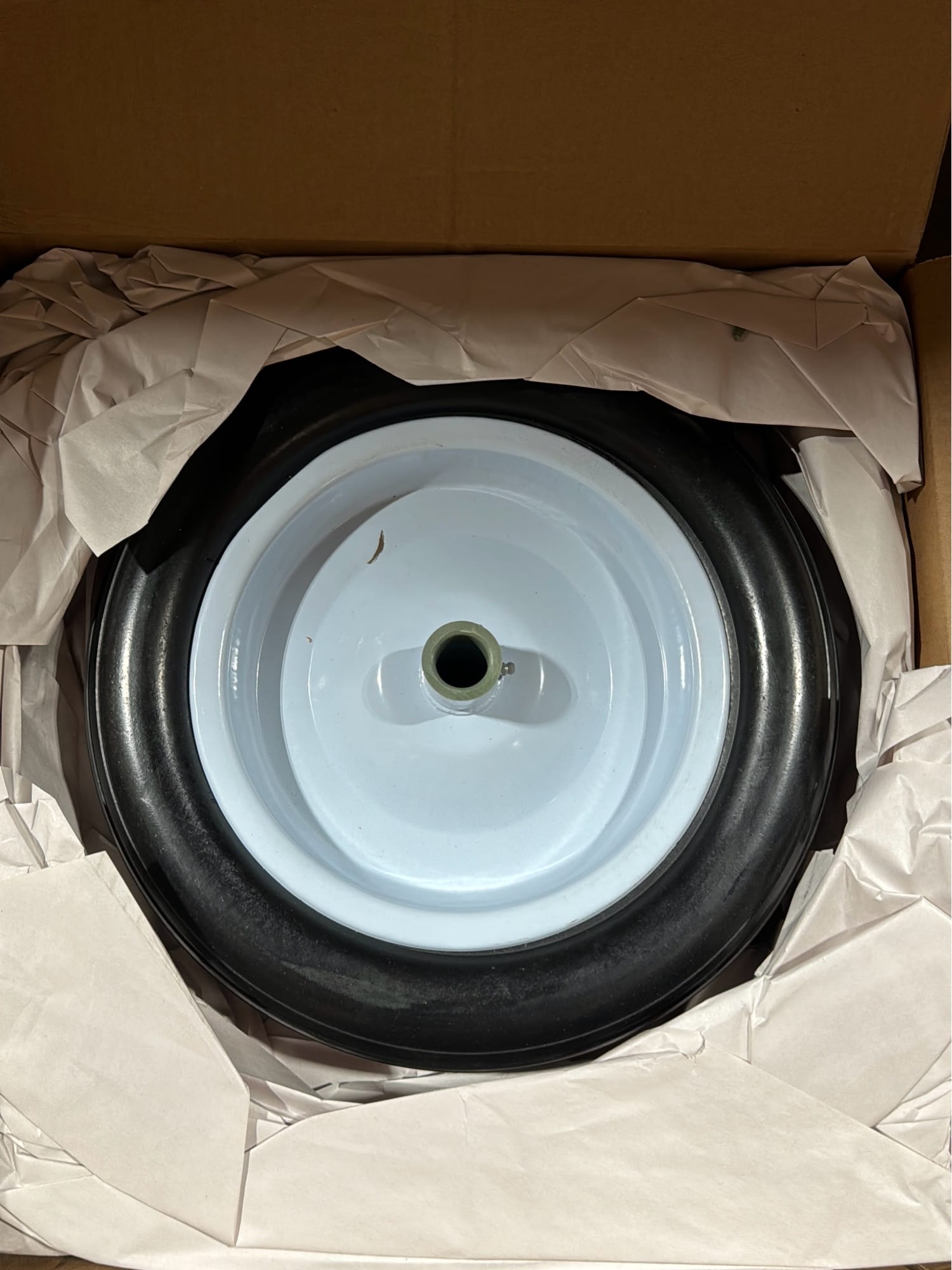 1619 50 gallon trash bin, missing lid, has a broken wheel