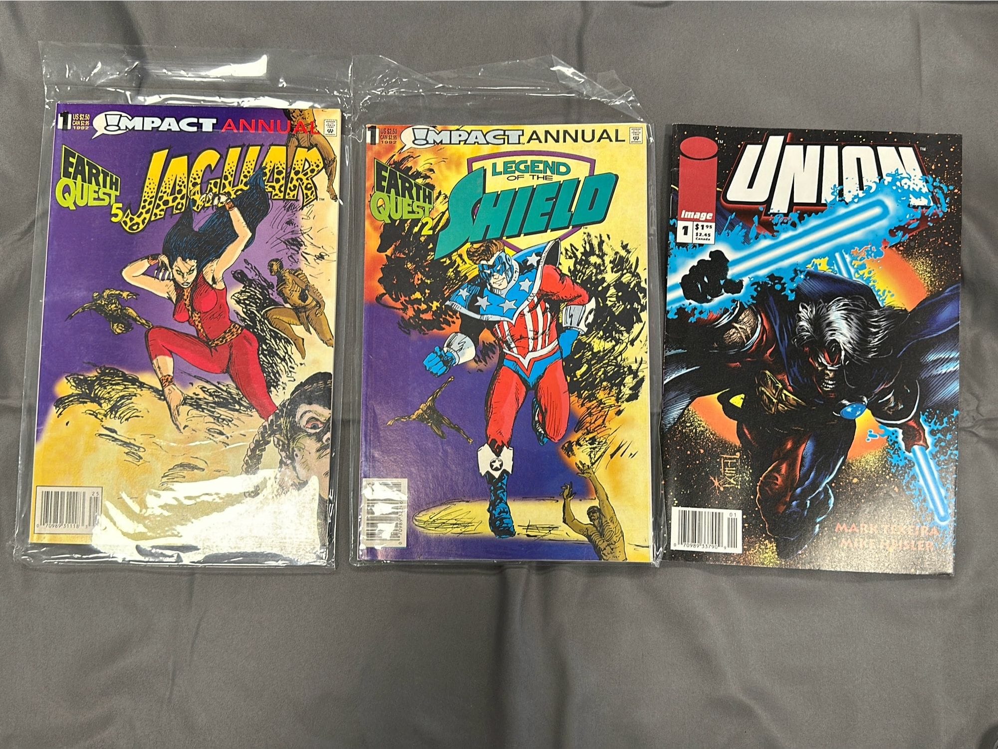 1613 3-Impact Legend of the Shield, Earth Quest Jaguar, and Image Union Comic Books