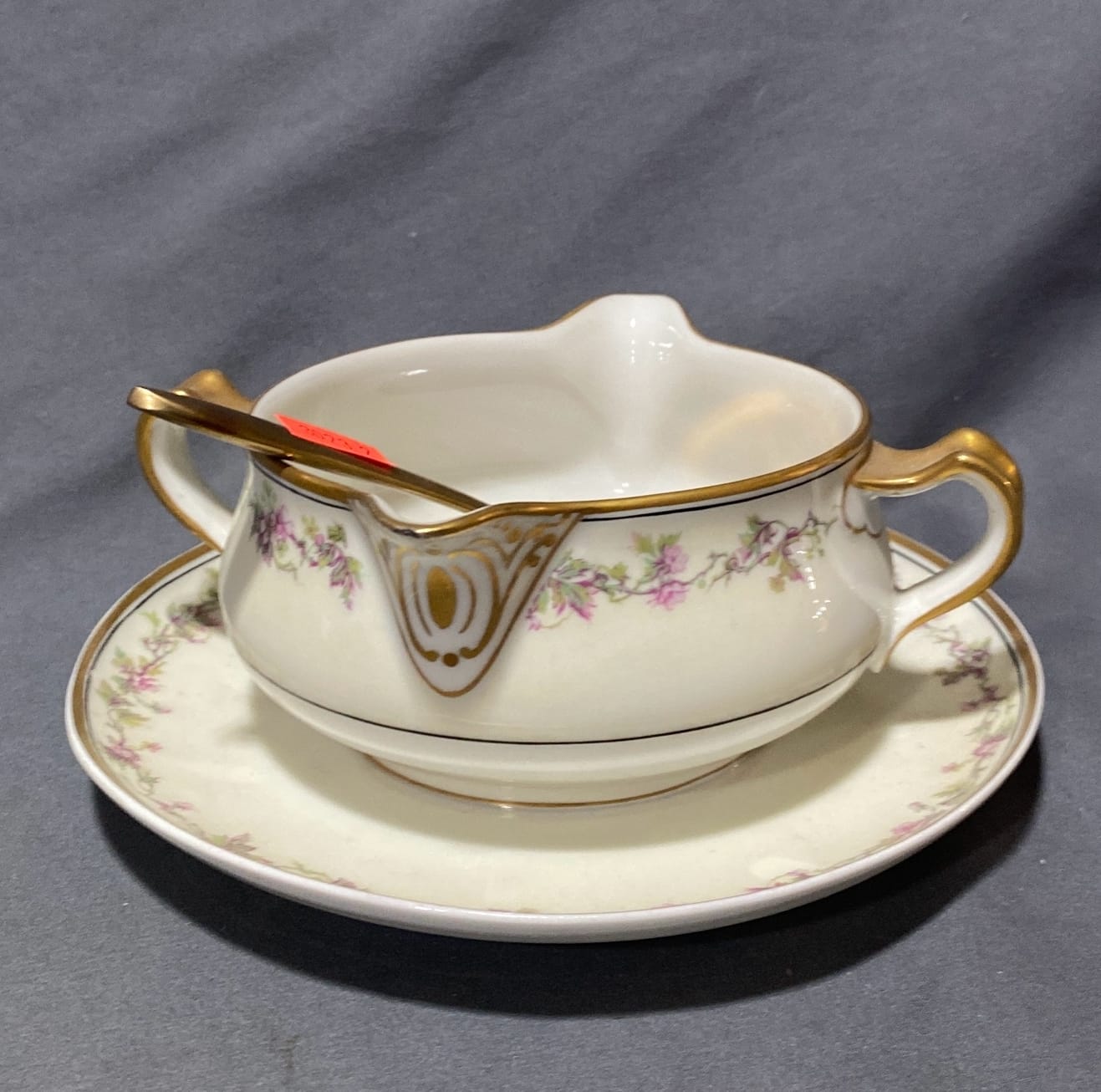 3026 G. Ahrenfeldt Limoges Gravy Boat with attached Plate 8.75” & 1847 Rogers Bros. IS “First Love” Spoon