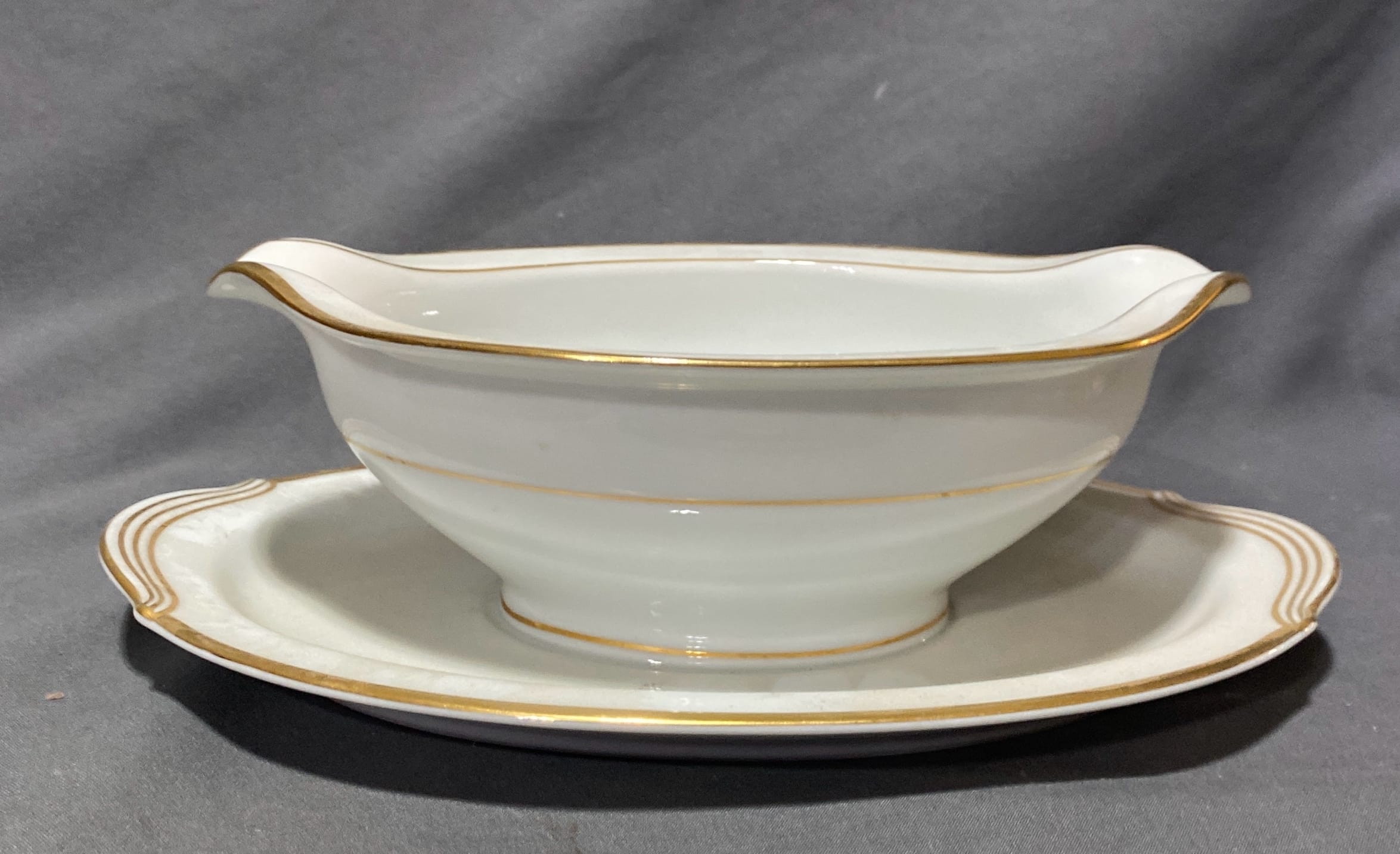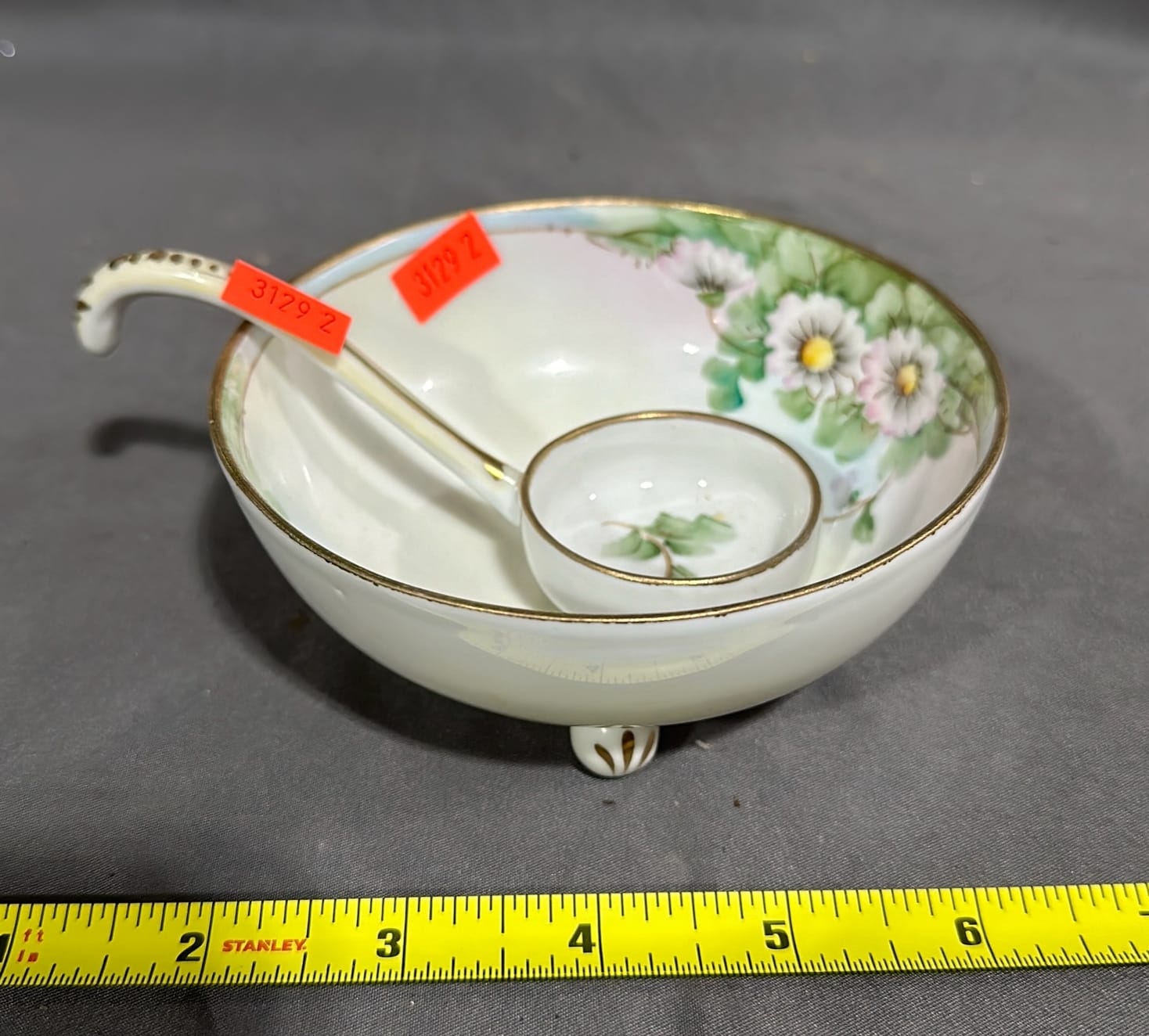 3023 Haviland & Co. Limoges Sauce Bowl & Saucer Double Handle Gold Trimmed 6.75” & Gold Tone Spoon 5.25”