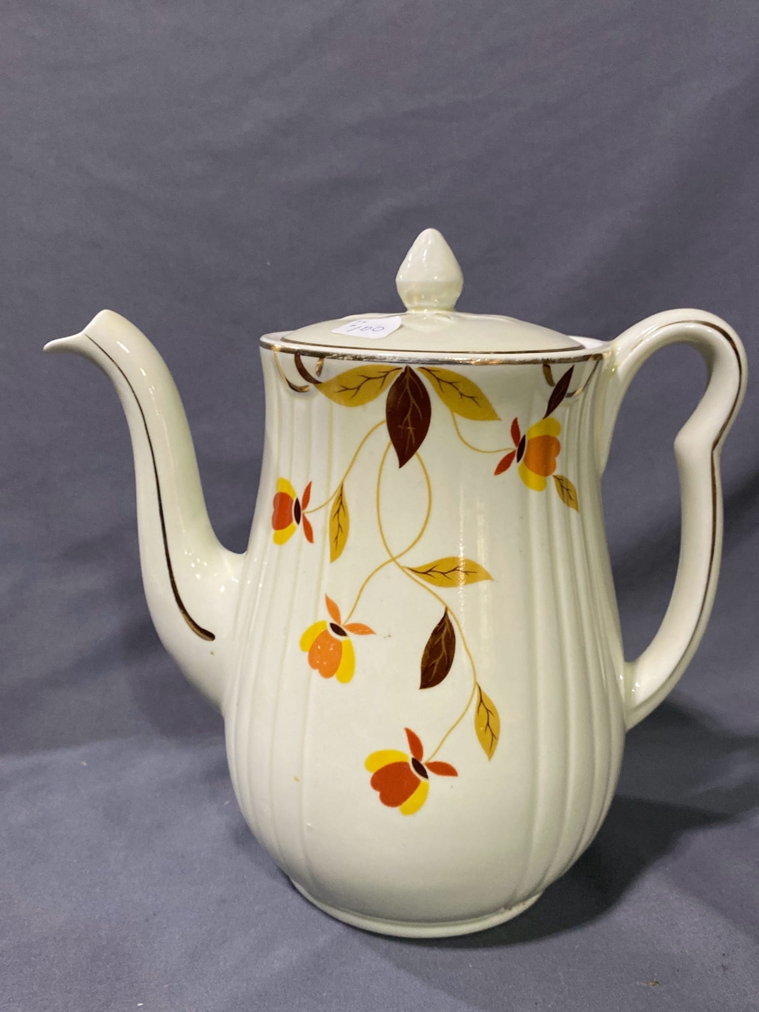 3093 Hall autumn leaf teapot, creamer & sugar, teacup, saucer