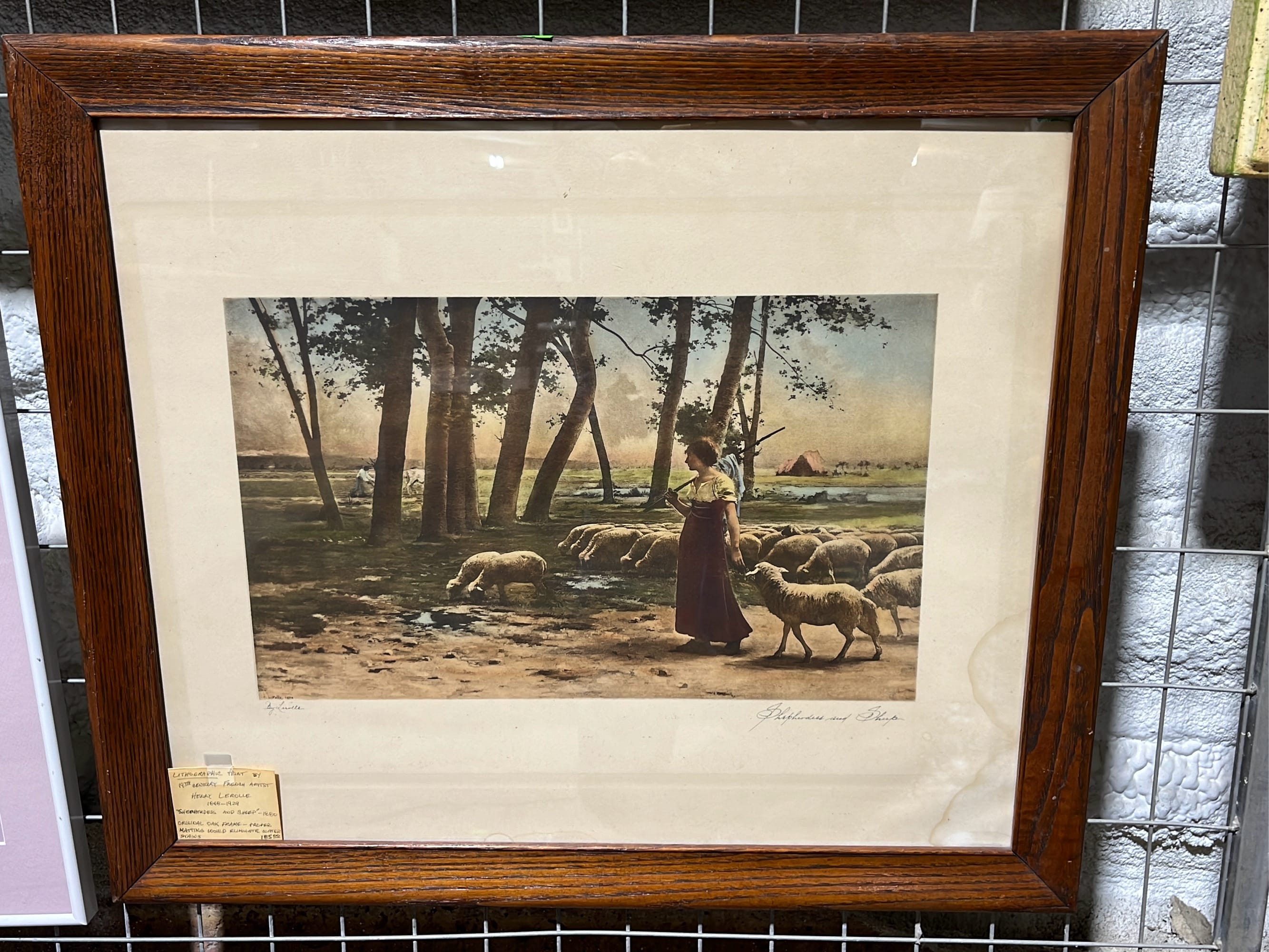 3773 Framed Henry Lerolle 'Shepherds & Sheep' Lithograph in original Frame, some staining 27.5x23.5"