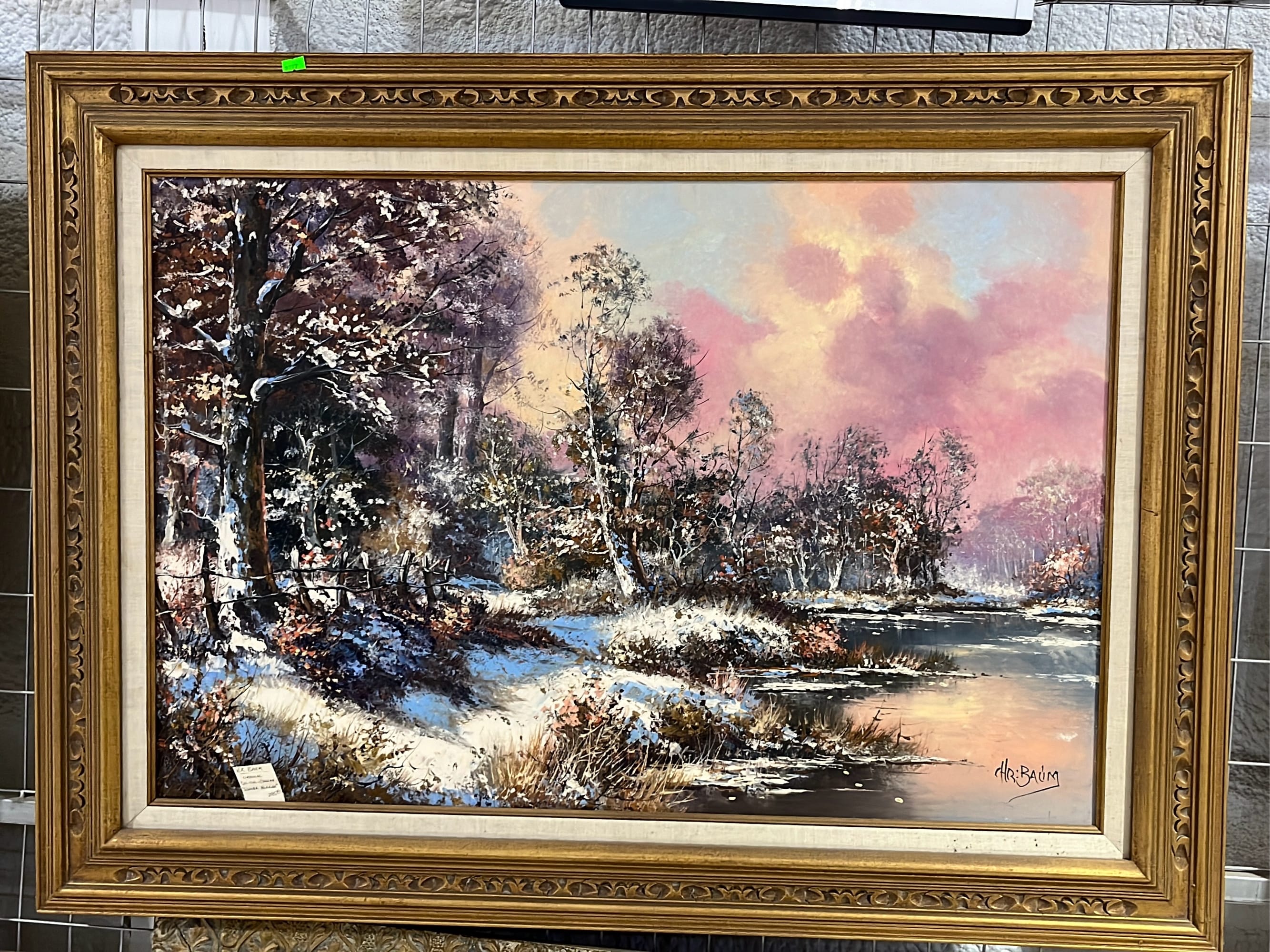 3777 Ornate Framed H.R. Baum oil on canvas painting "Winter Morning" 44.5x32.5"