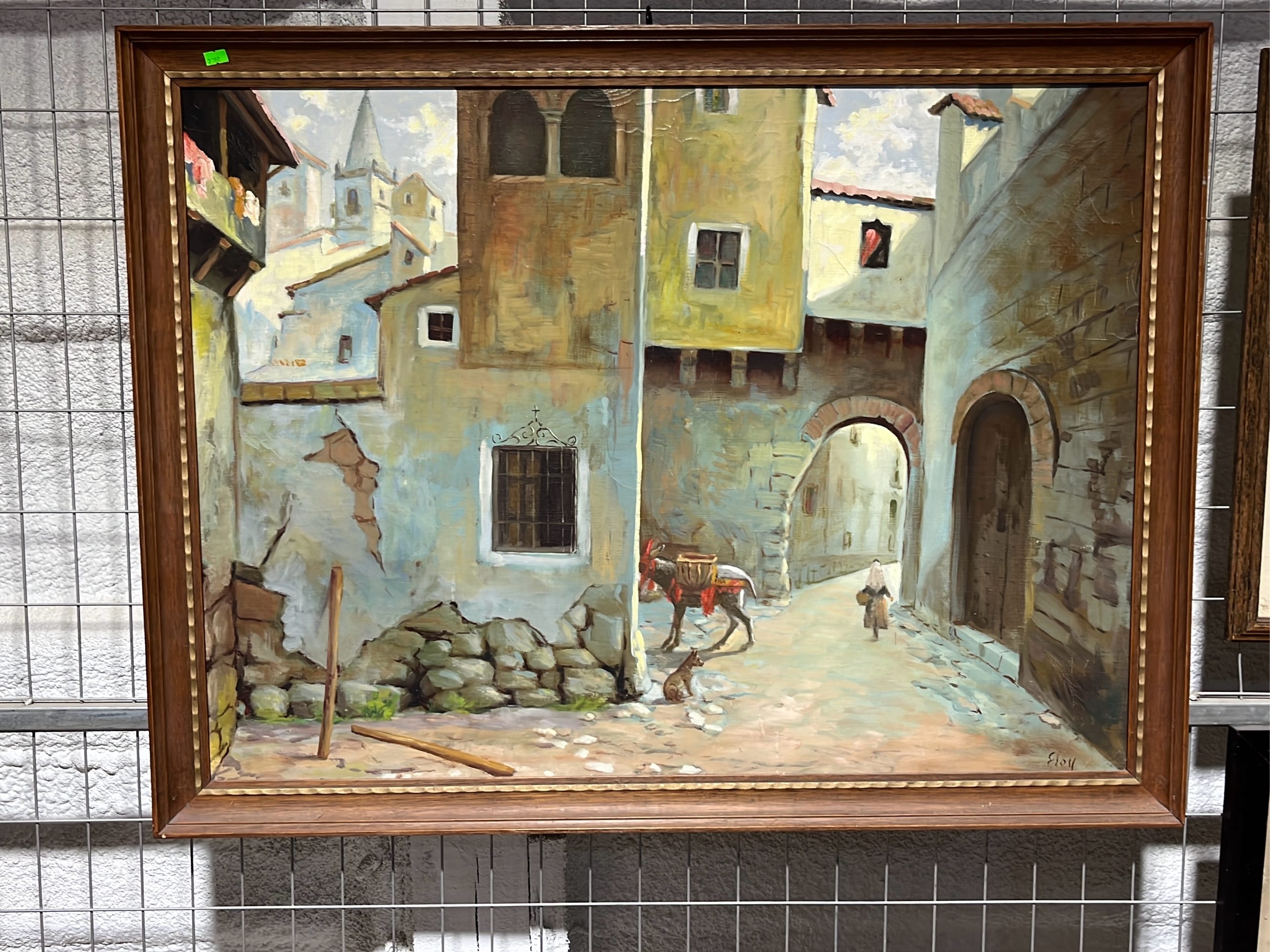 3782 Eloy oil on canvas Street scene painting framed 42x32" with cracking in paint