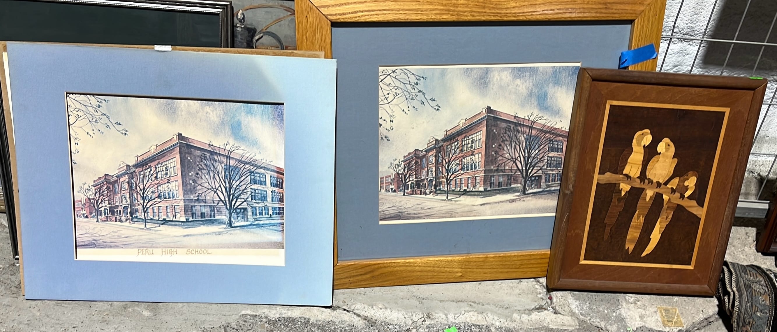 3786 Peru High School watercolors '76, by Wayne Taylor & framed & Multi wood Parrot picture