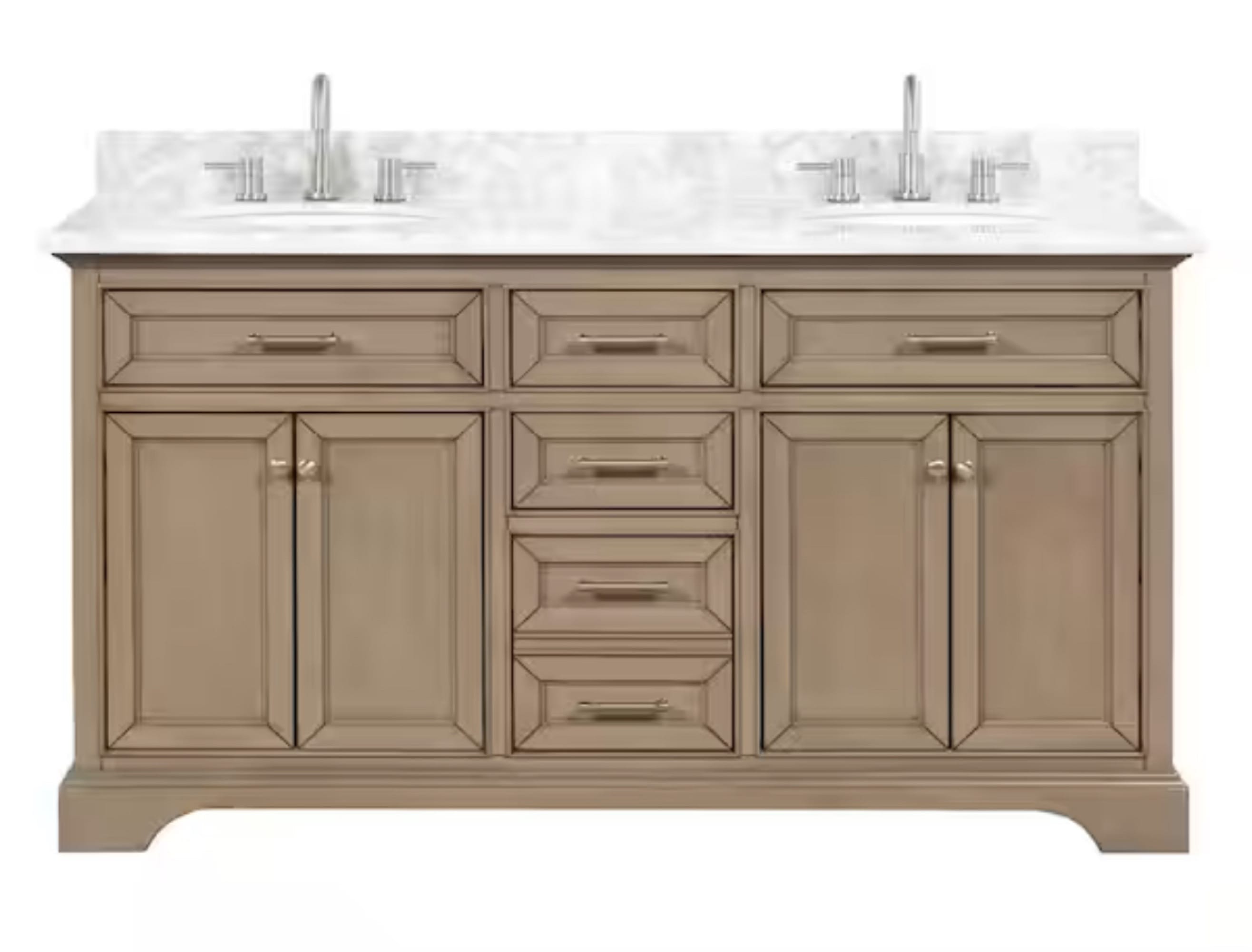 41 Home Decorators Collection Windlowe 61 in. W x 22 in. D Bath Vanity in Almond Taupe with Carrara Marble Vanity Top in White, Top drawer jammed