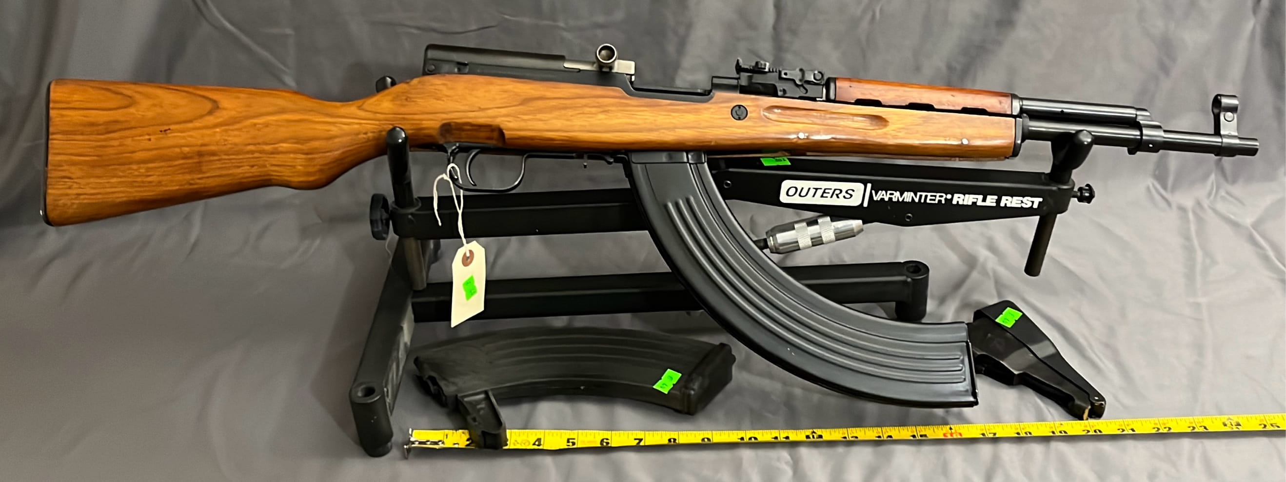 7 SKS China 7.62 semi automatic rifle with 3 clips, serial 1615373 - rifle rest not included