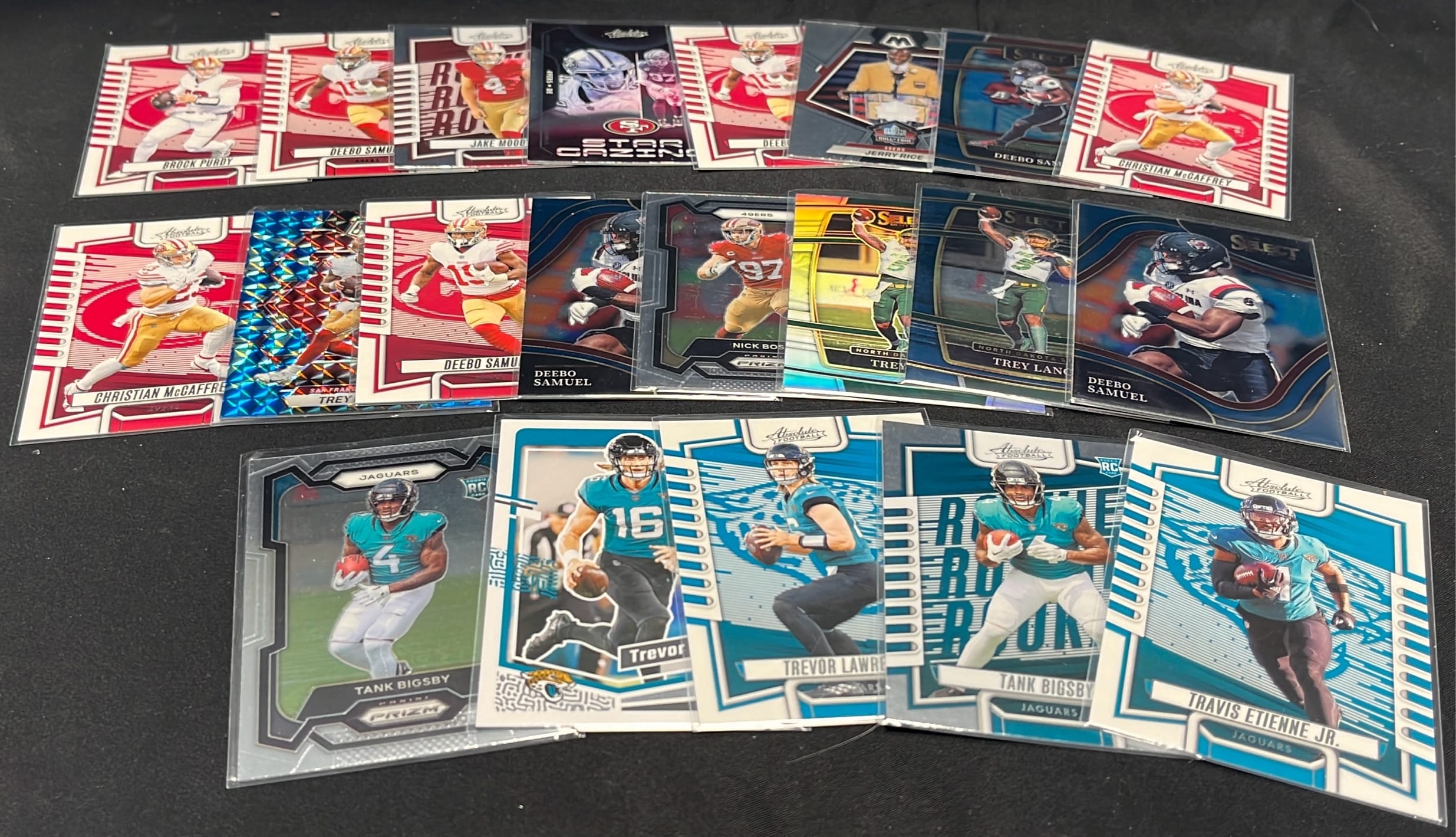 6239 49ers & Jaguars Football Card Assortment inc Tank Bigsby, Christian McGaffrey, Jerry Rice