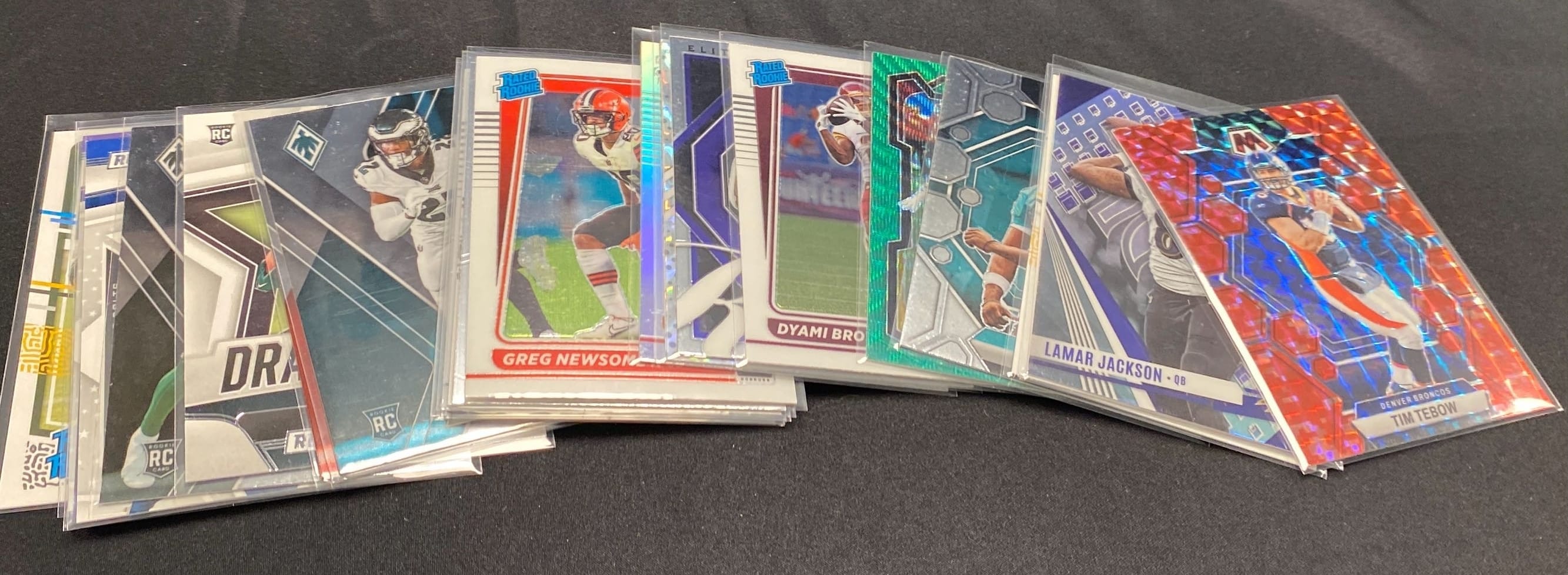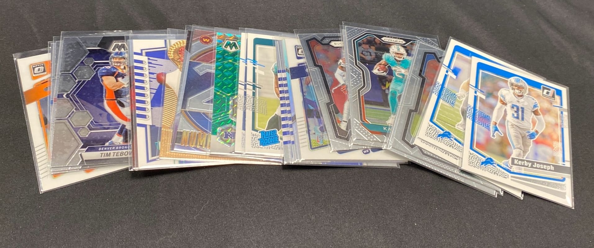 6259 Football card assortment inc Kerby Joseph, Tim Tebow, Josh Reynolds