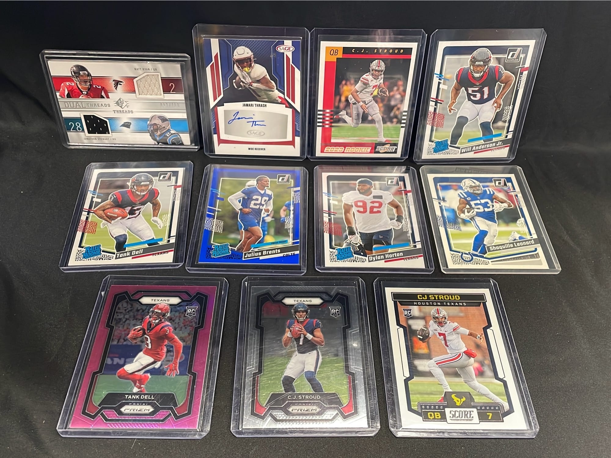 6311 11 - Football Card Assortment Including: Jamari Thrash Autograph Card, Dual Threads Matt Ryan and Jonathan Stewart and Rookies Tank Dell, Julius Brents, Dylan Horton, Will Anderson, Jr., C. J. Stroud