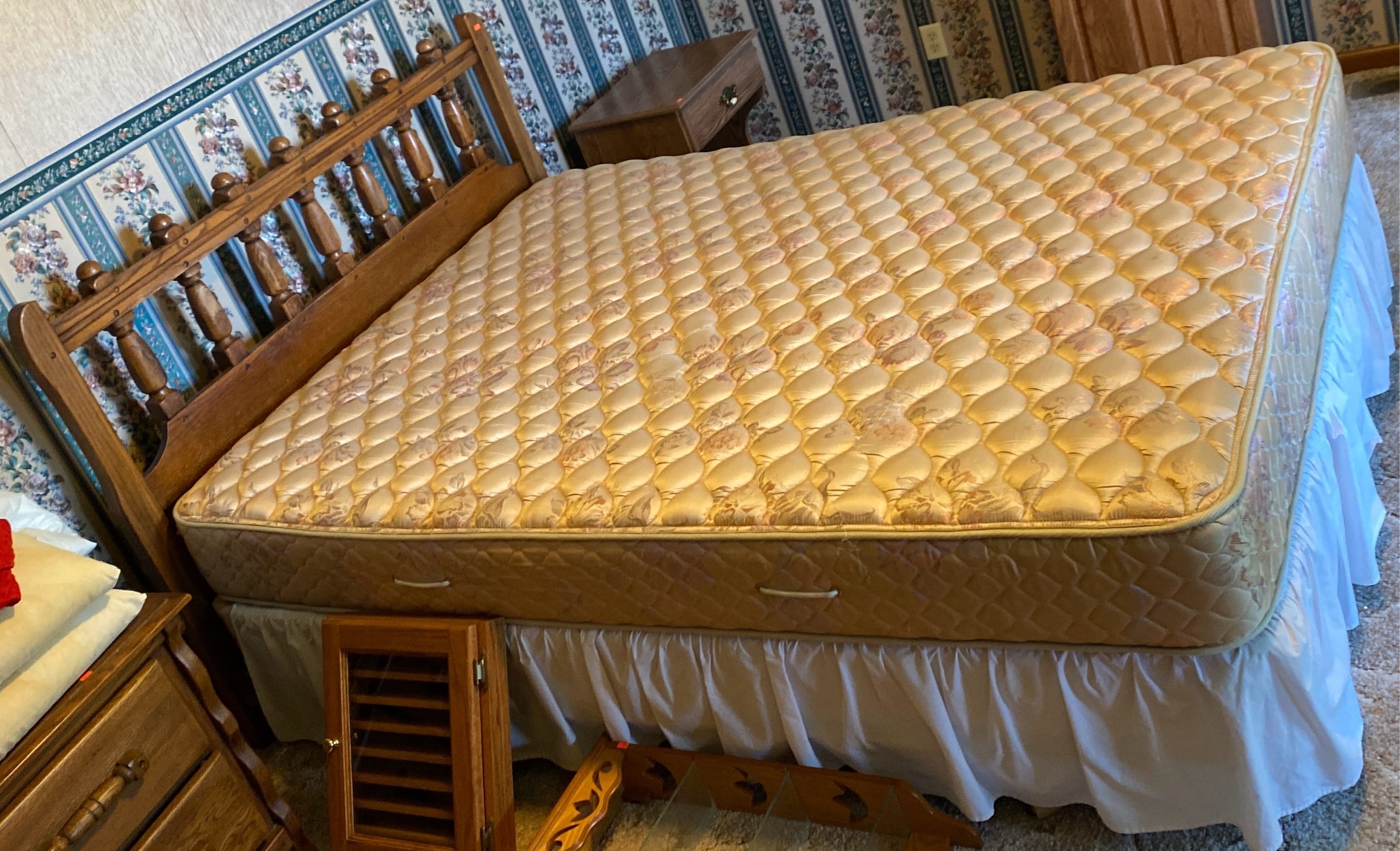 130 Wood bed frame queen bed with mattress and box spring 62”x 80”