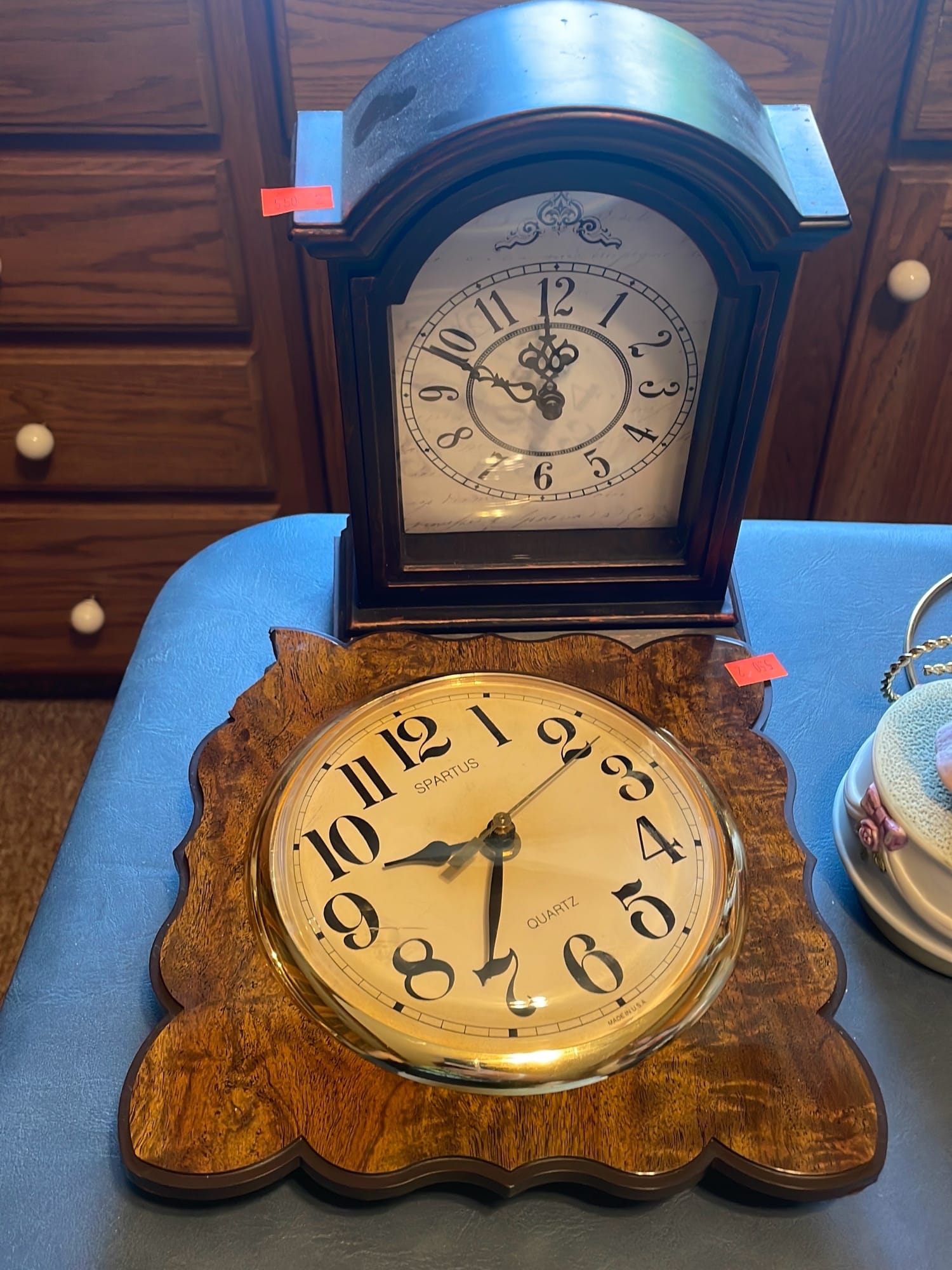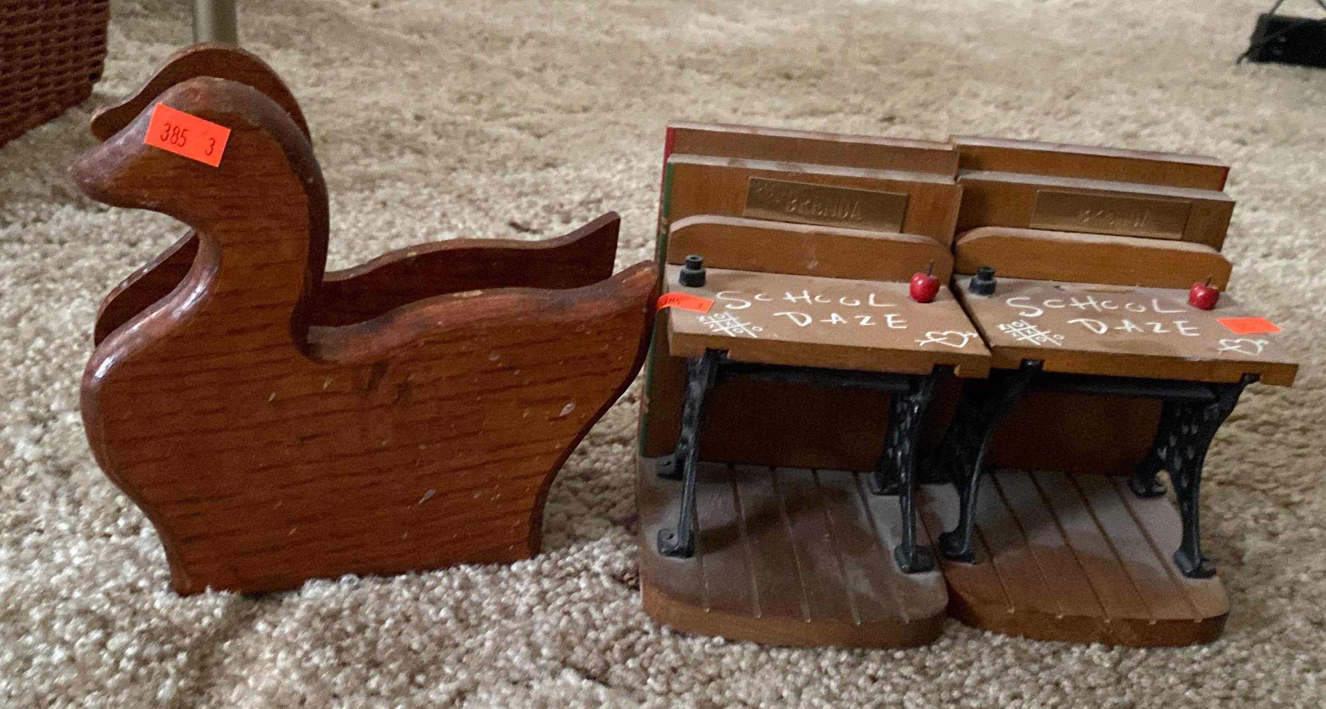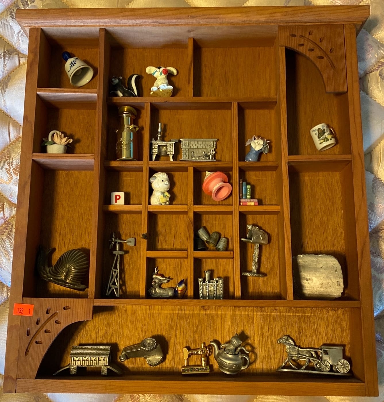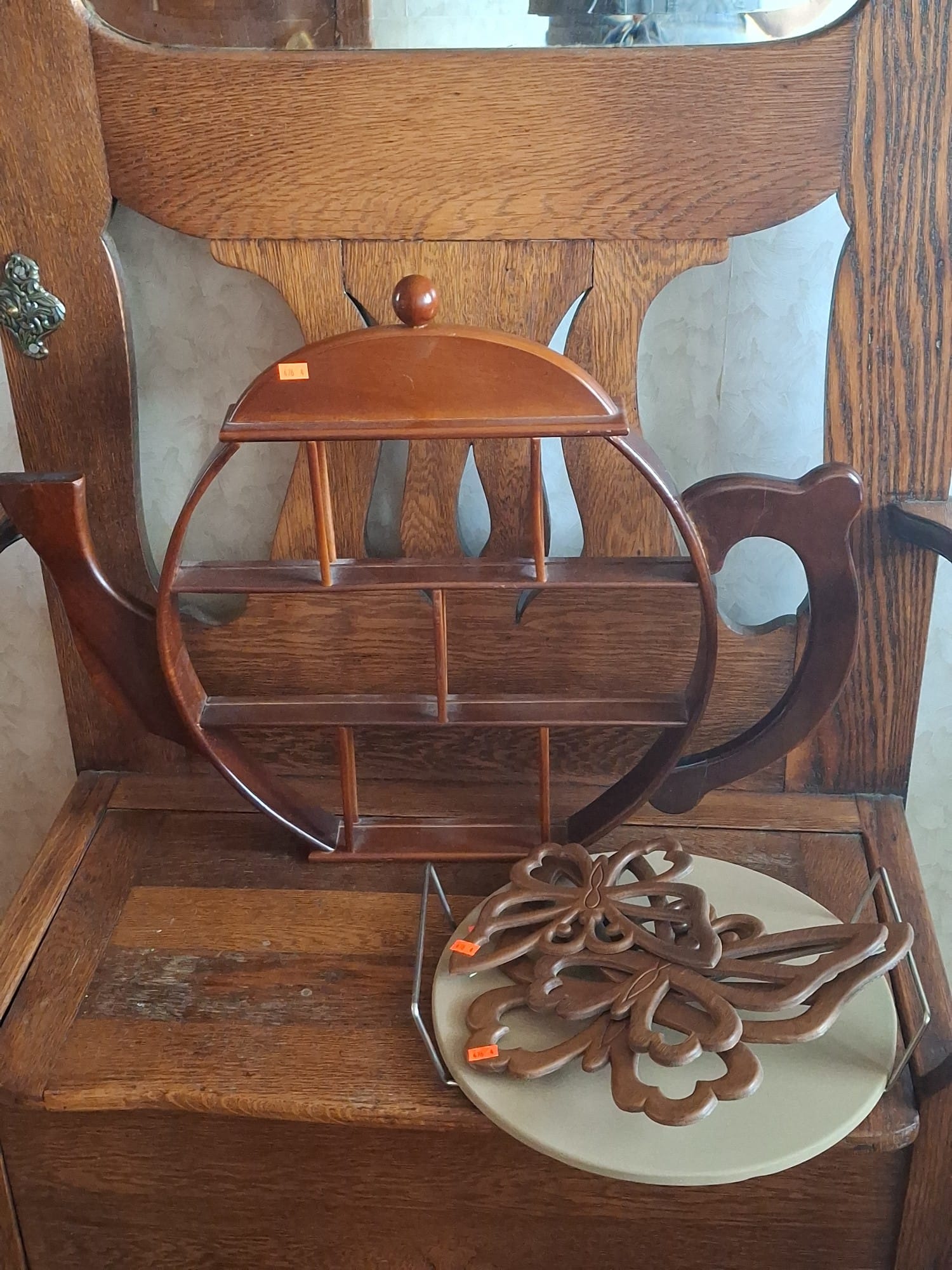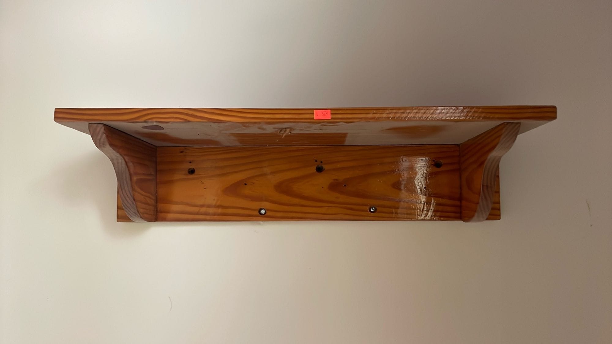 132 Wood wall shelf w/ trinkets 16.25”x 15.75”