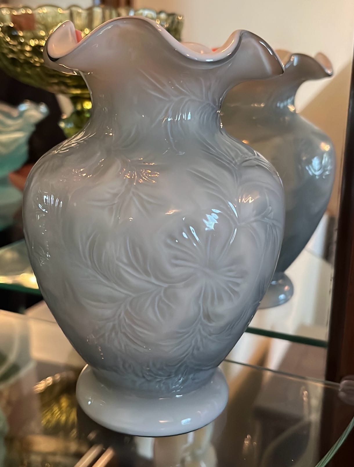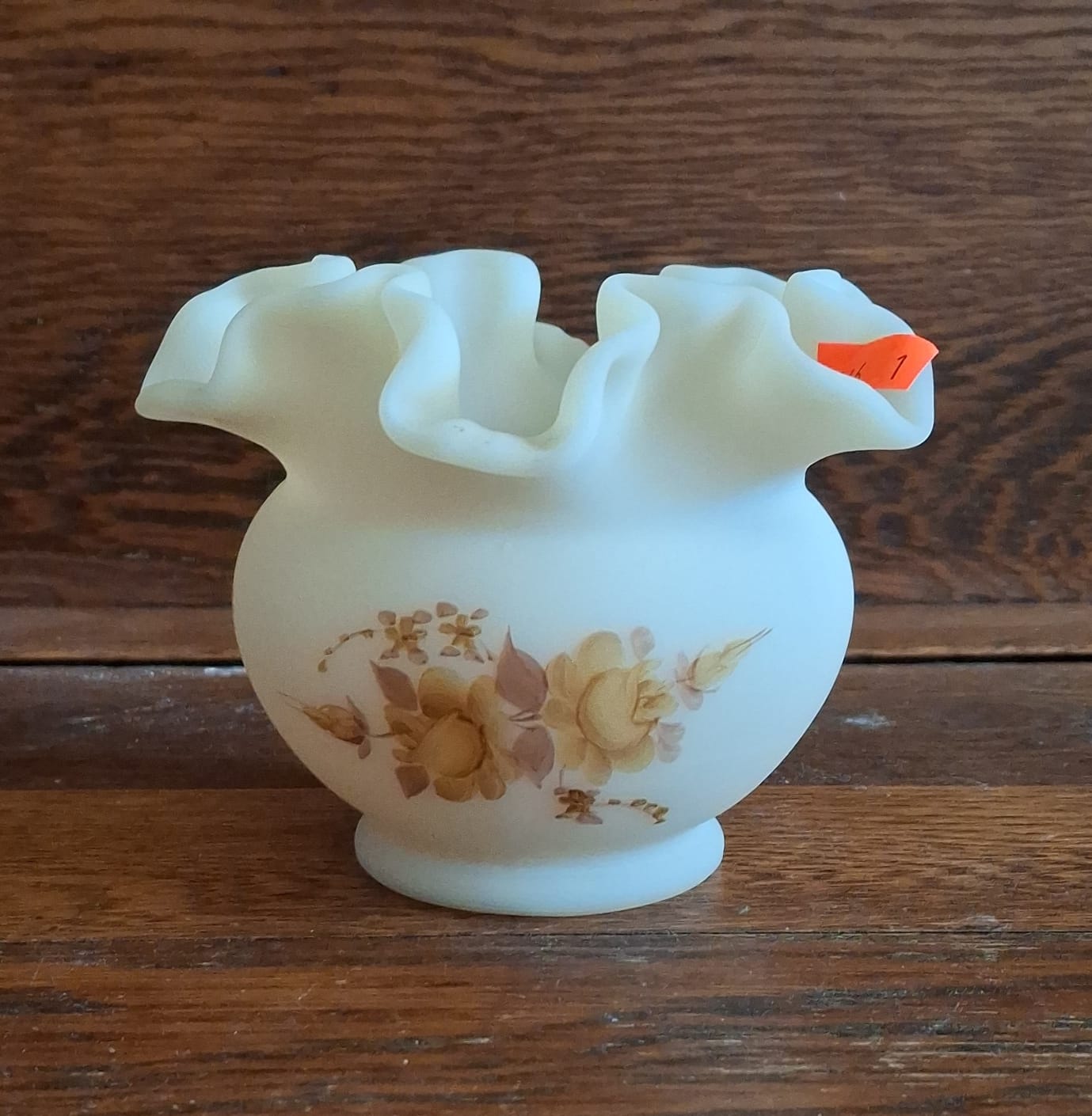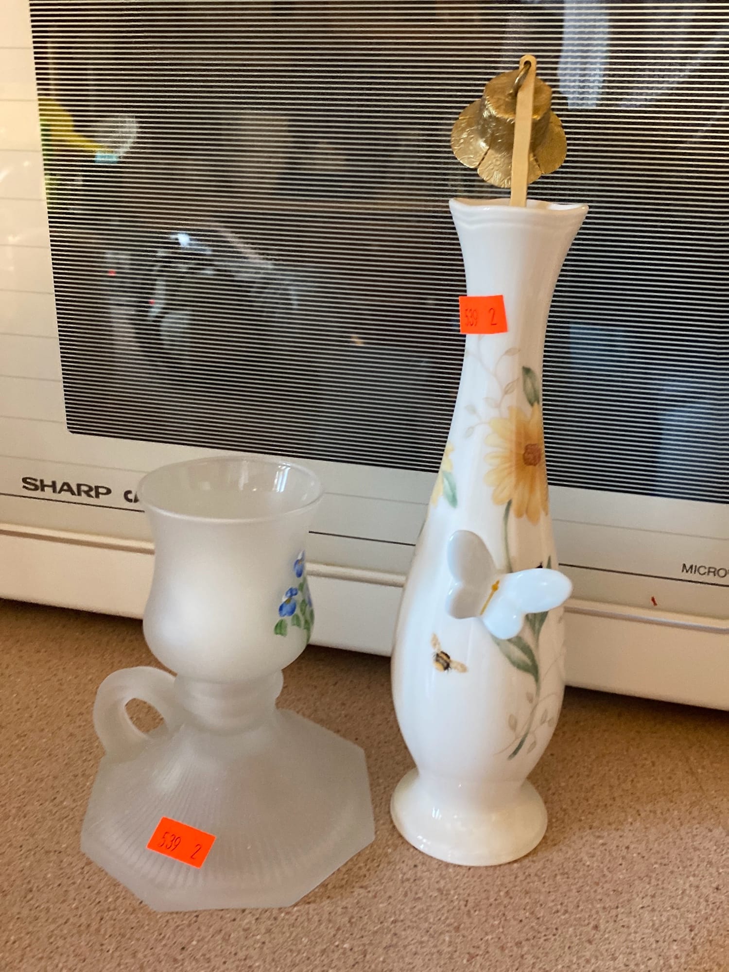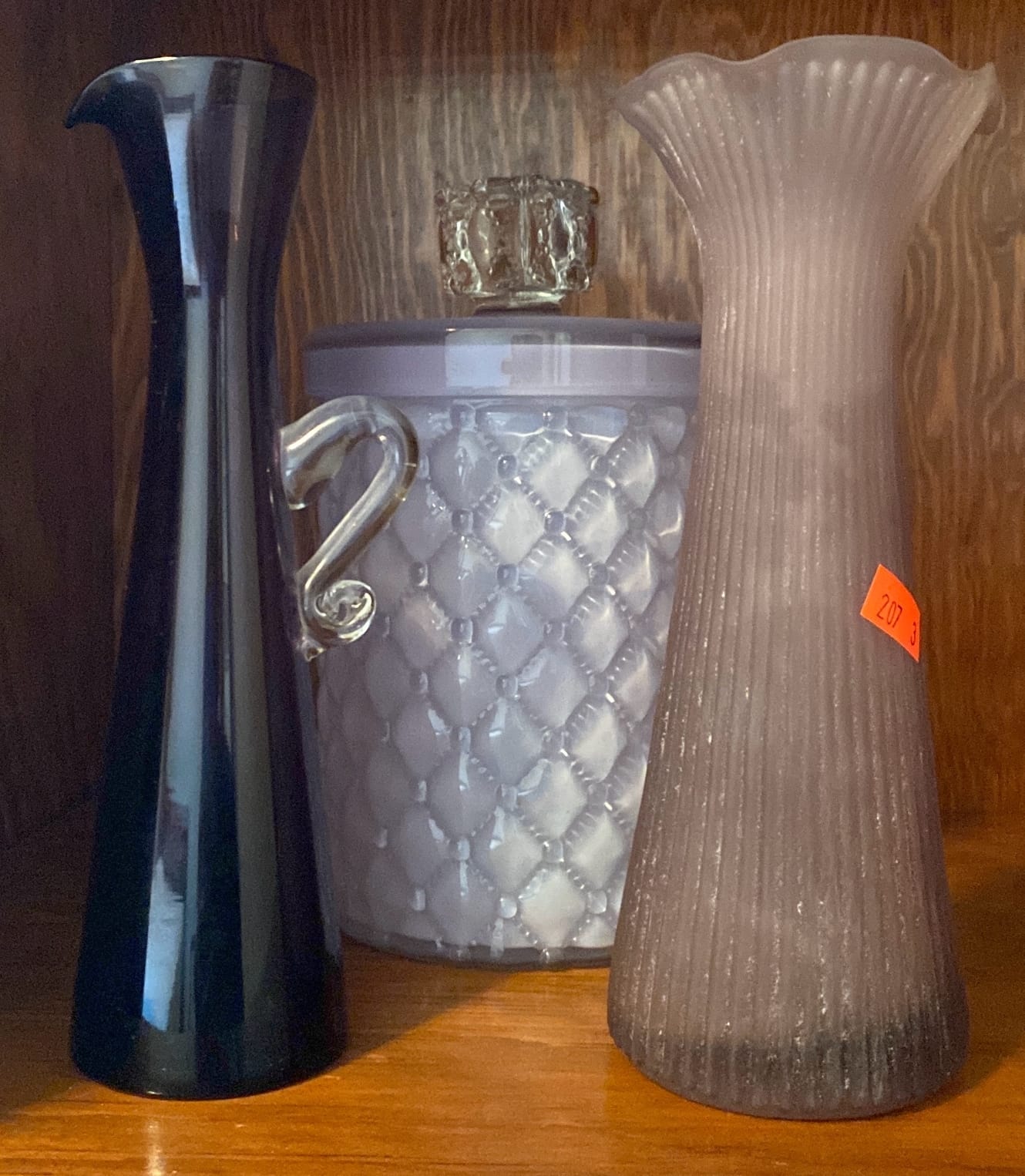 207 Amethyst art glass vase w/ handle 8”, frosted glass purple vase 8”, lavender glass jar w/ lid 8”