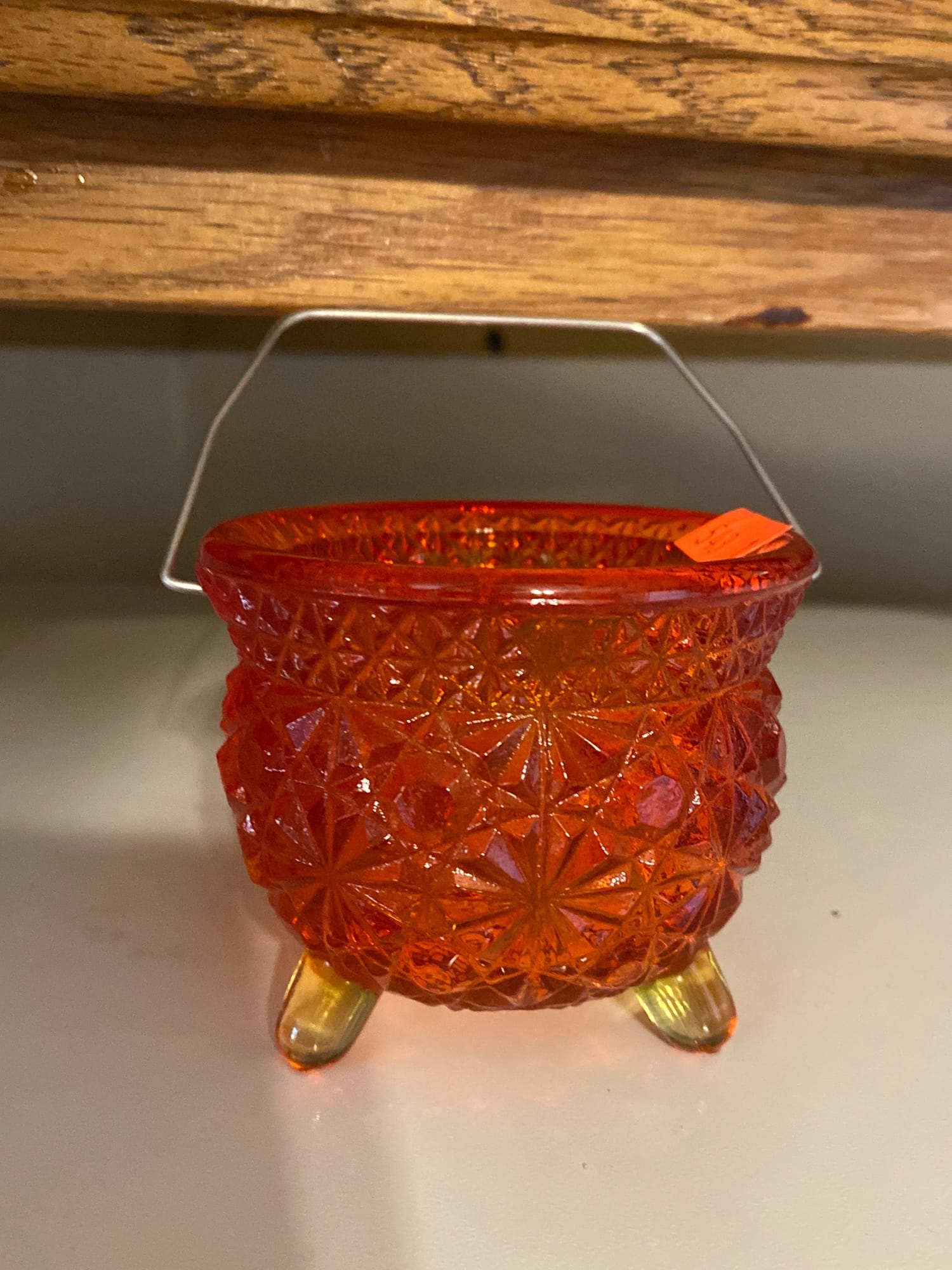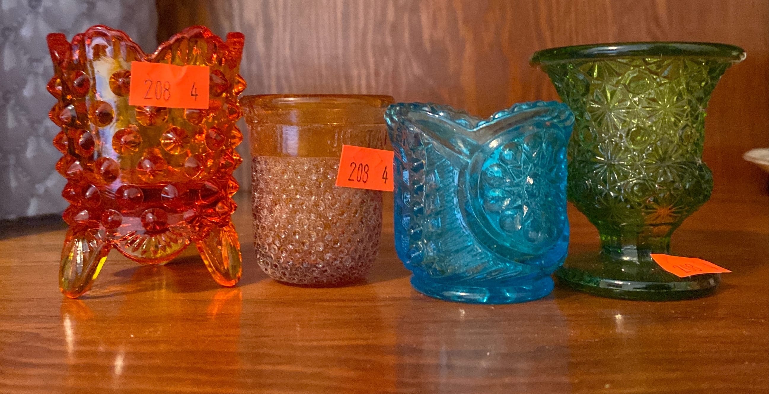 208 4 - Toothpick holders includes Amberina hobnail, green glass daisy & button 2”, 3”