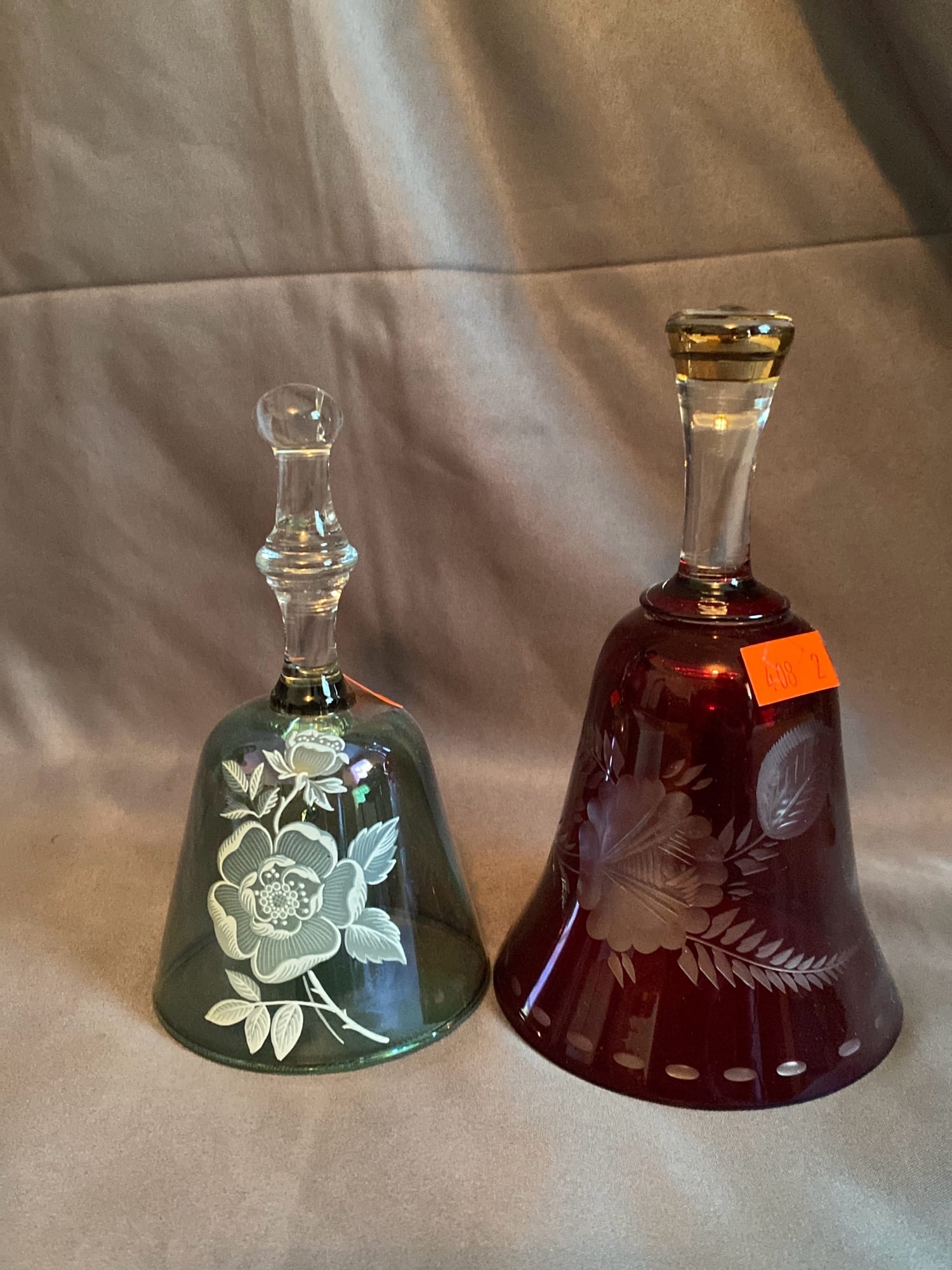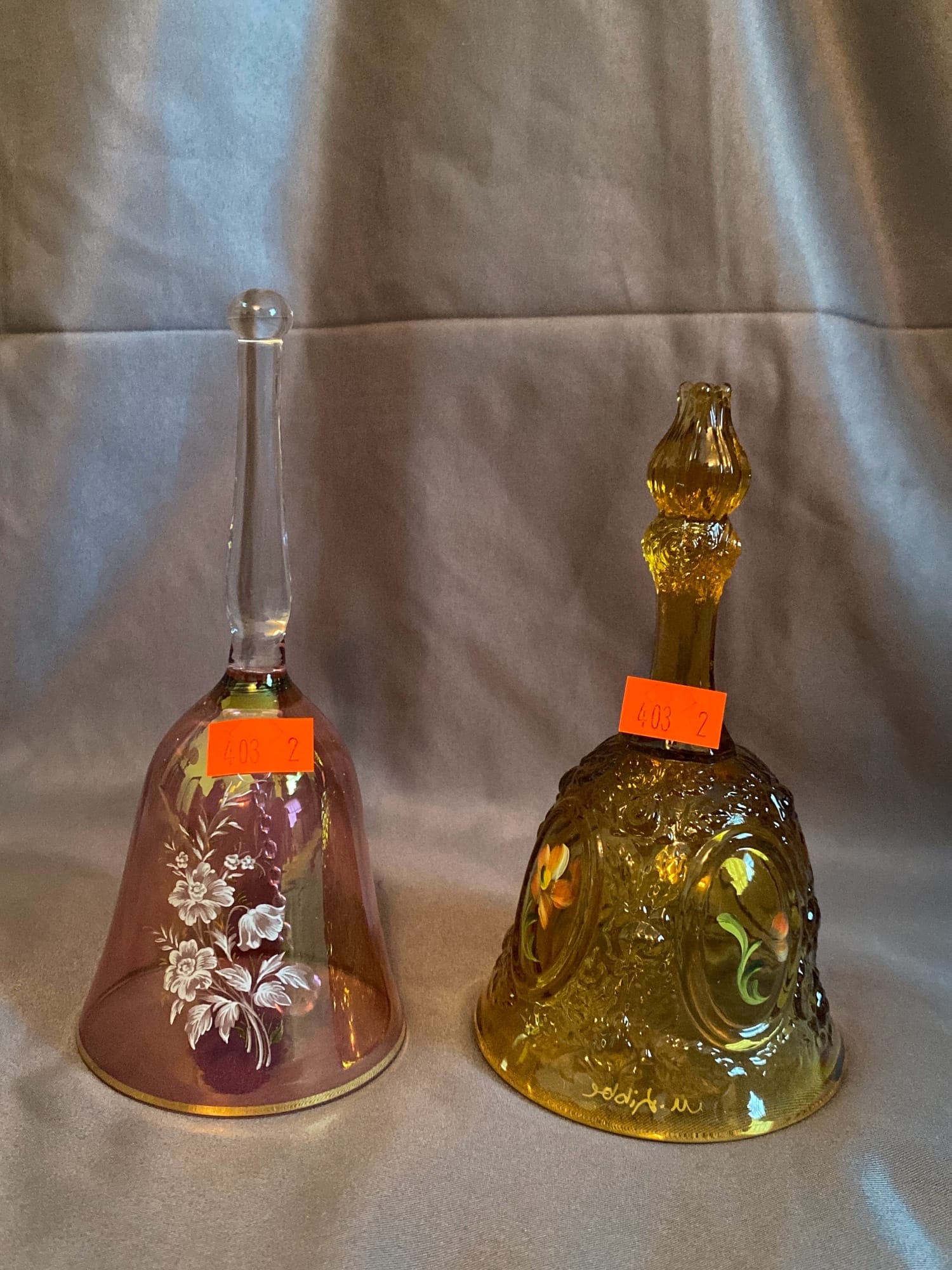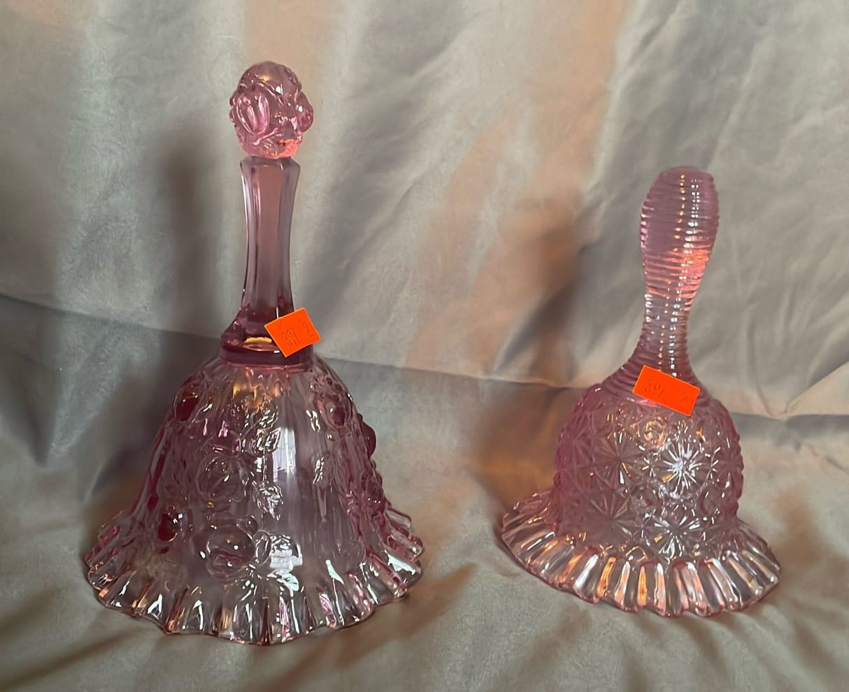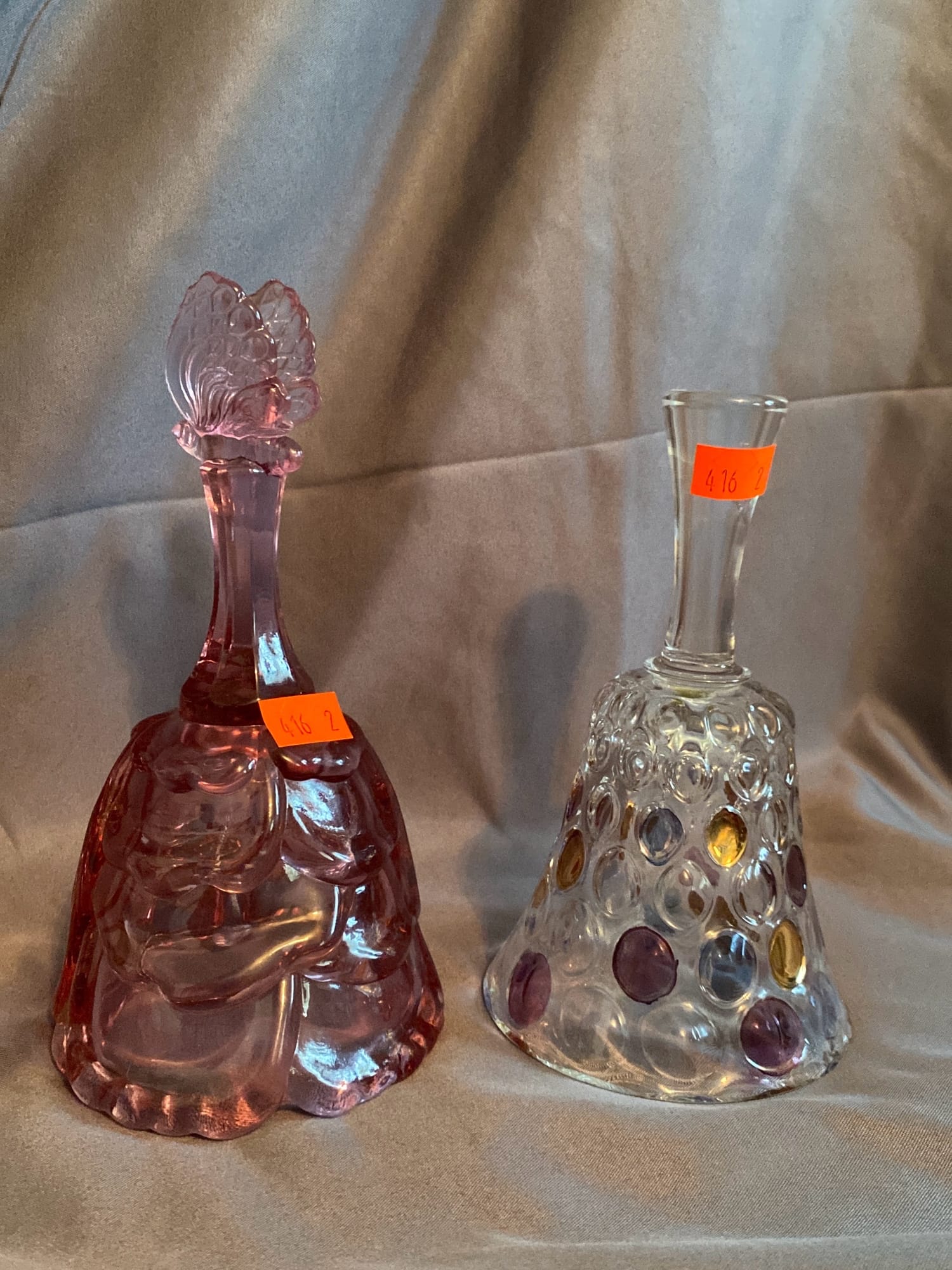 212 3 - Bells inc. pink hobnail, blue glass, green glass 5.5”, 6”