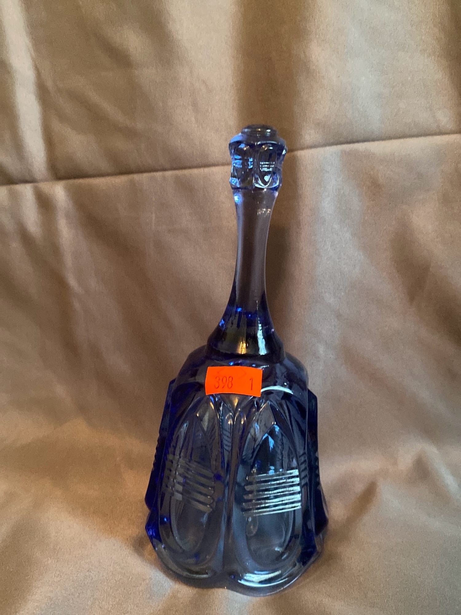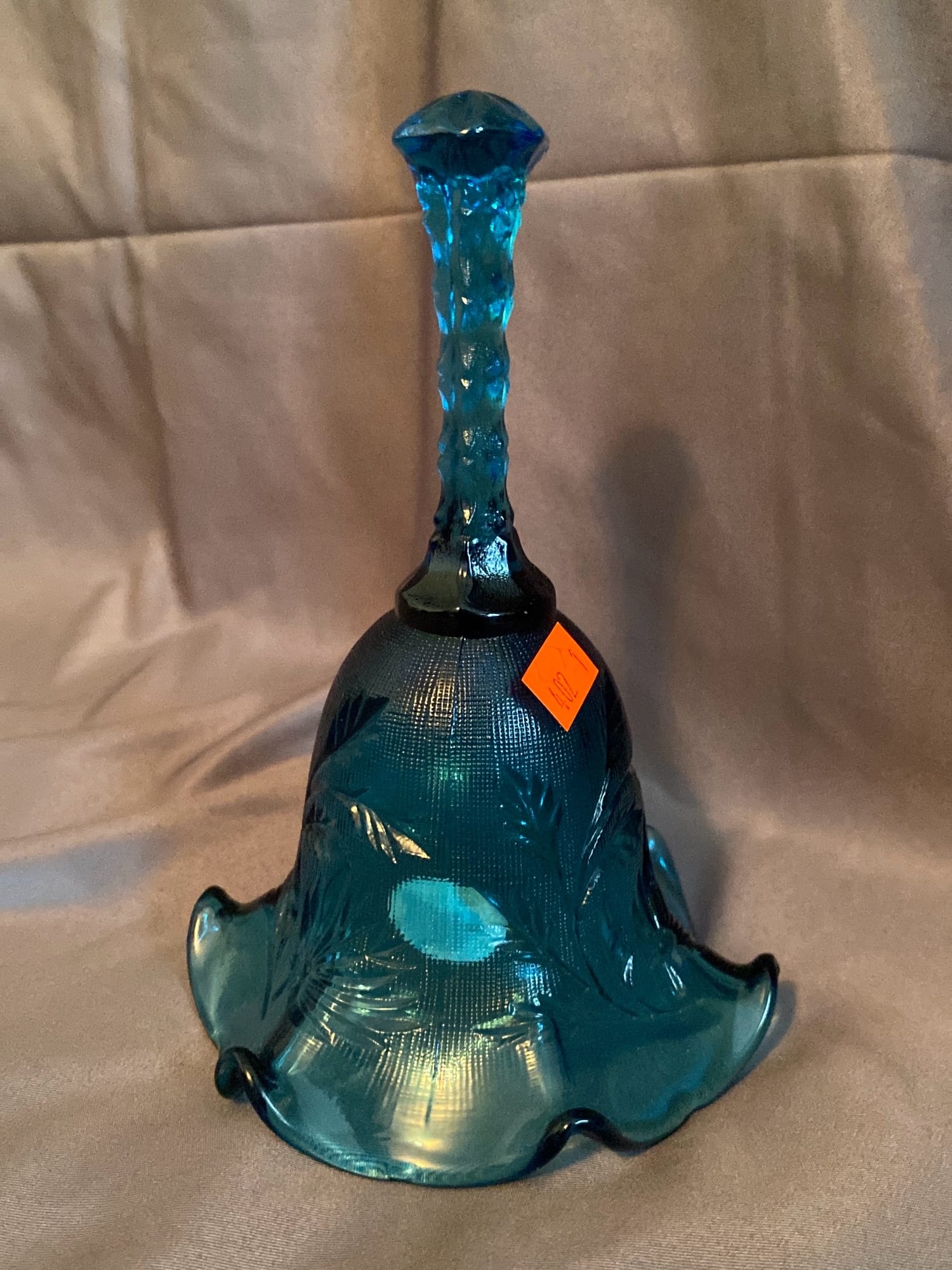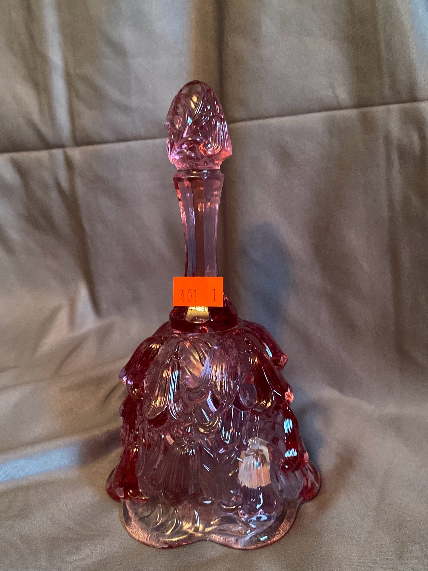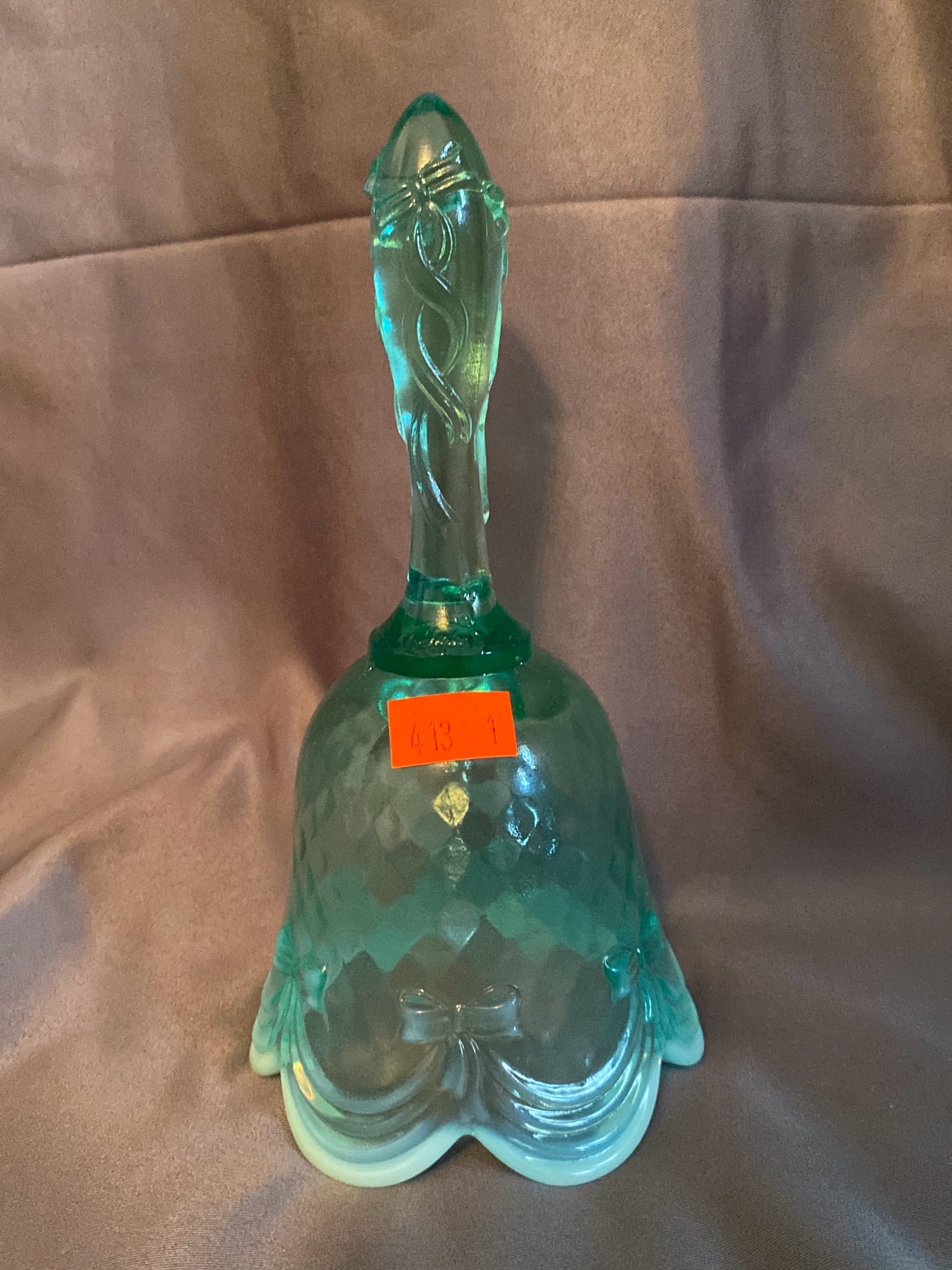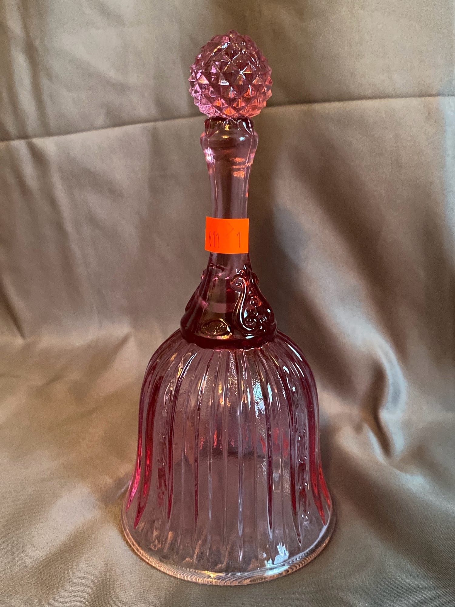 212 3 - Bells inc. pink hobnail, blue glass, green glass 5.5”, 6”