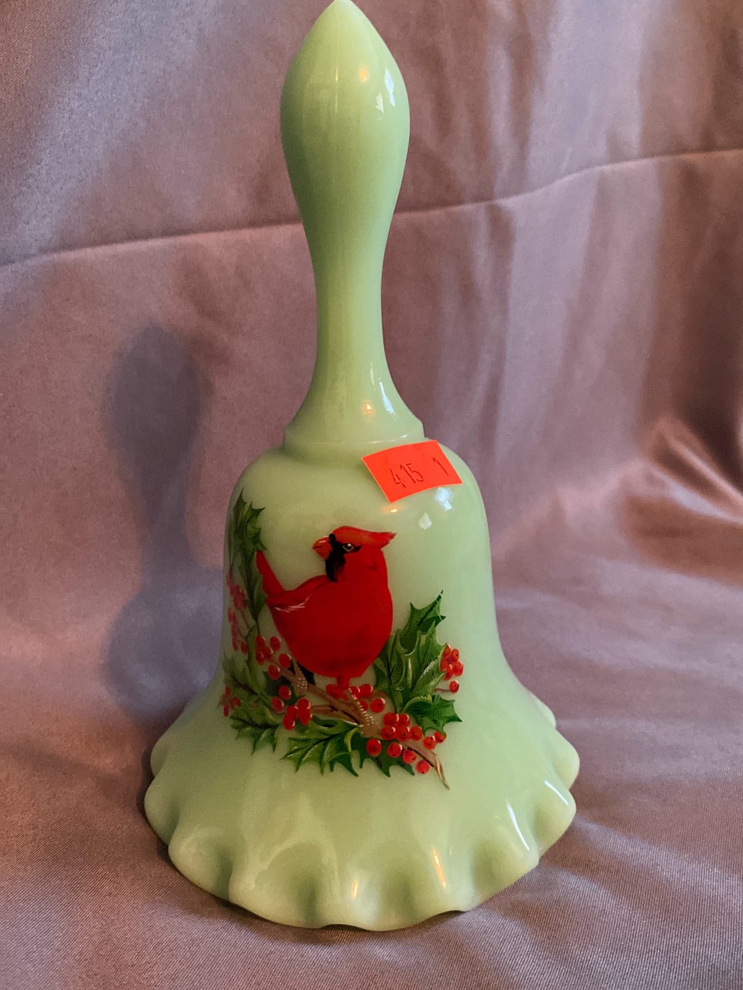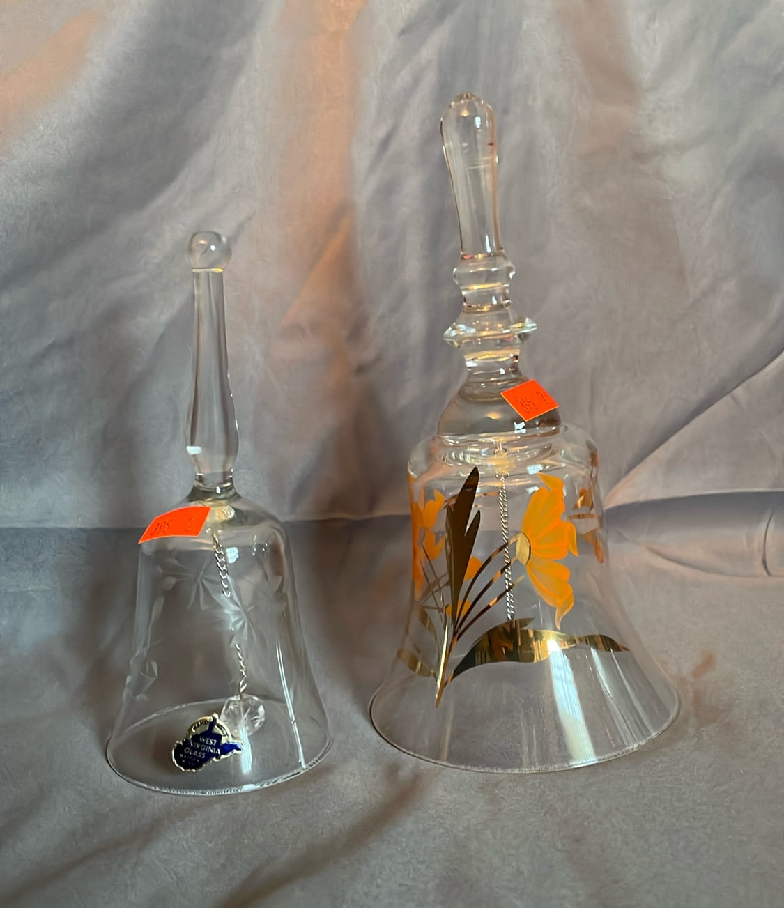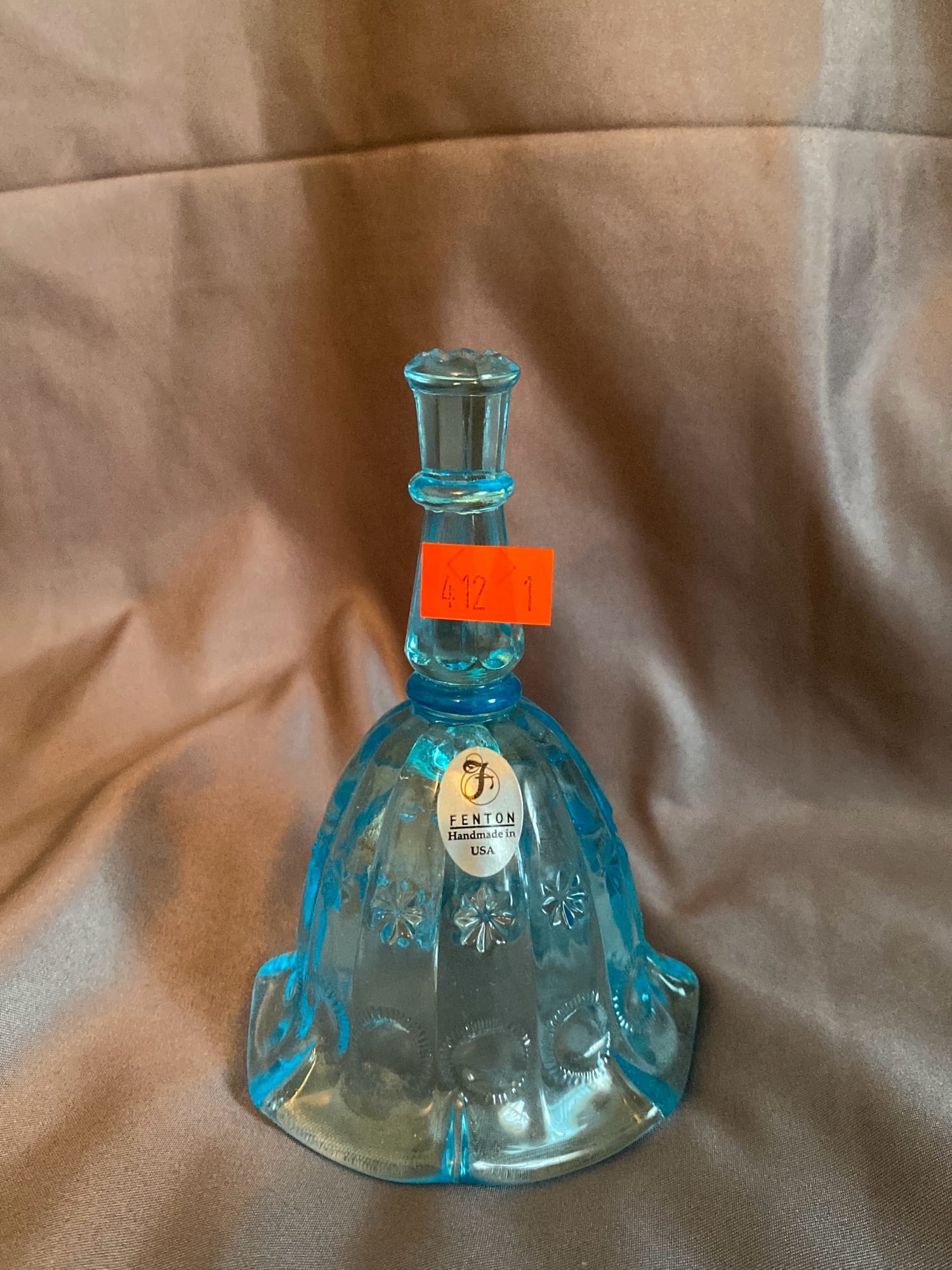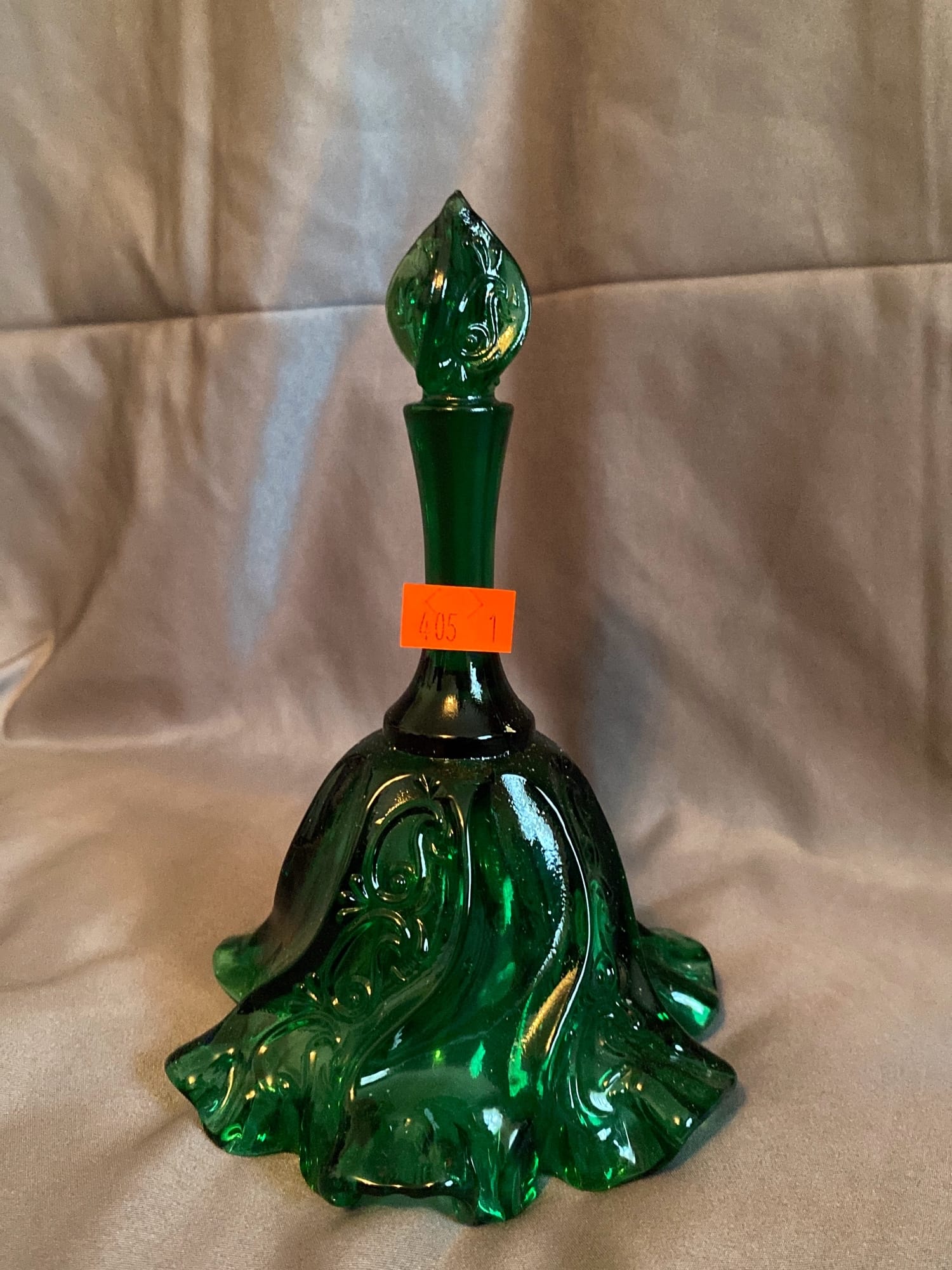 212 3 - Bells inc. pink hobnail, blue glass, green glass 5.5”, 6”