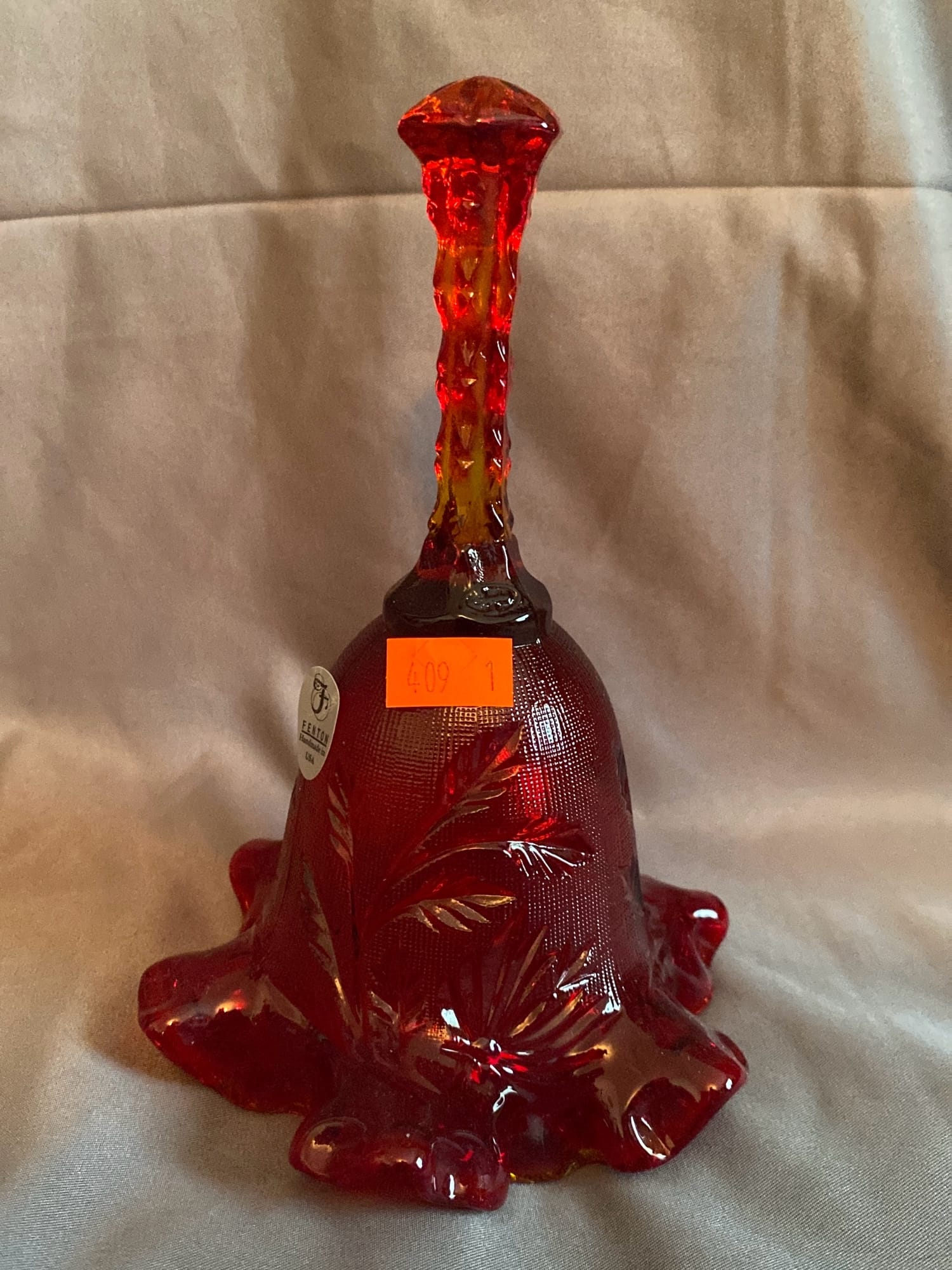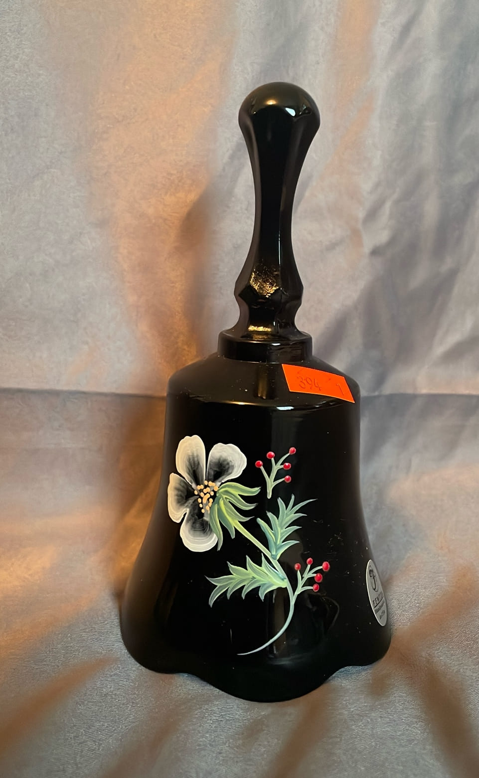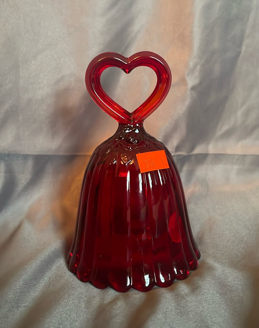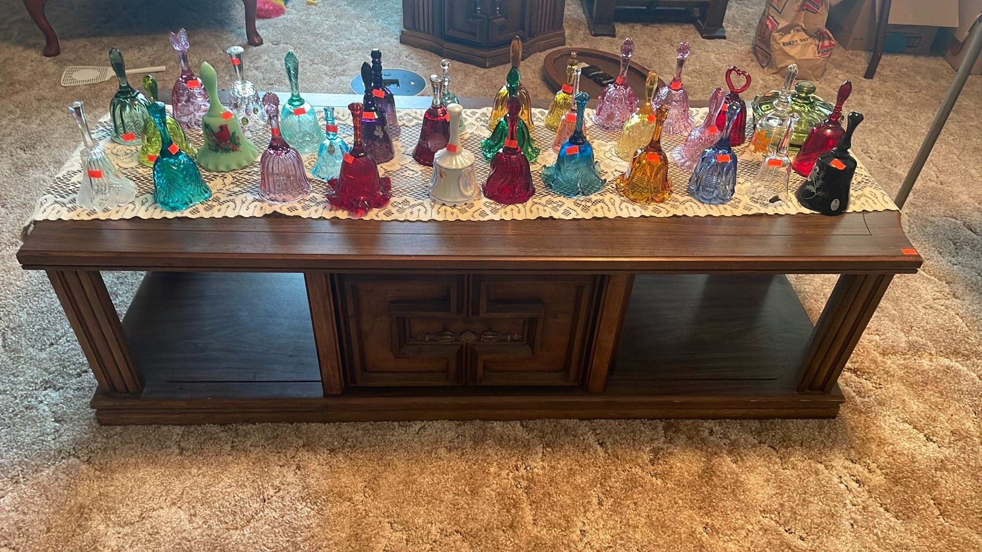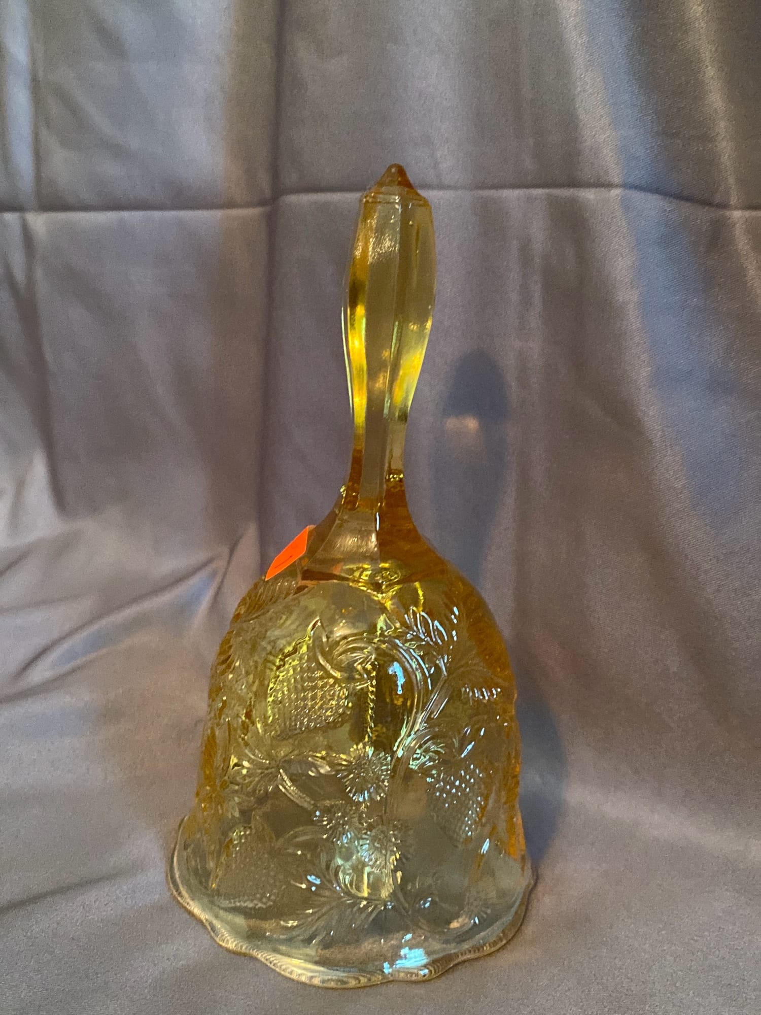 212 3 - Bells inc. pink hobnail, blue glass, green glass 5.5”, 6”