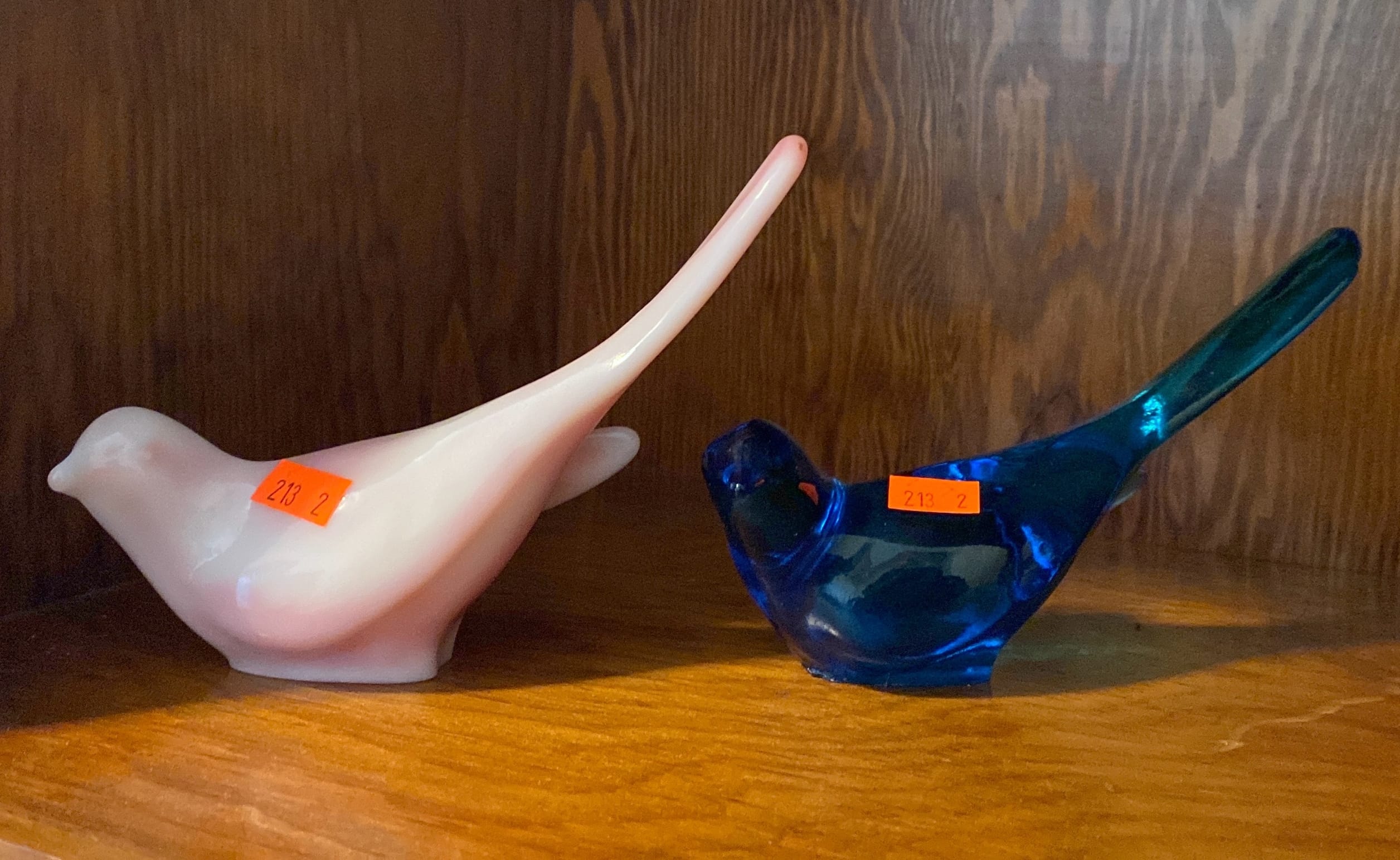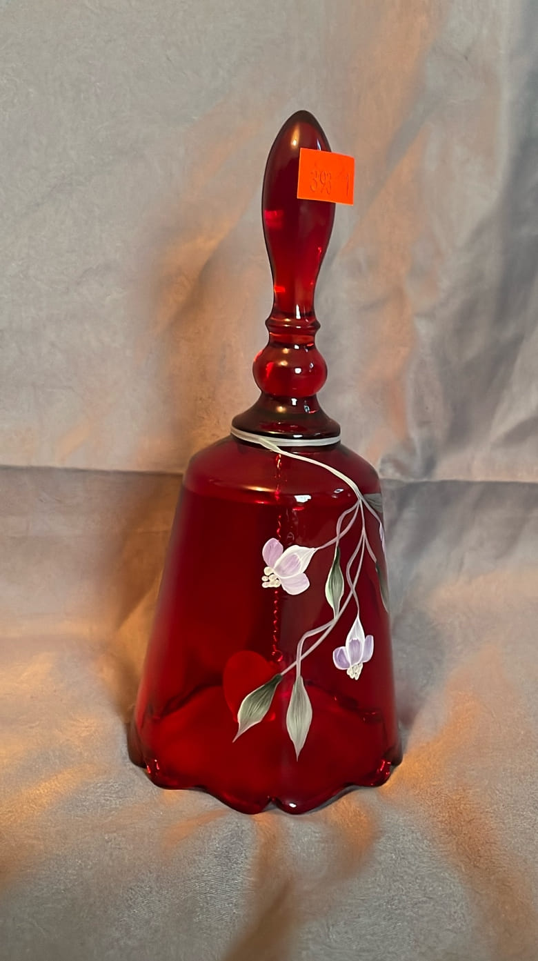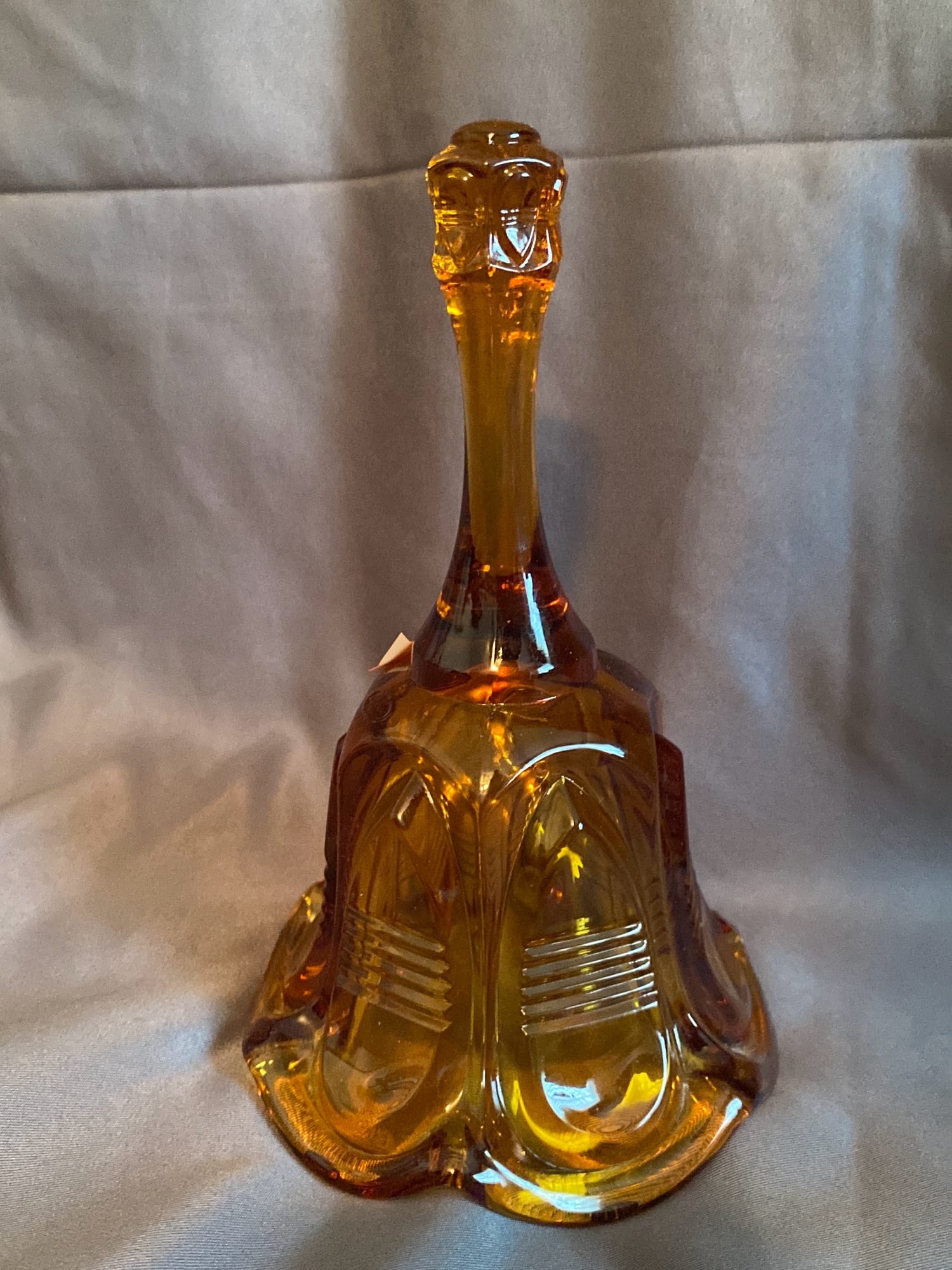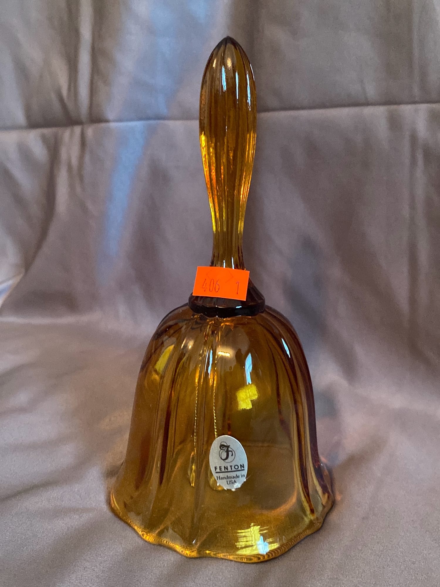 212 3 - Bells inc. pink hobnail, blue glass, green glass 5.5”, 6”