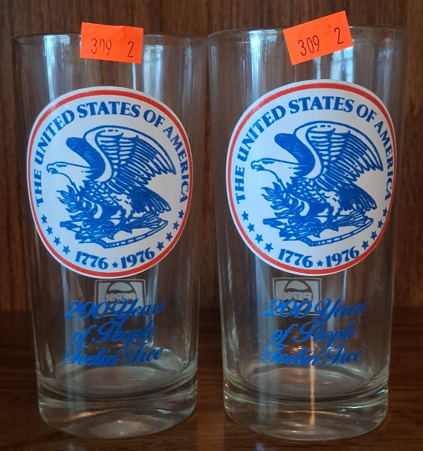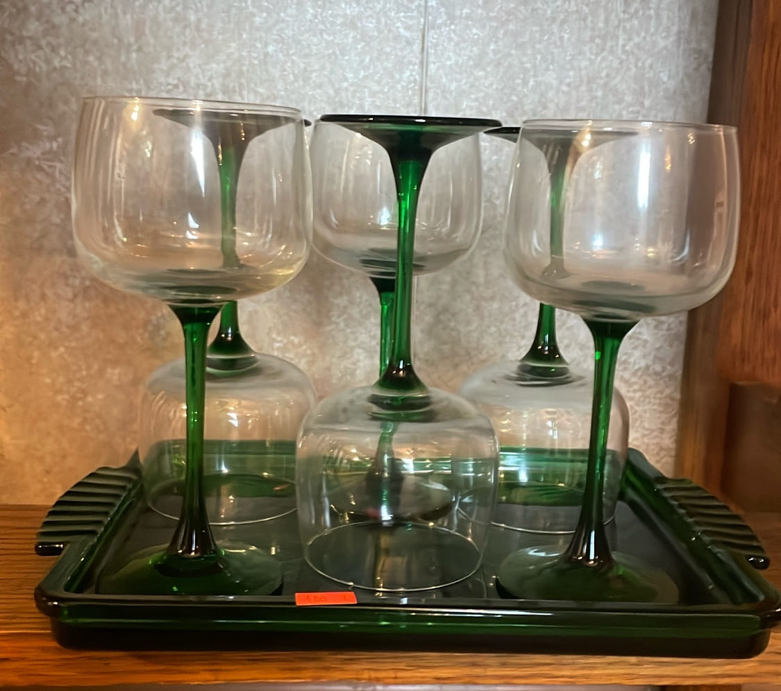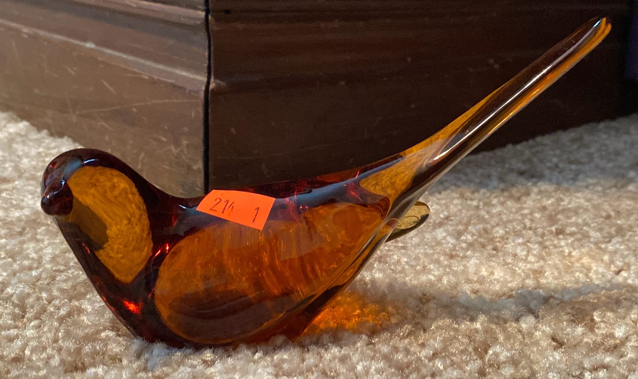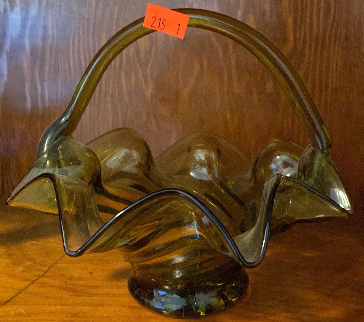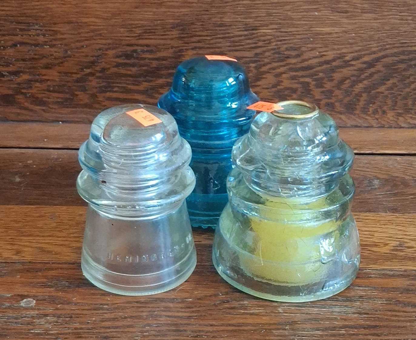 212 3 - Bells inc. pink hobnail, blue glass, green glass 5.5”, 6”