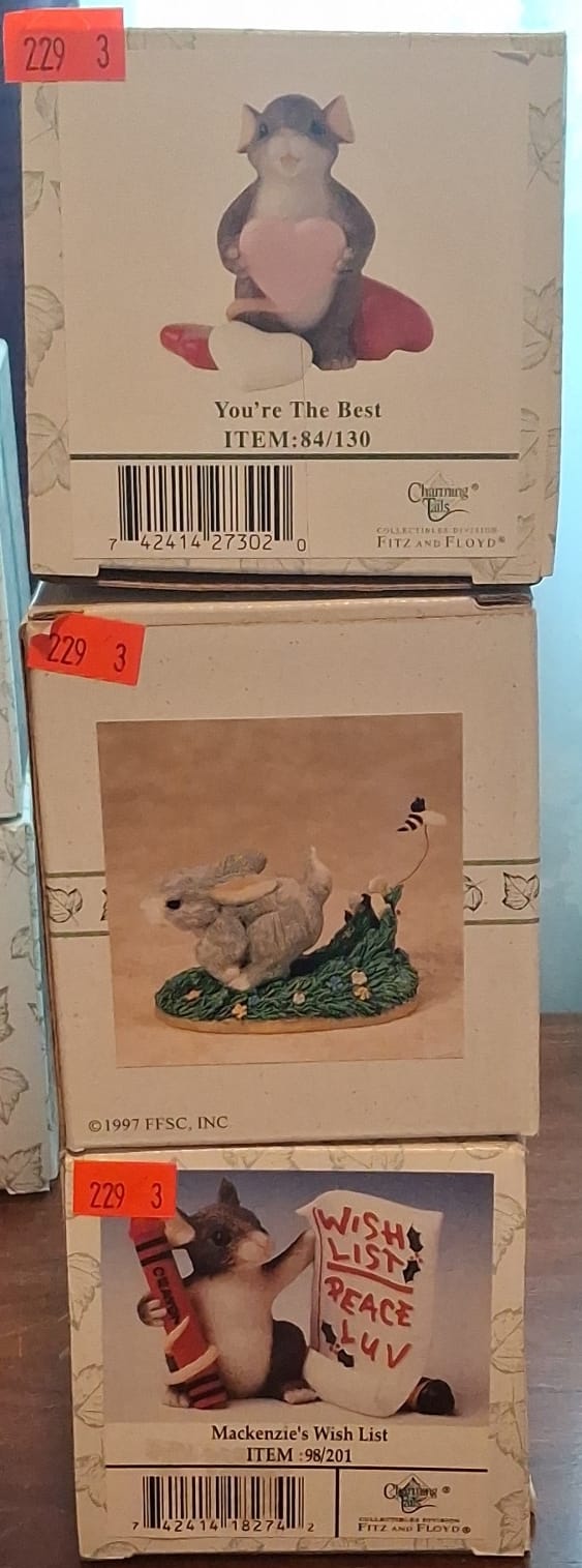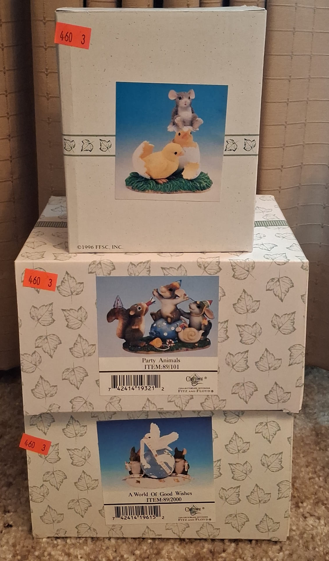 226 Fitz and Floyd Charming Tails Figurines Inc. Hangin Around, Giving Thanks & You're a Real Gem in boxes