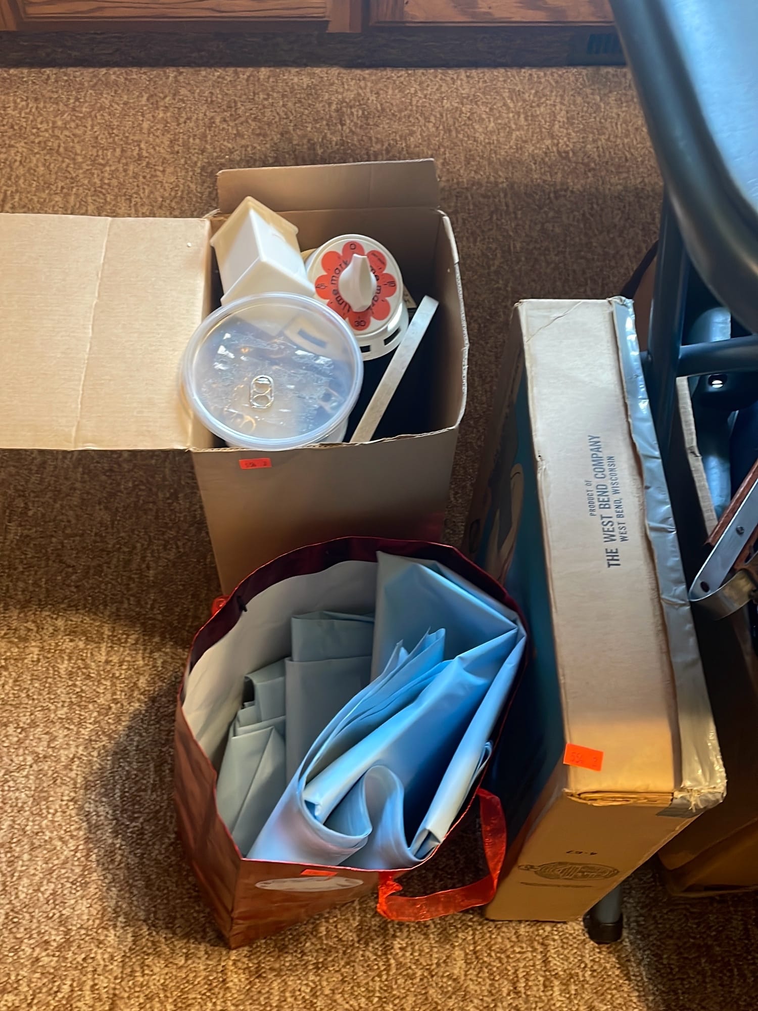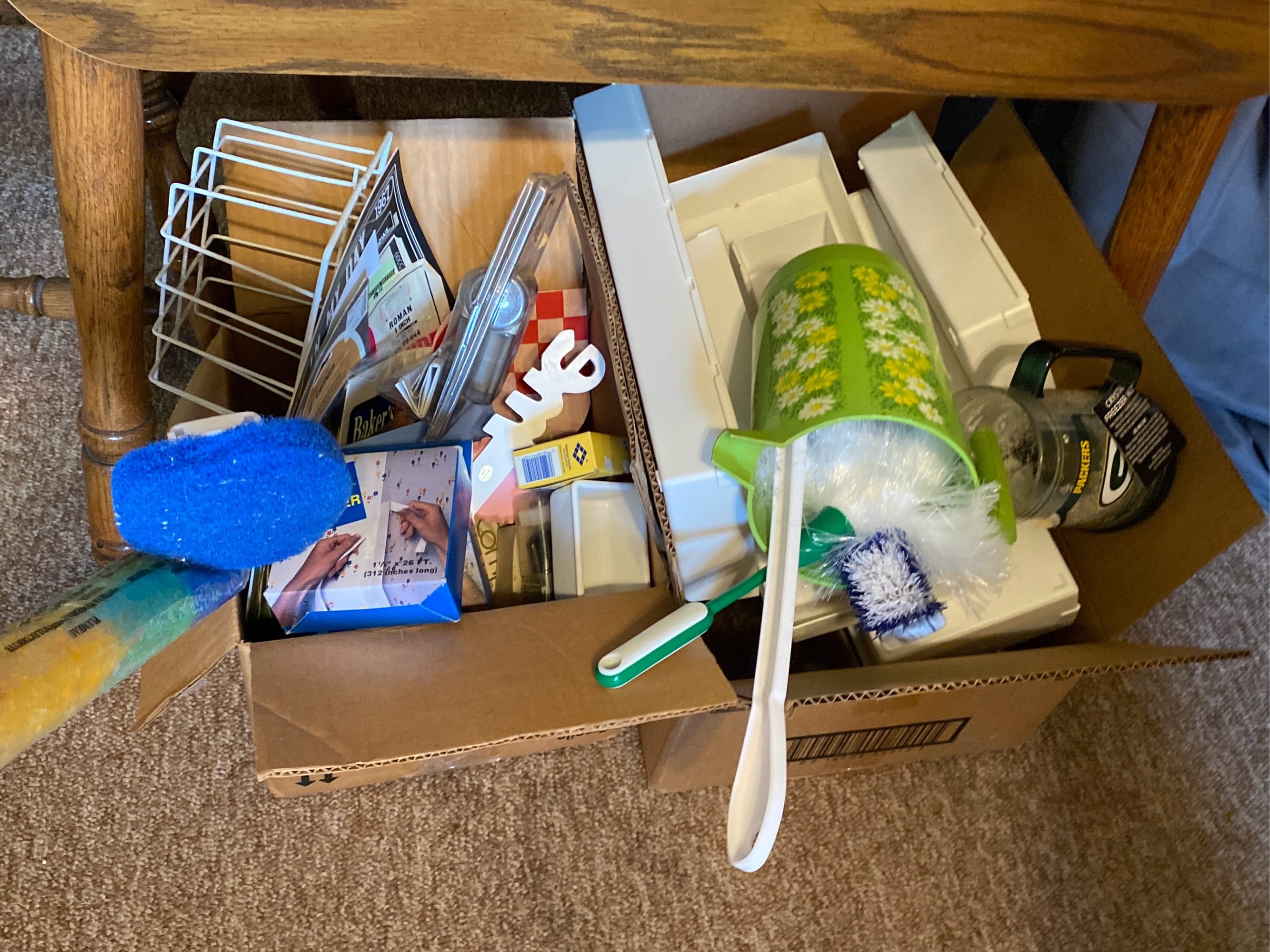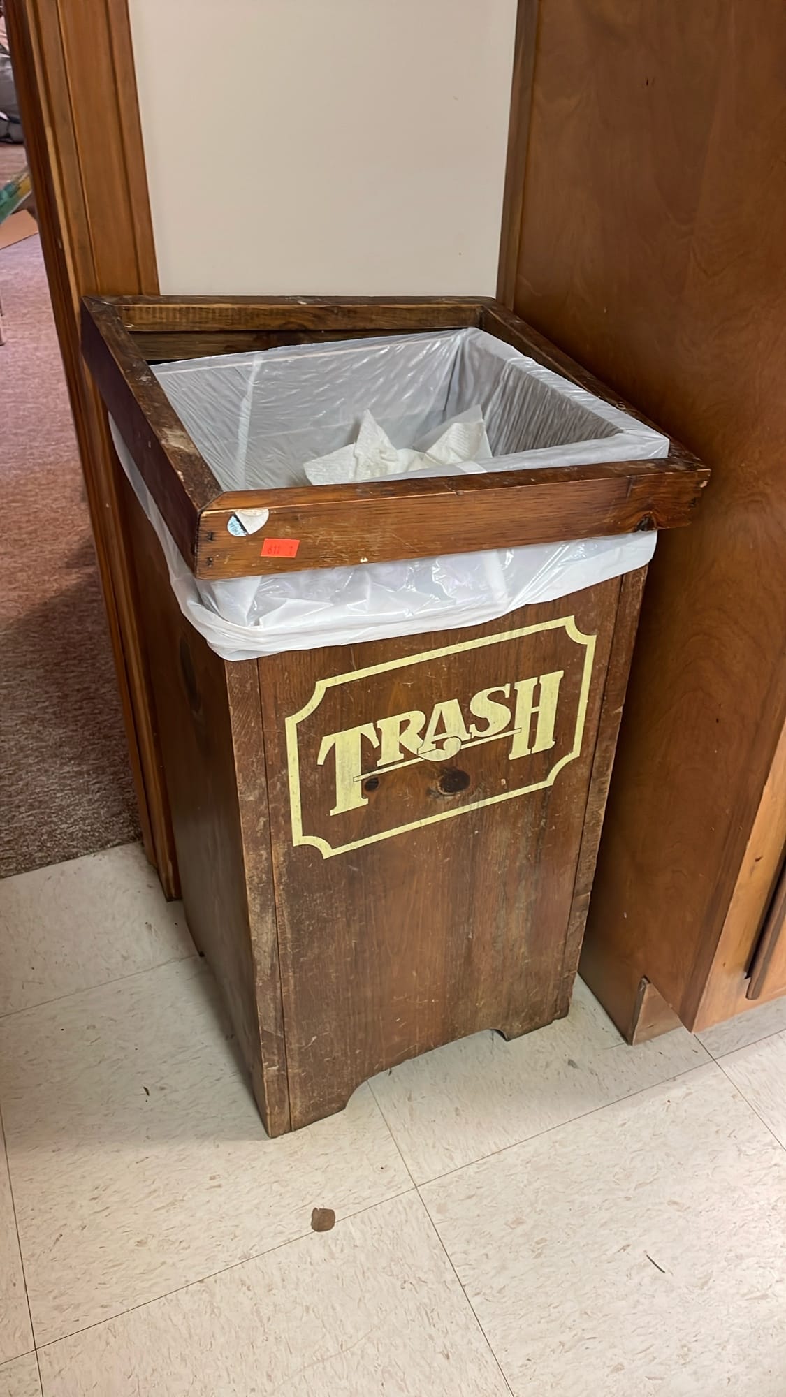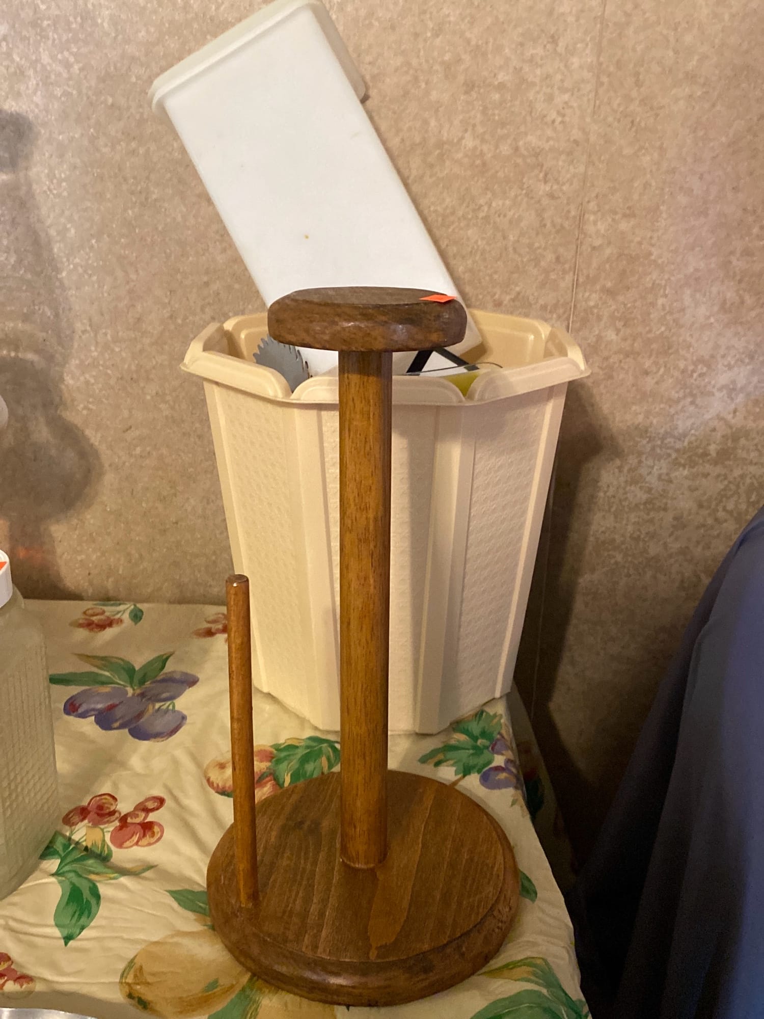 564 Paper towel holder, paintd saw blade, wastebasket, Tupperware container, misc