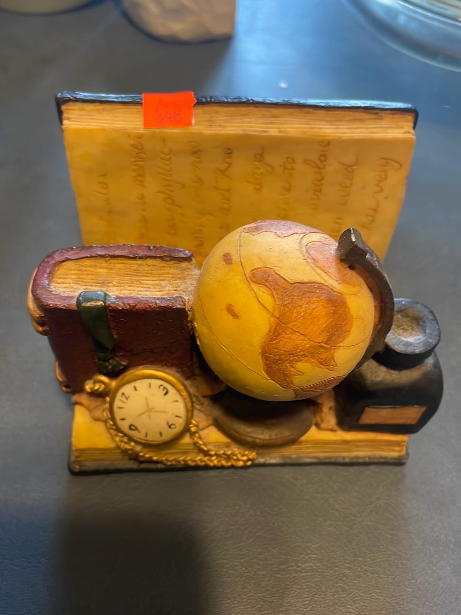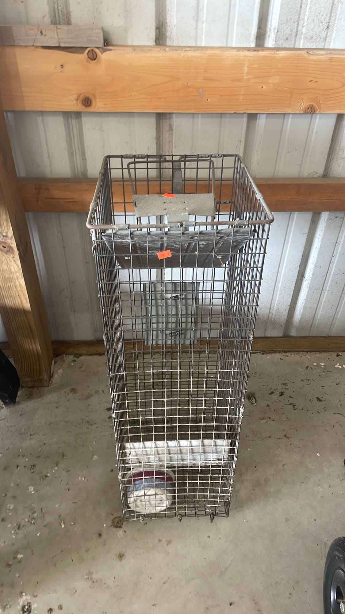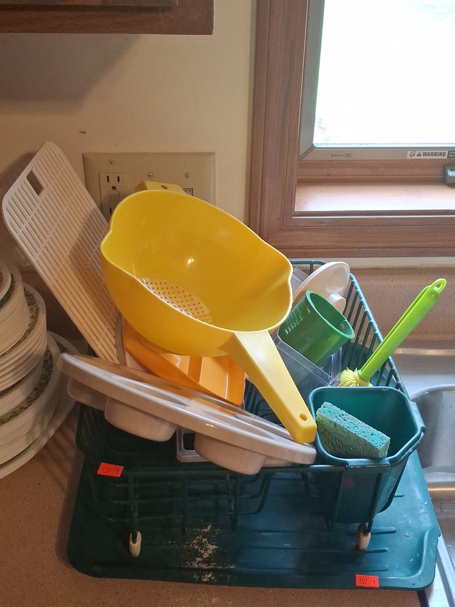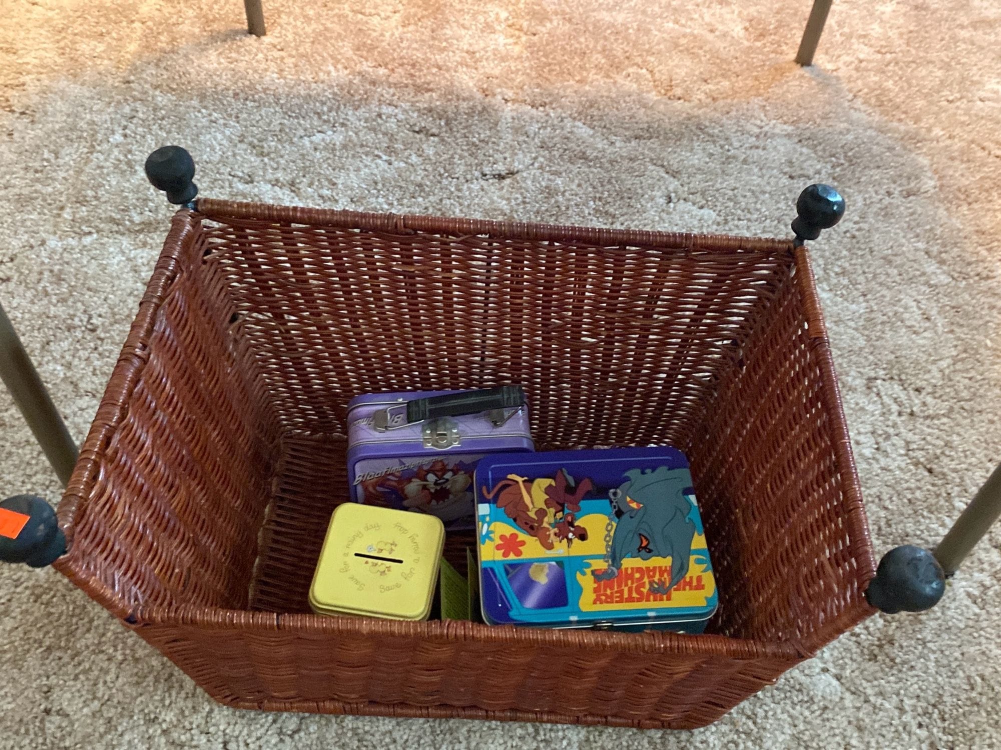 564 Paper towel holder, paintd saw blade, wastebasket, Tupperware container, misc