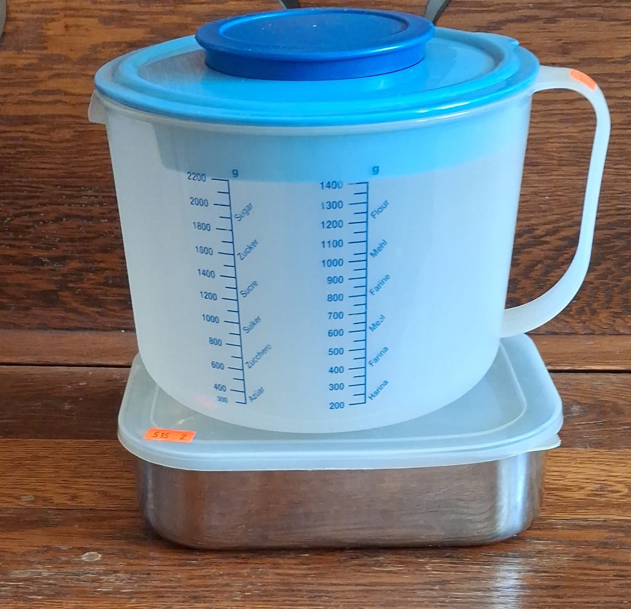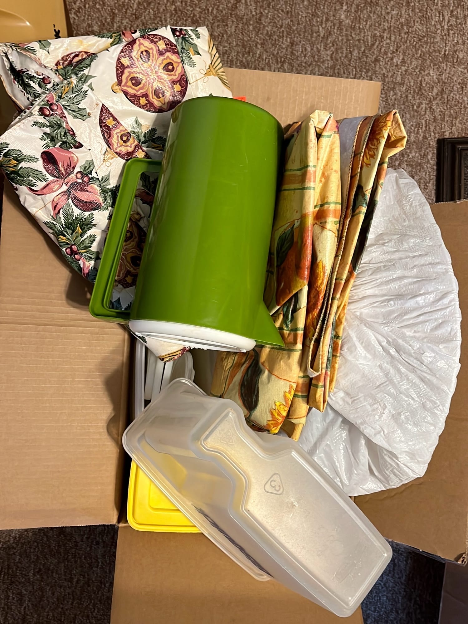 552 Bisquick Container, Table Cloth Assortment, Pitcher, Plastic Container Assortment