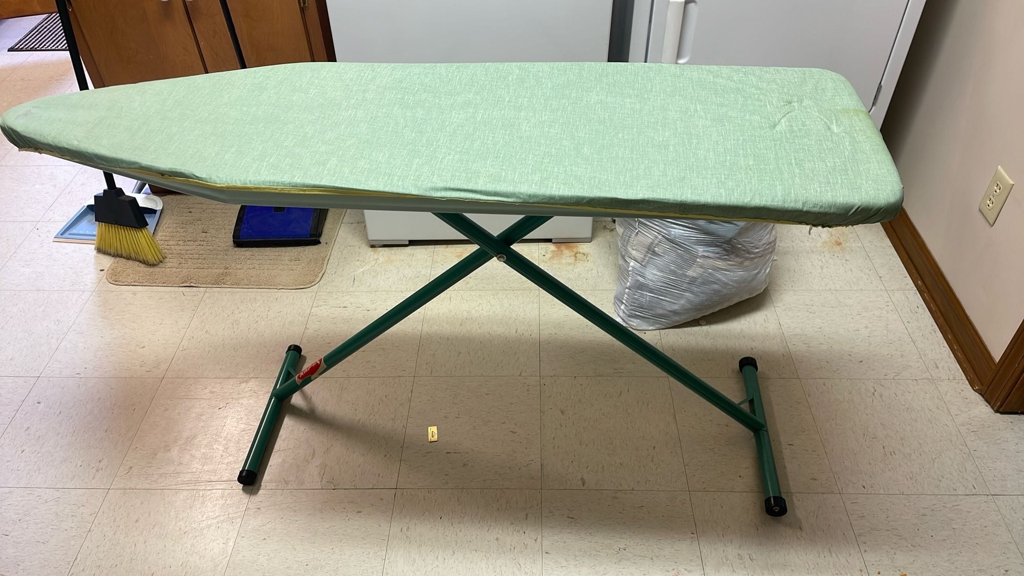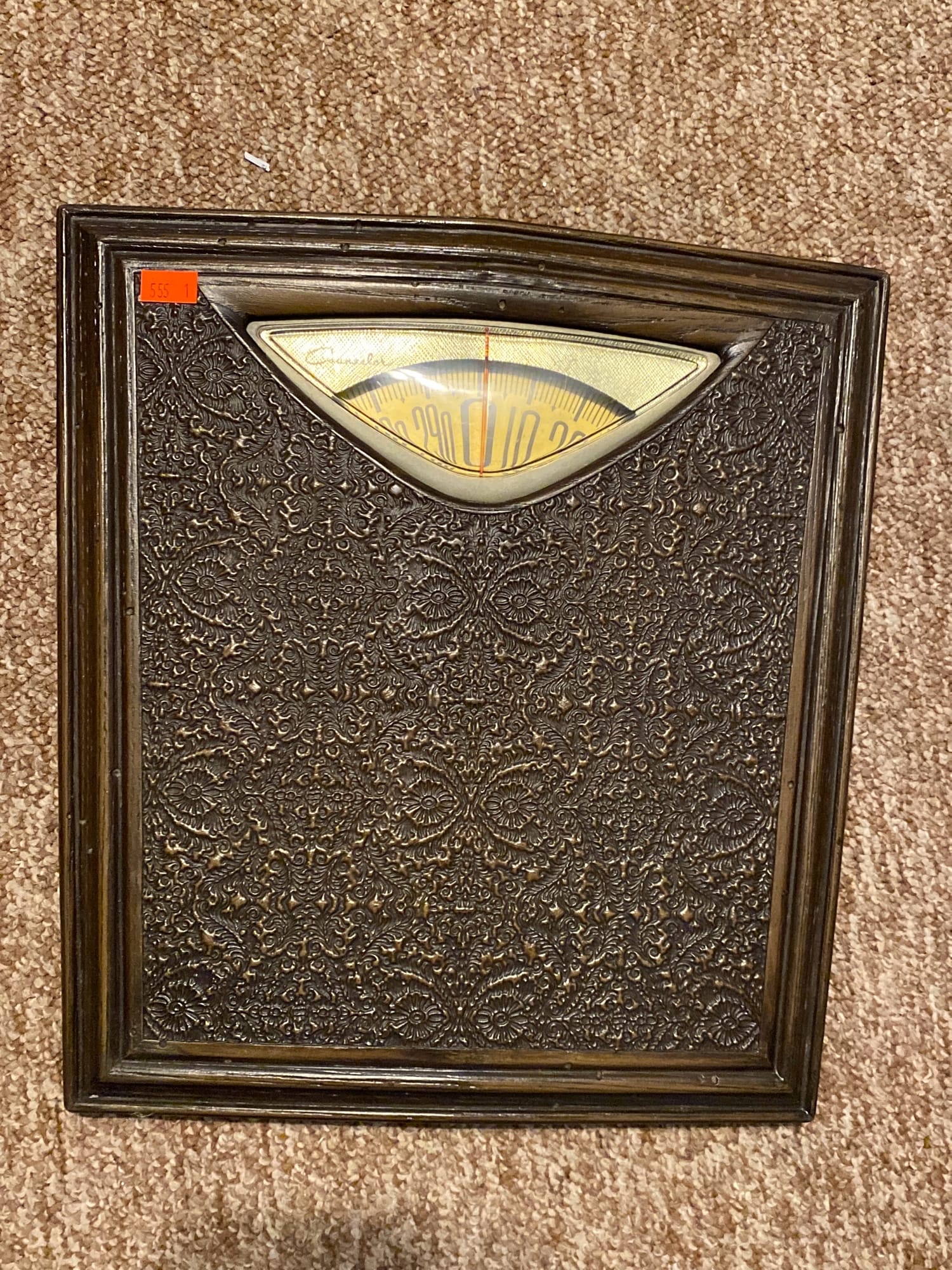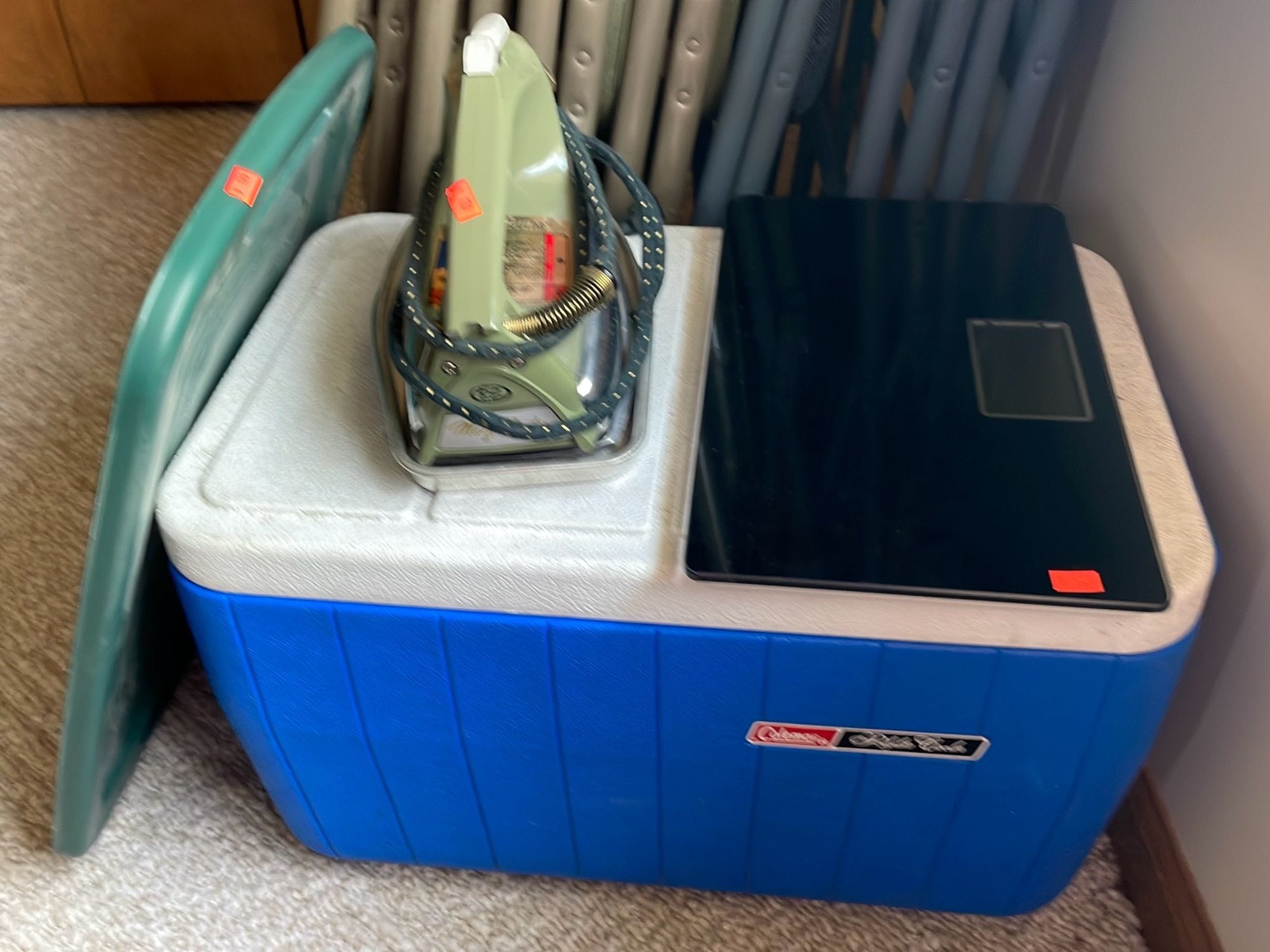 623 Coleman cooler, clothing iron with stand, bathroom scale, tote lid