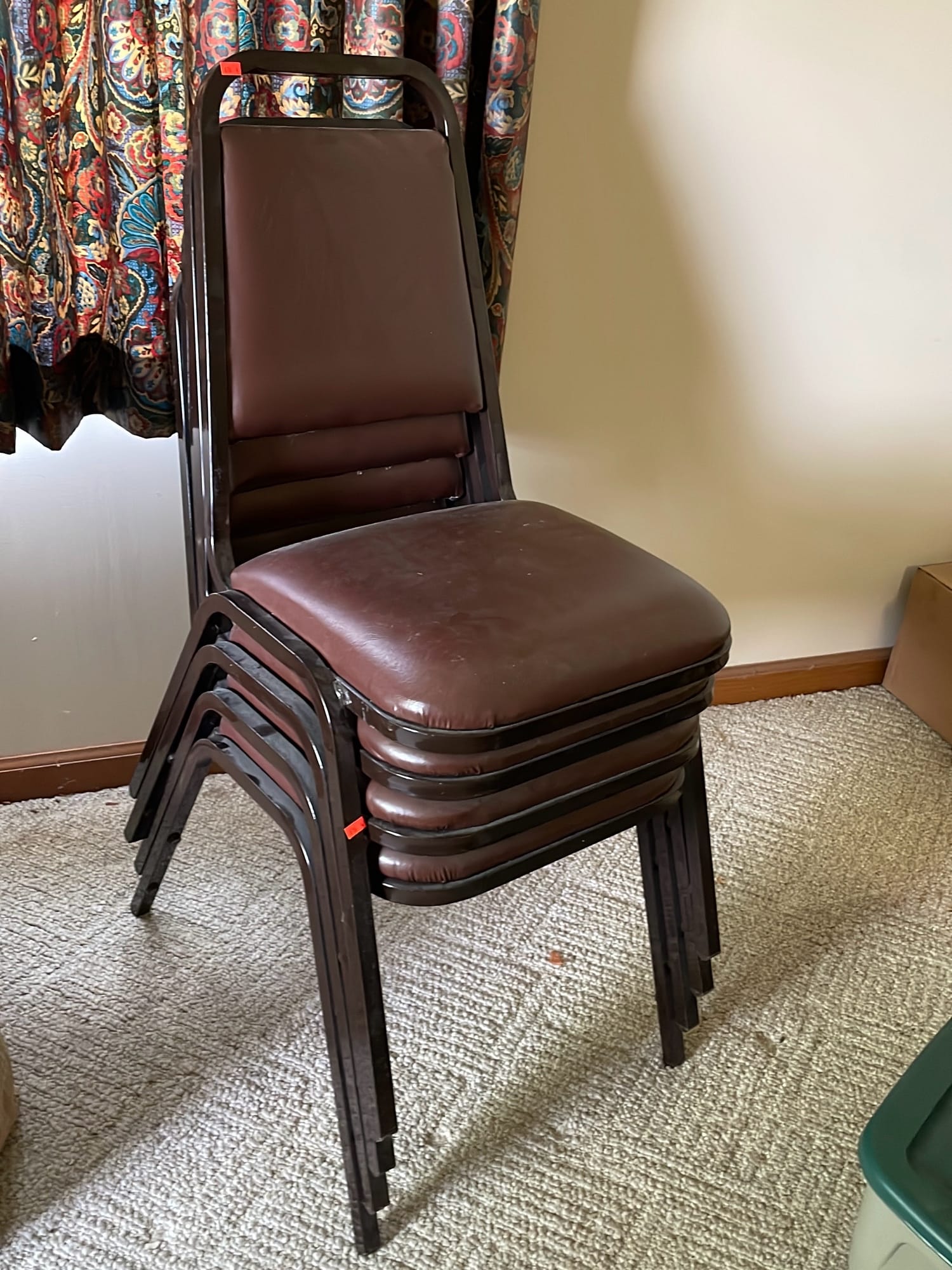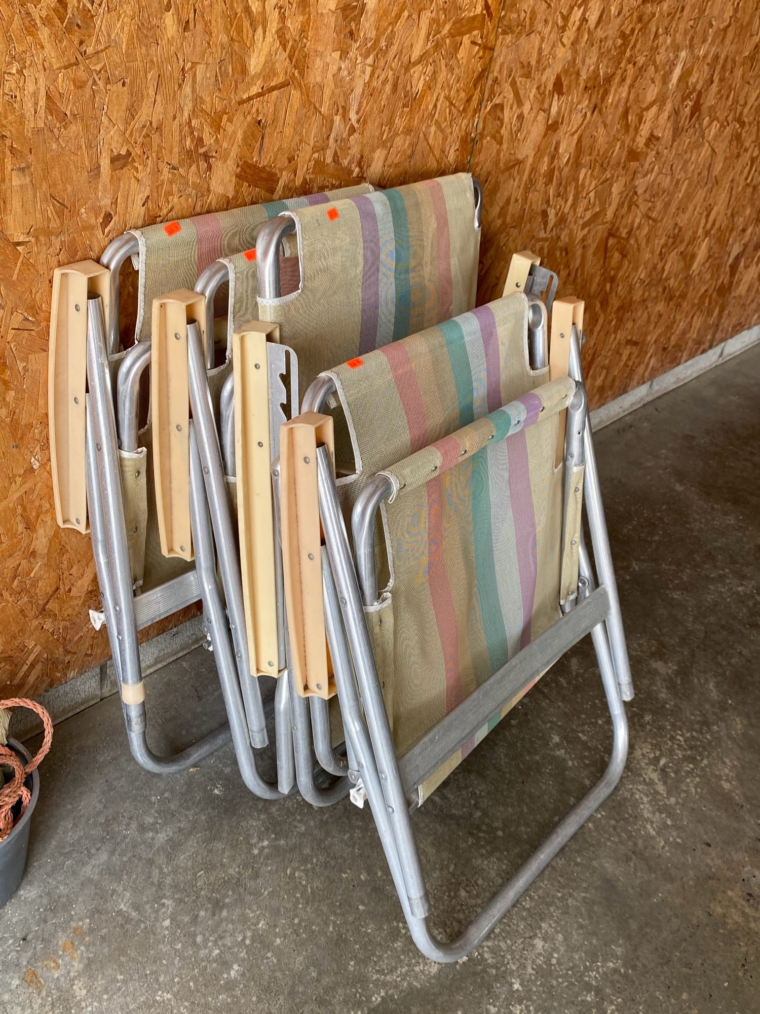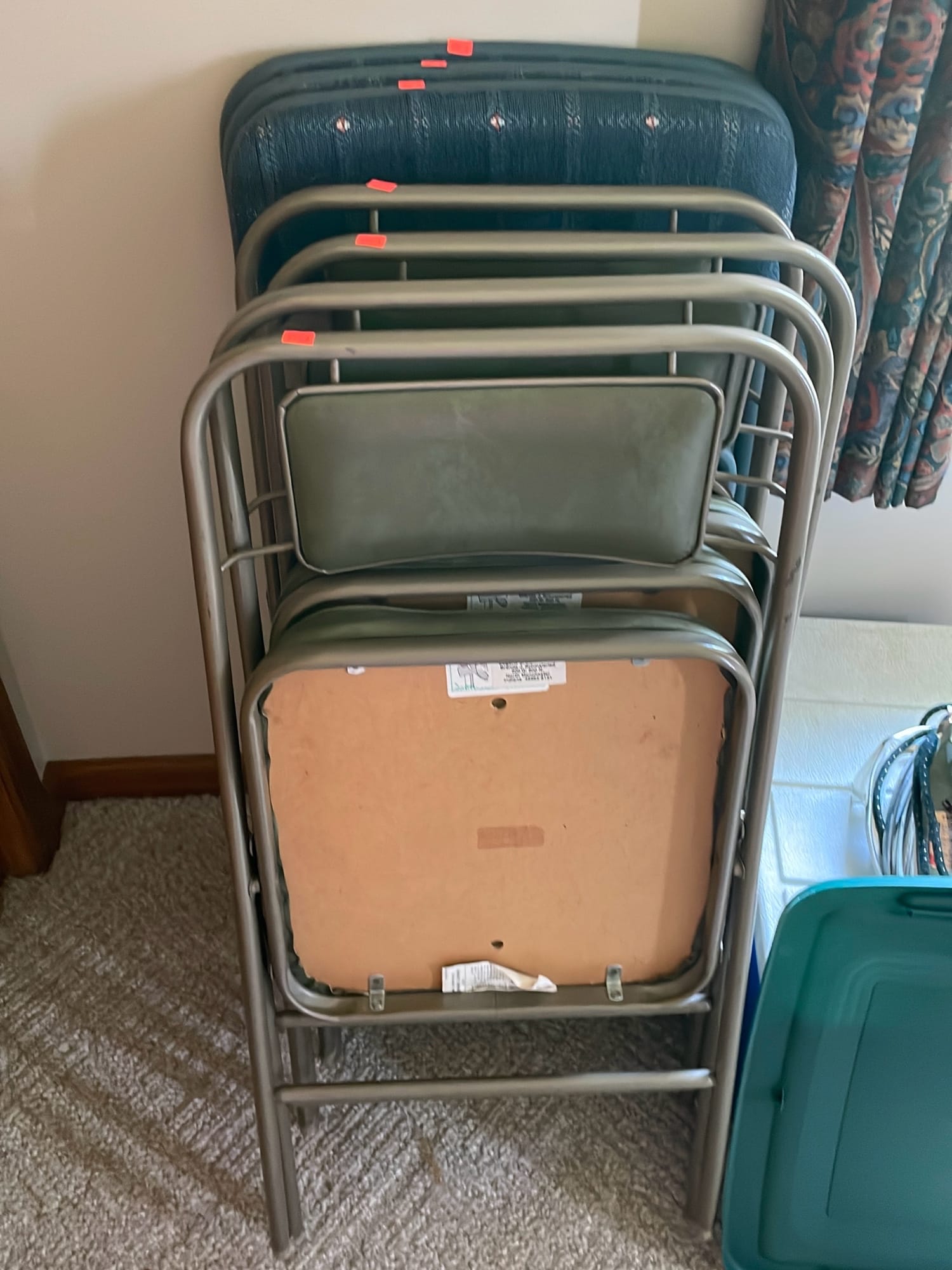 622 (4) Green vinyl folding chairs, (3) blue fabric folding chairs