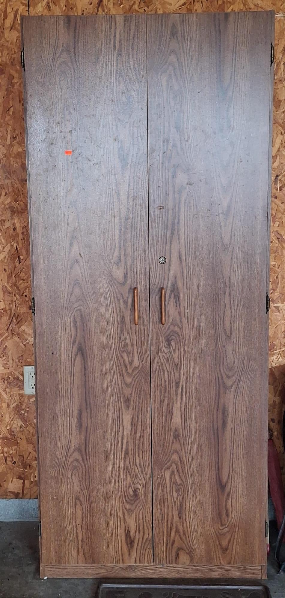 627 Wood Cabinet with Shelves and contents inc. bird feeder, planters, garbage bags, misc. 29.5" x 71" x 16"