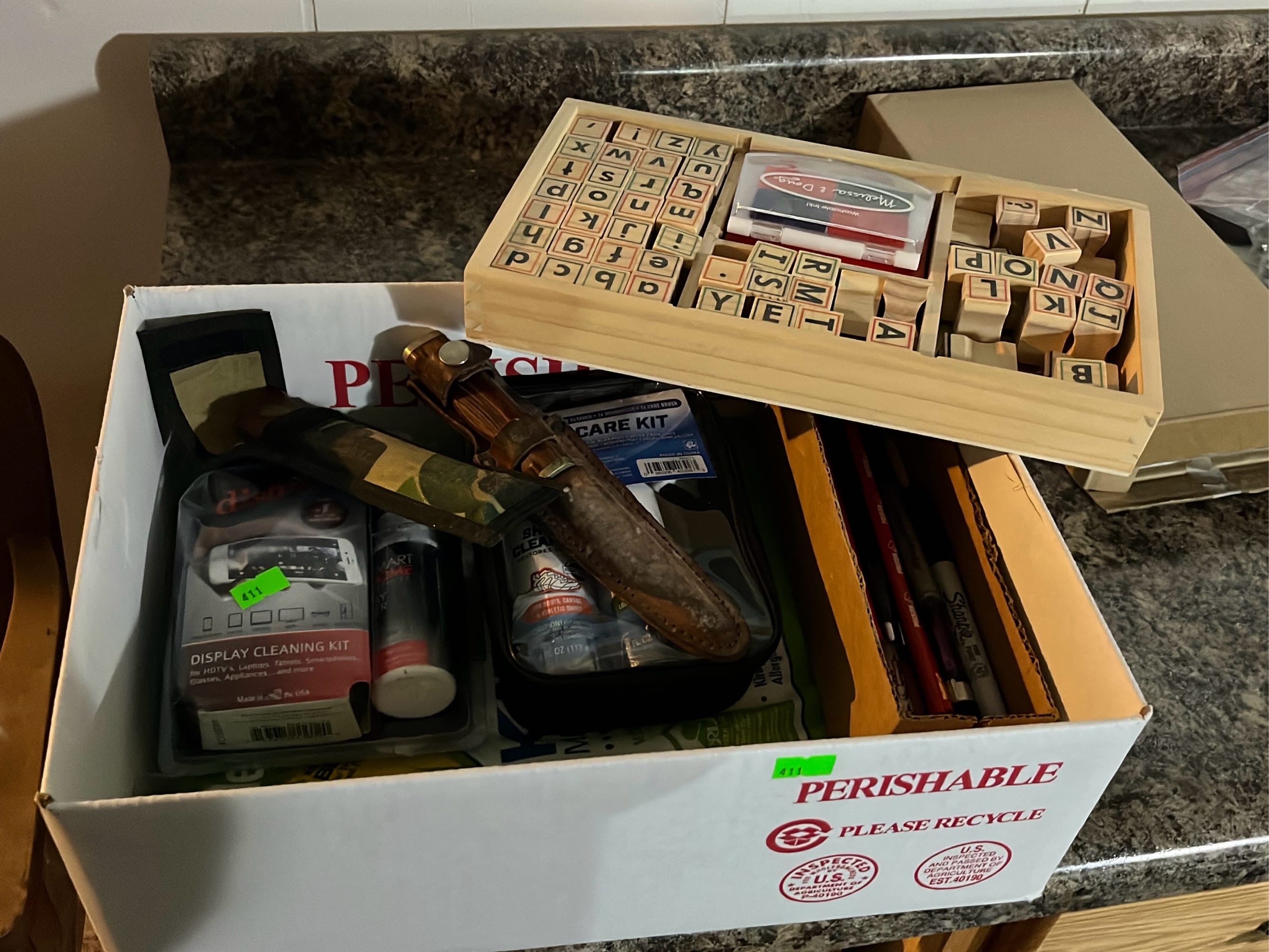411 Wood stamps, display cleaning kit, stainless hunting knife, air filters, knife, pens, pencils