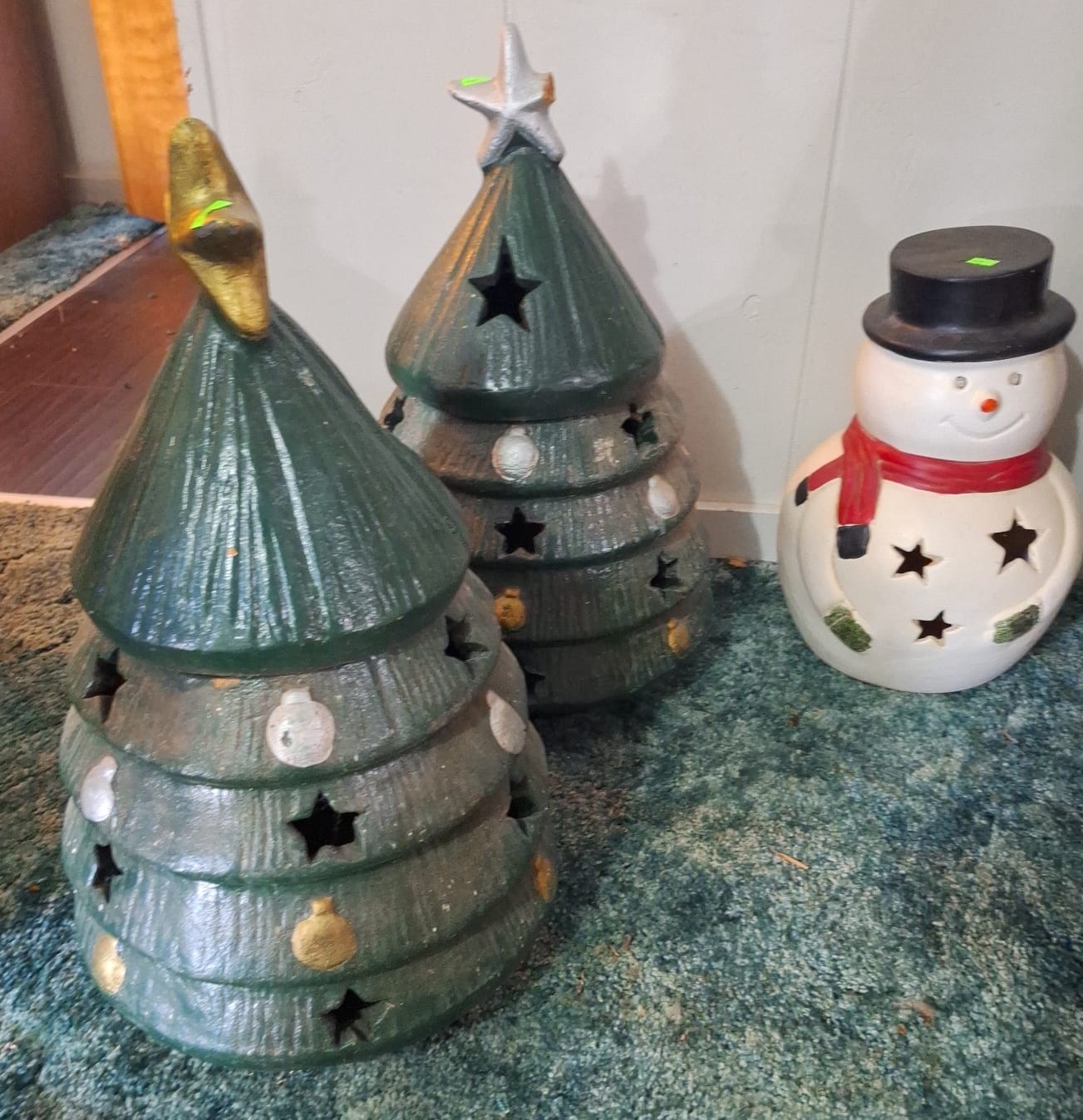 420 Ceramic snowman 16” & (2) Christmas trees 23” - damaged