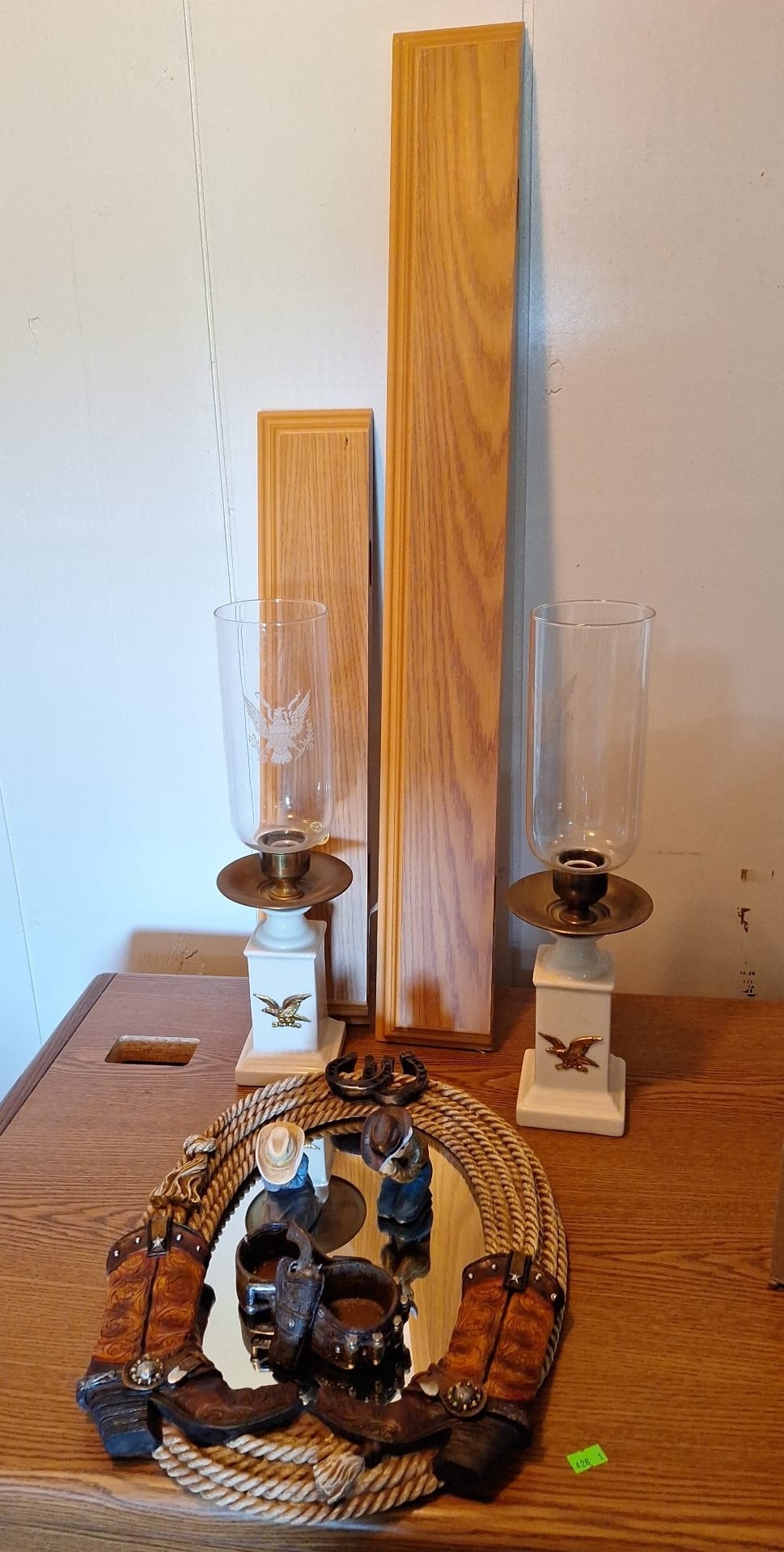 427 2- Shelves 24&36", 2- Candle holders, Western decor, ppl figures - damaged