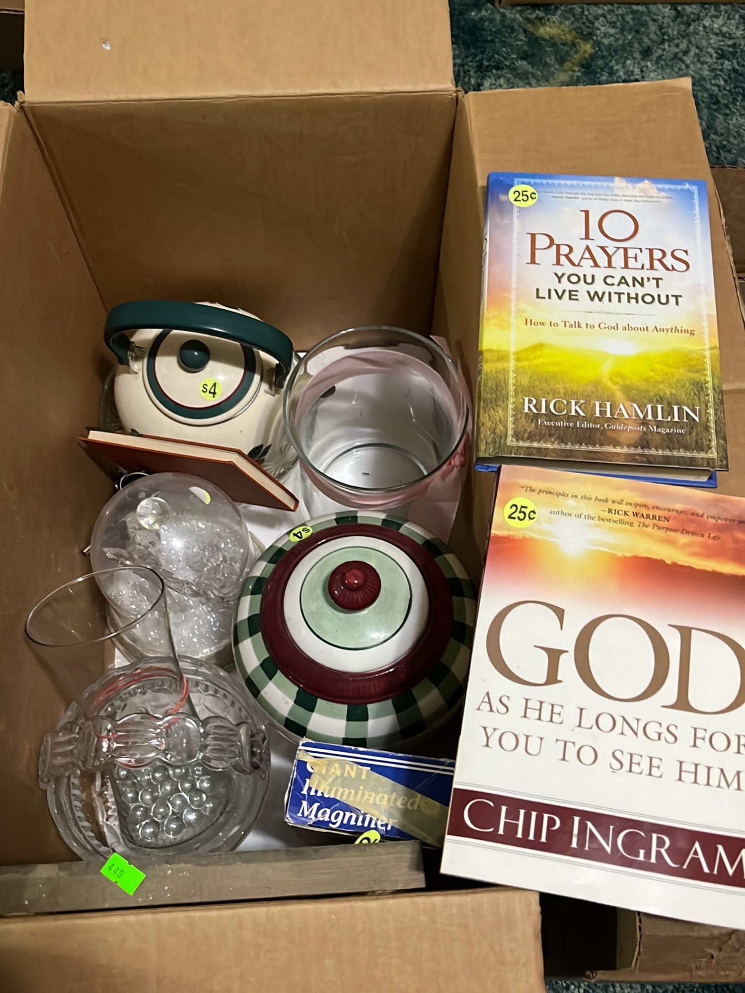 449 Cookie jar, tea kettle, vase, glass basket, religious books