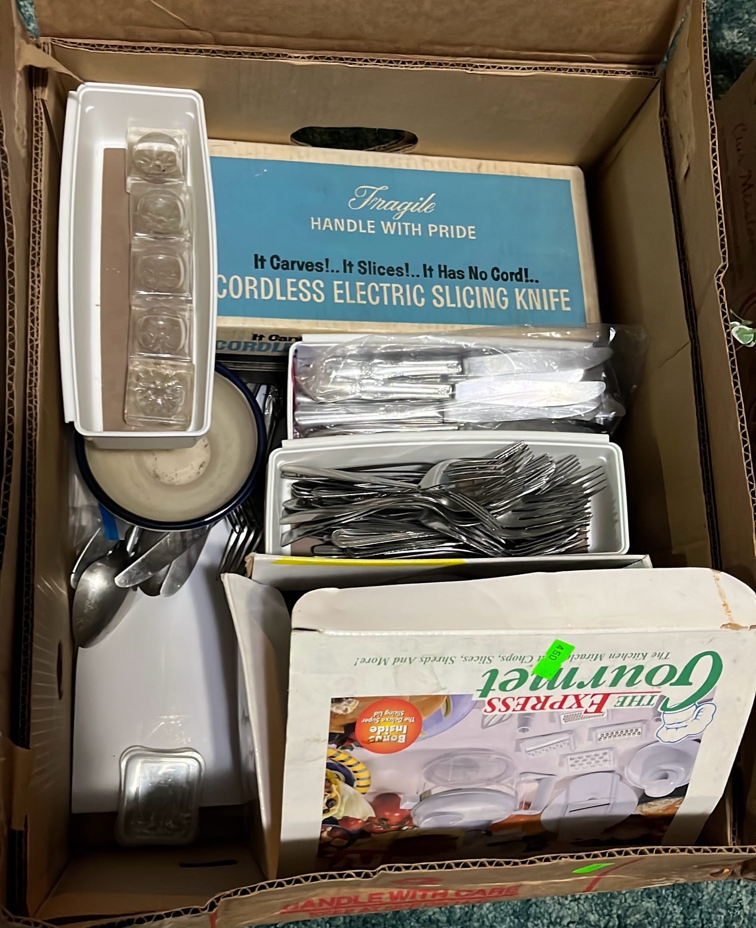 450 Flatware, food processor, cordless electric slicing knife, misc. kitchen items